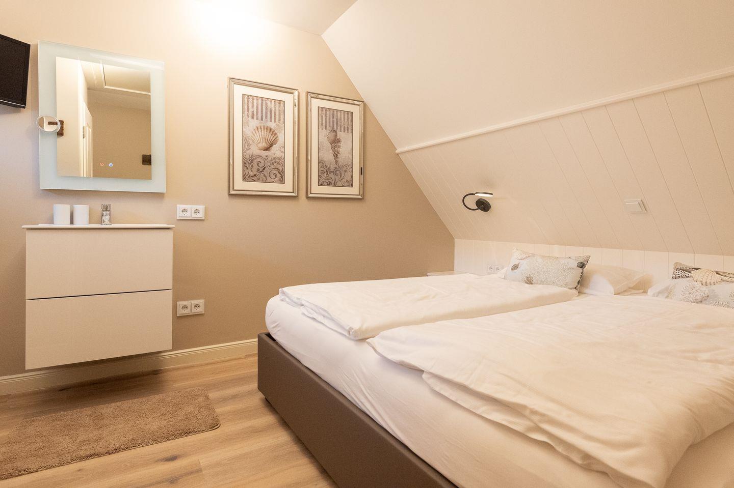 Schlafzimmer 2: Gemütliches Doppelbett, Einbauschränke, TV und sep. Waschbecken mit Spiegel.