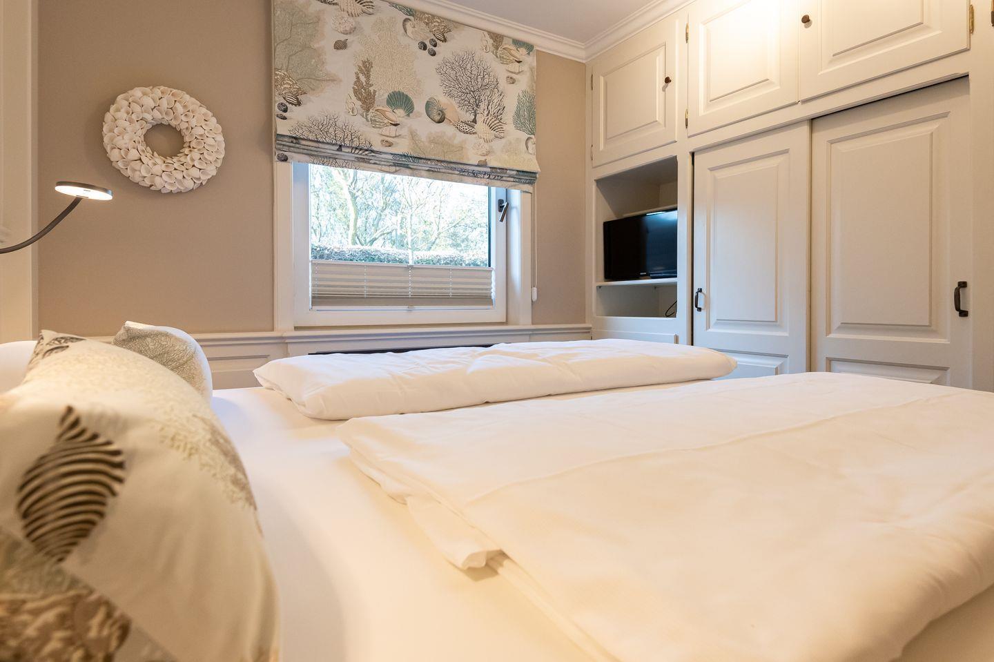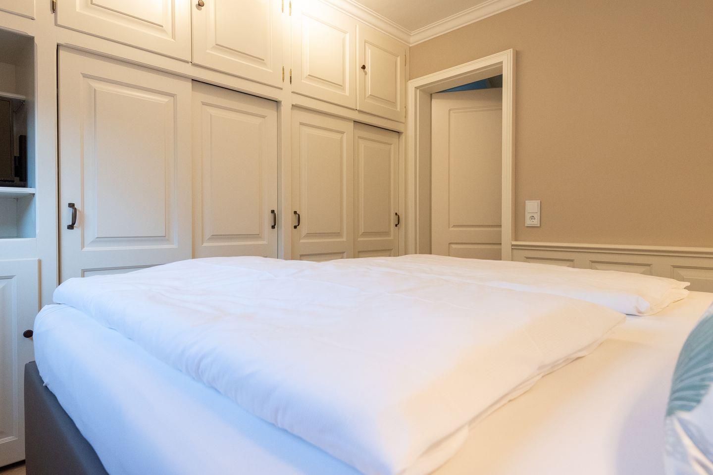 Schlafzimmer 1: Helles Doppelbettschlafzimmer mit Einbauschränken und TV.