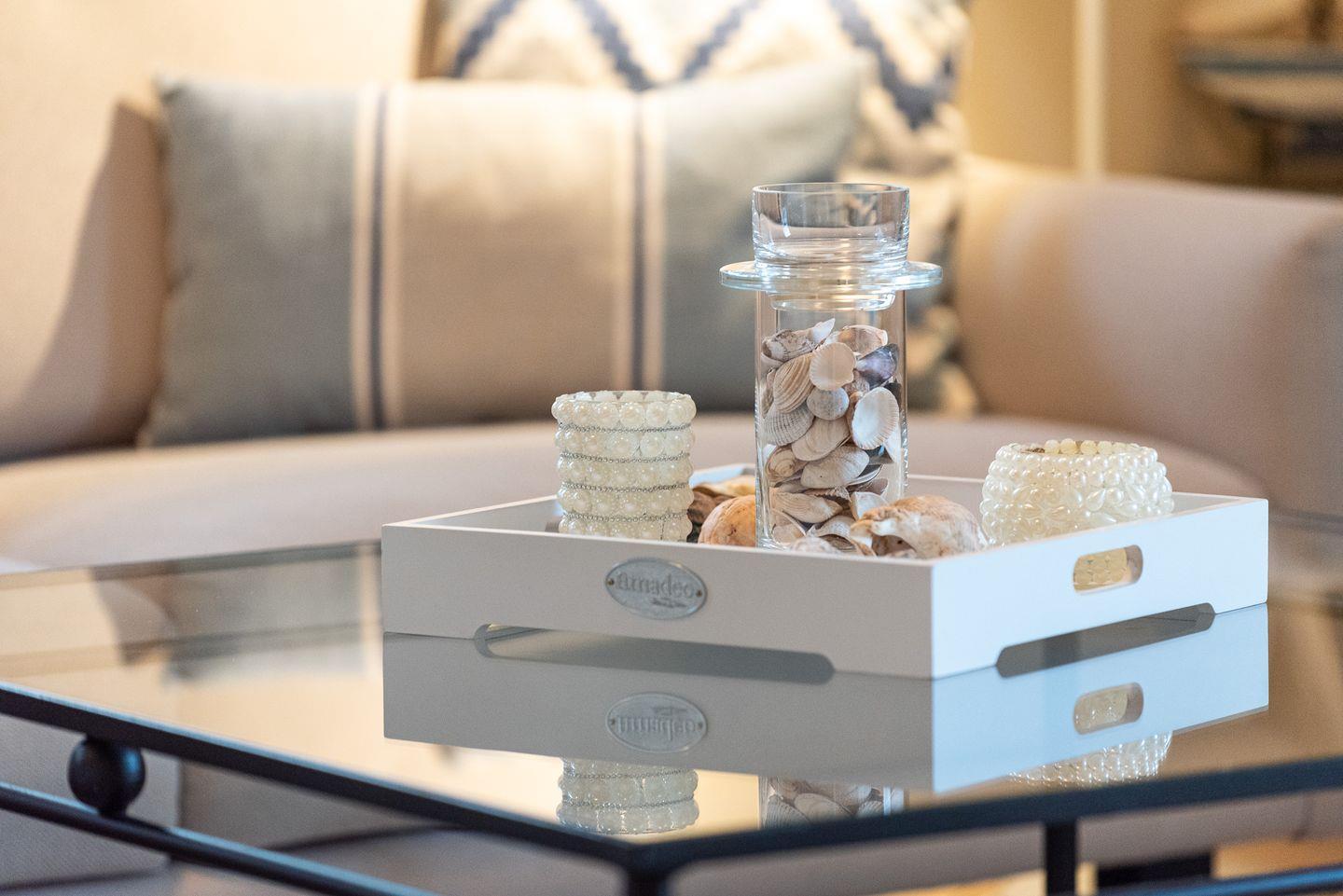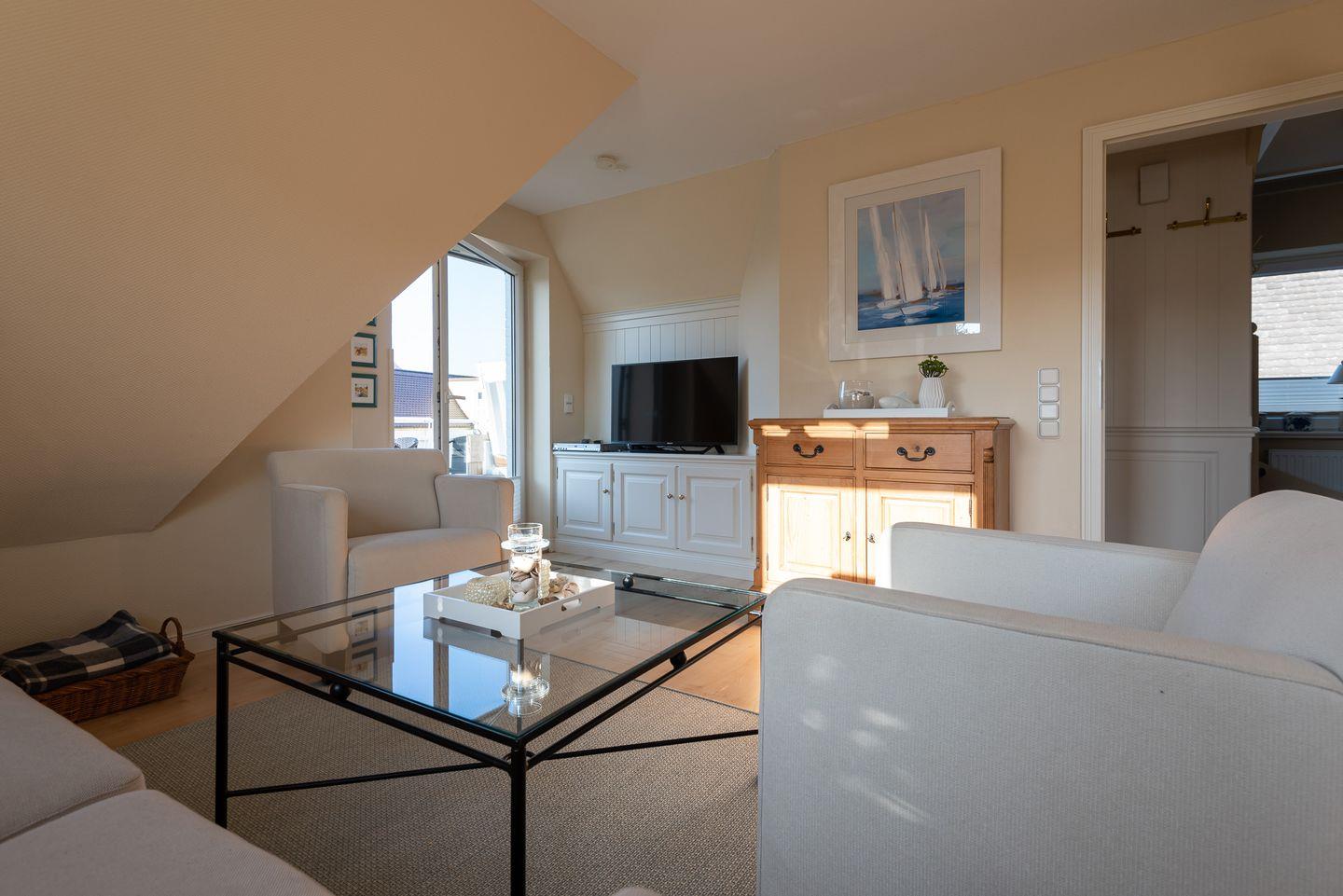 Koch-/Wohn-/Essbereich: Heller Wohnbereich mit gemütlichen Polstermöbeln sowie einem gemütlichen Essbereich für 4 Personen, welche perfekt an die offenen und gut ausgestattete Küche angrenzt. Vom Wohnbereich gelangen Sie ebenfalls auf den Südwest-Balkon mit Balkonmöbeln und Strandkorb.