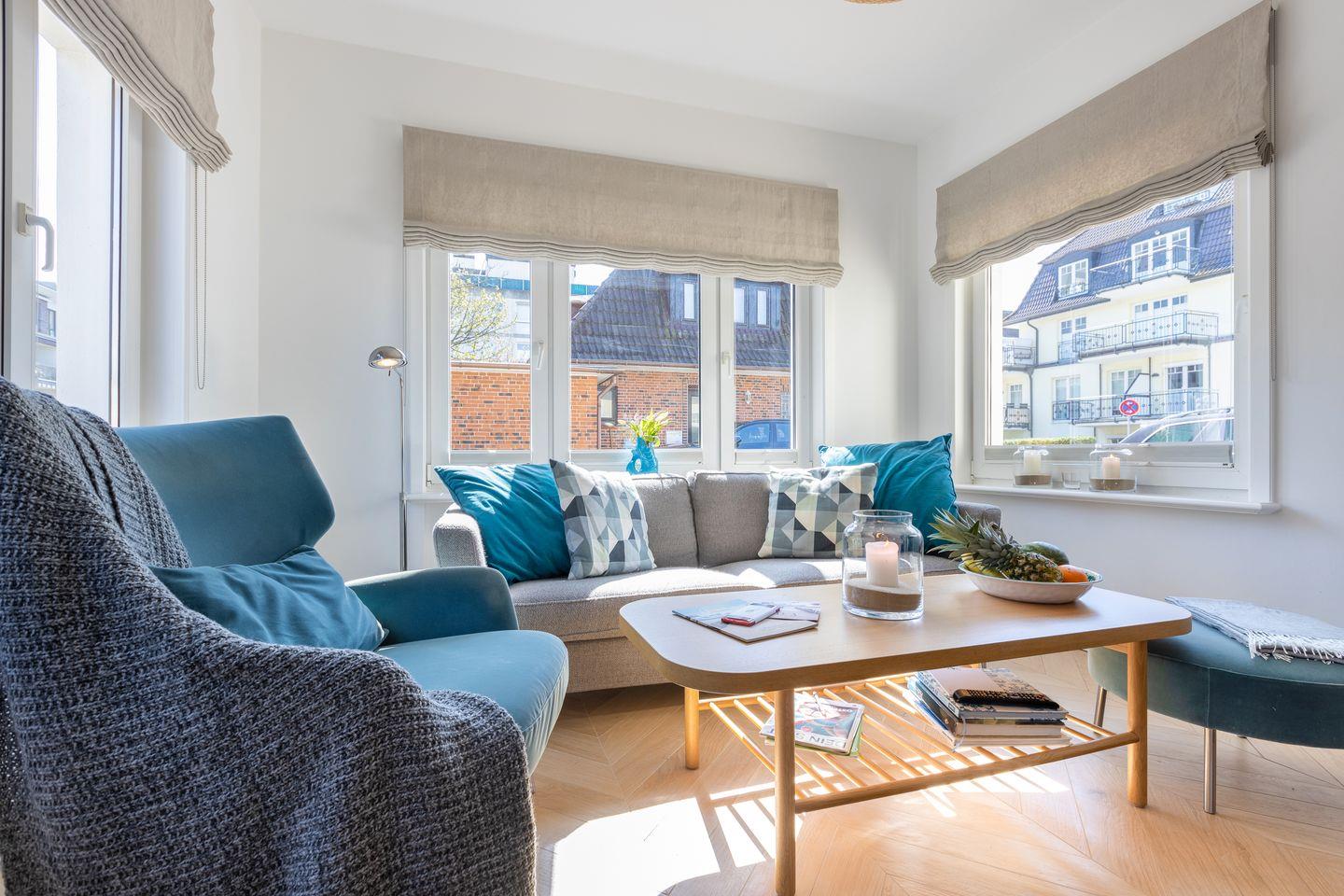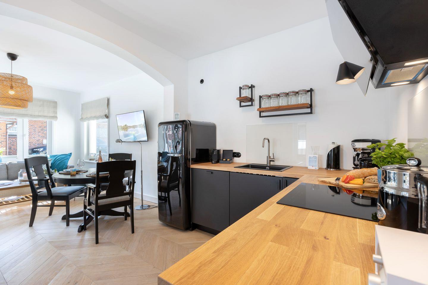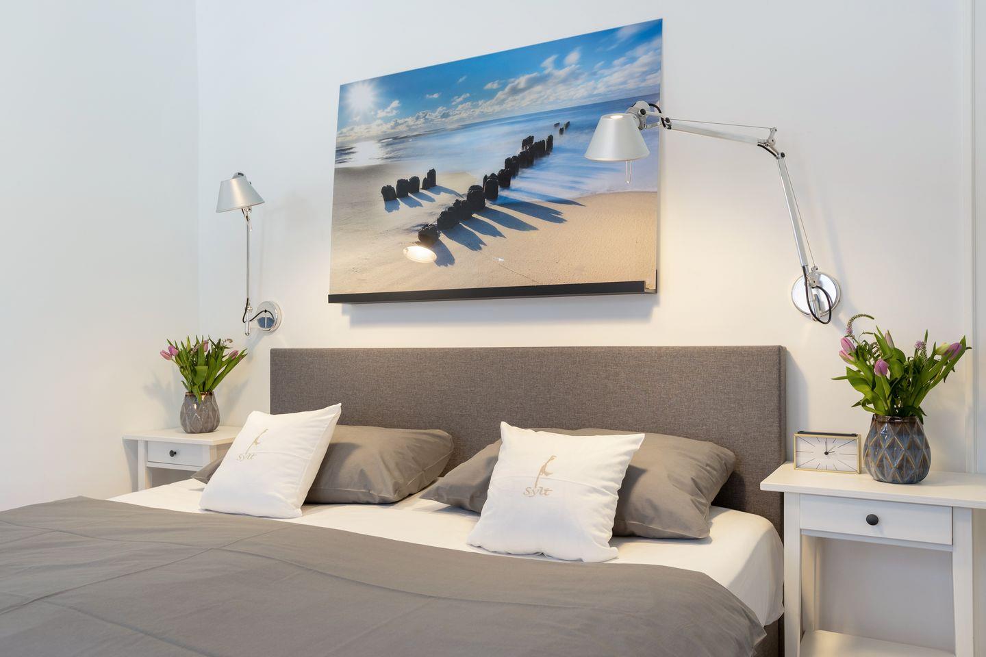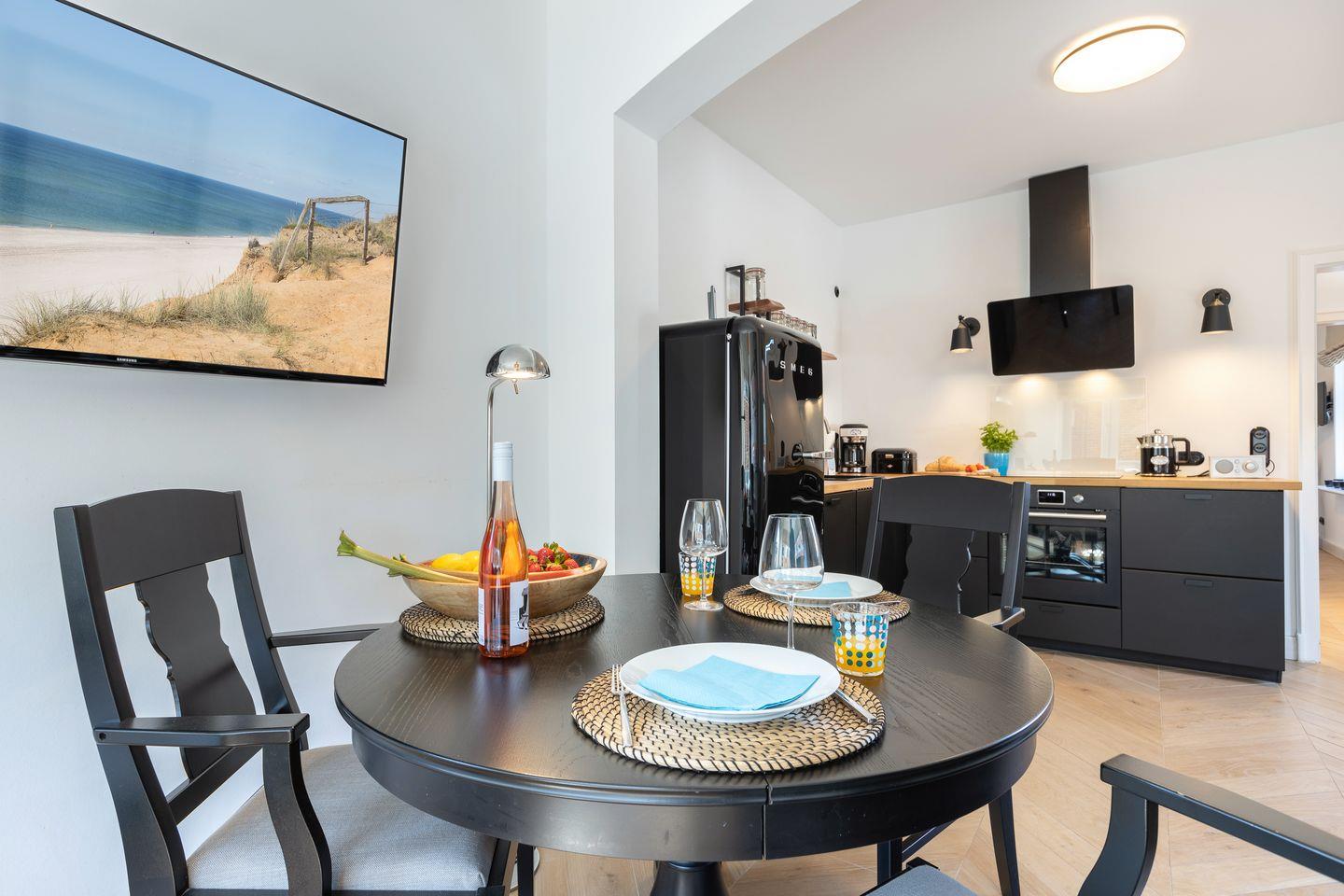 Bei der Einrichtung von Achtern wurde besonderen Wert auf geschmackvolles und bequemes Mobiliar gelegt, es gibt ein großes Boxspringbett, ein gemütliches Wohnzimmer, einen Esstisch und eine perfekt eingerichtete Küche mit Spülmaschine, Backofen und einem geräumigen Kühlschrank.