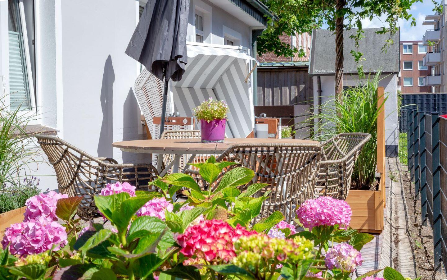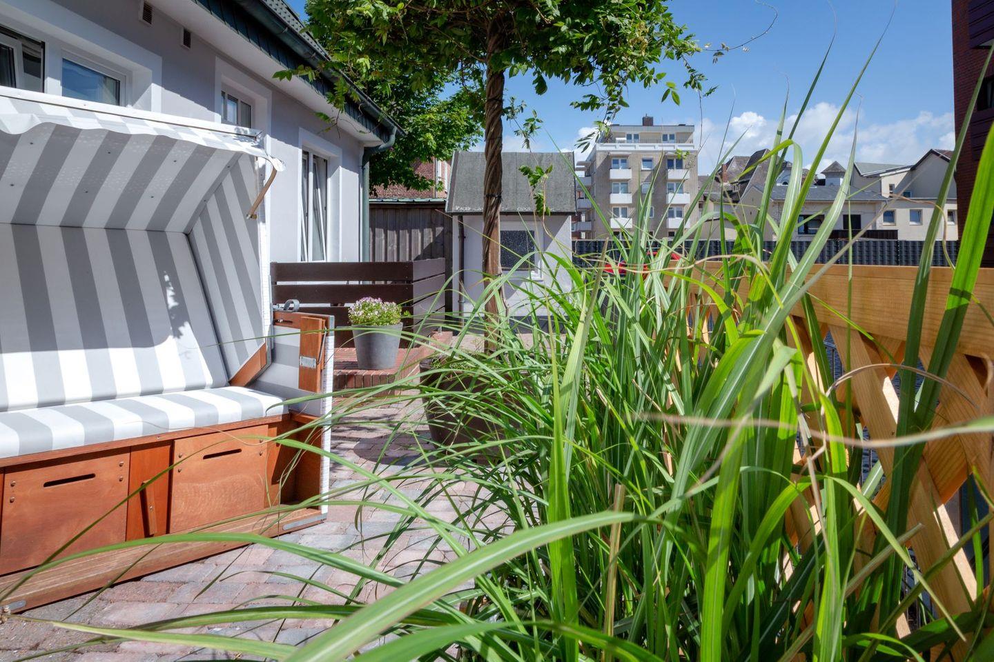 Zur Wohnung gehört im Außenbereich eine Terrasse mit Strandkorb und eine Essecke.