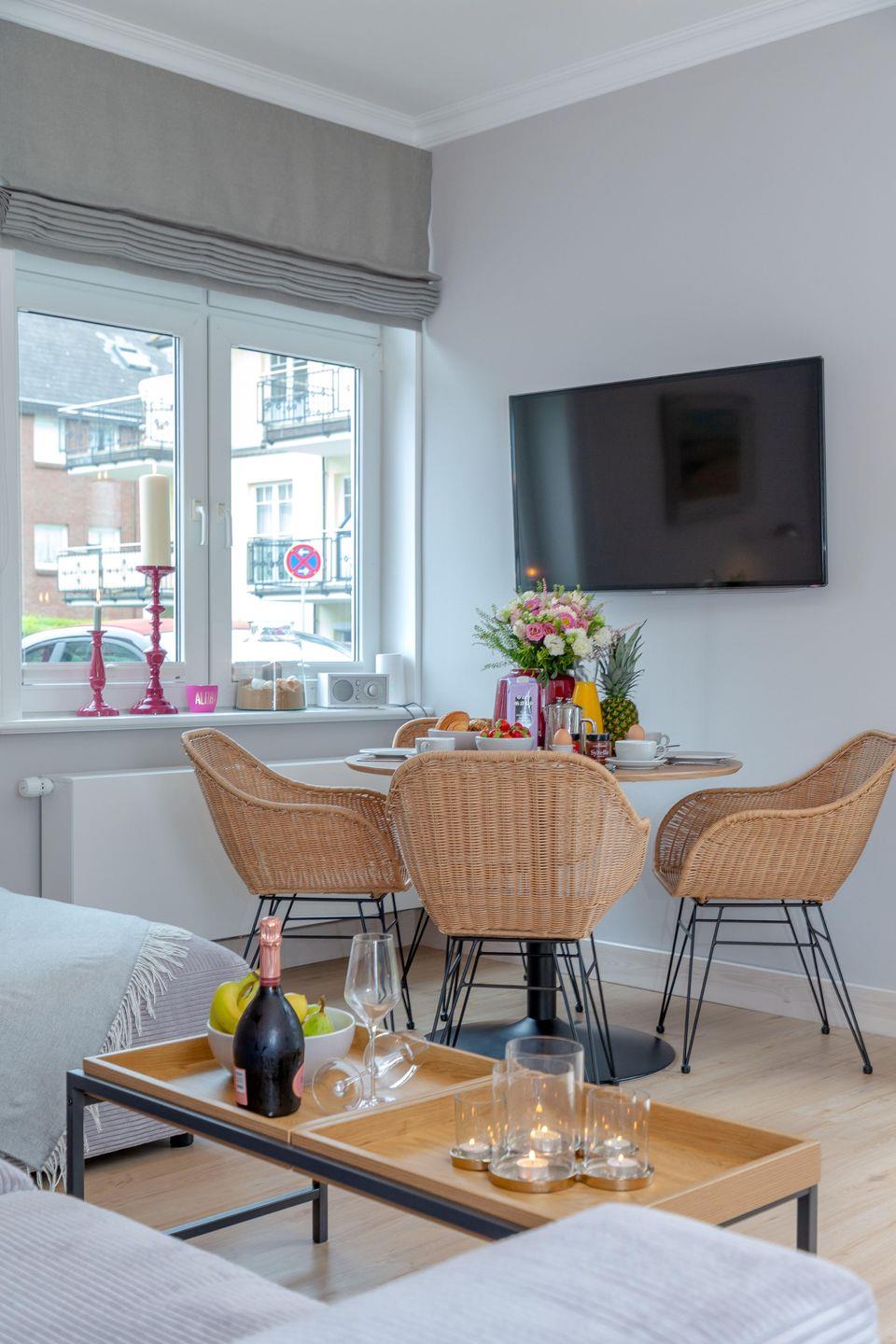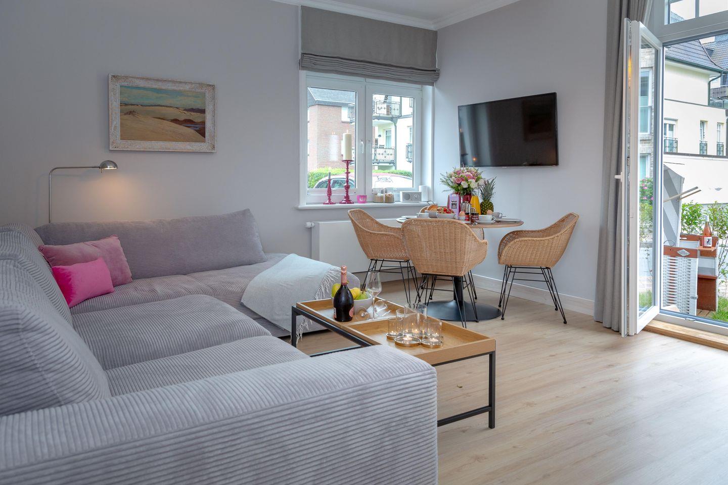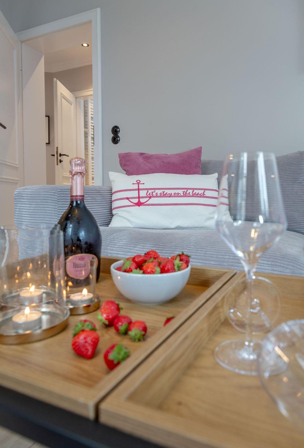 und ein Duschbad. Ebenfalls gehört zur Wohnung eine Süd-West Terrasse mit eigenem Strandkorb und einer Ess-Gelegenheit. Ihr Privatparkplatz befindet sich auf dem Grundstück und ist kostenfrei.