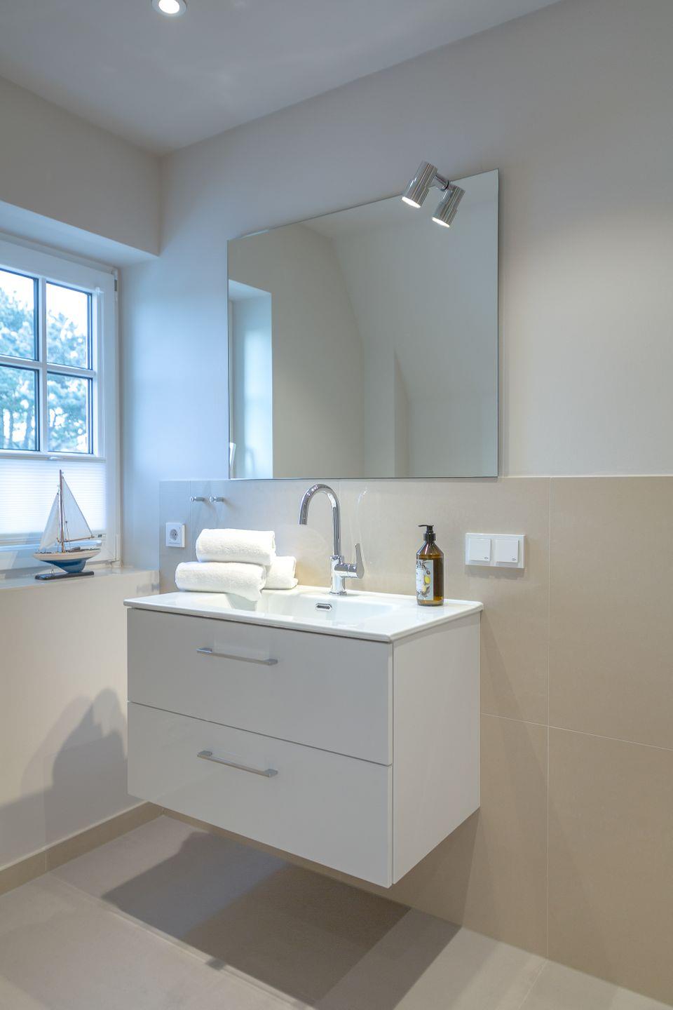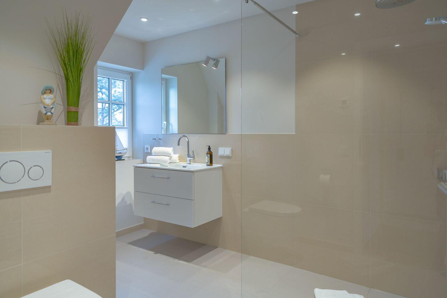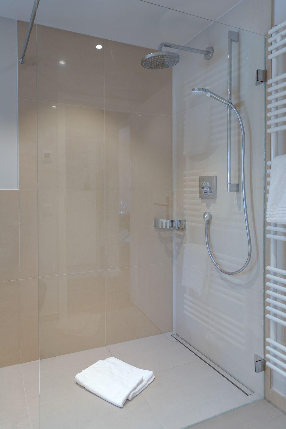 Das Badezimmer verfügt über eine Handtuch- und Fußbodenheizung sowie eine ebenerdige Dusche, die für zusätzlichen Komfort sorgt.