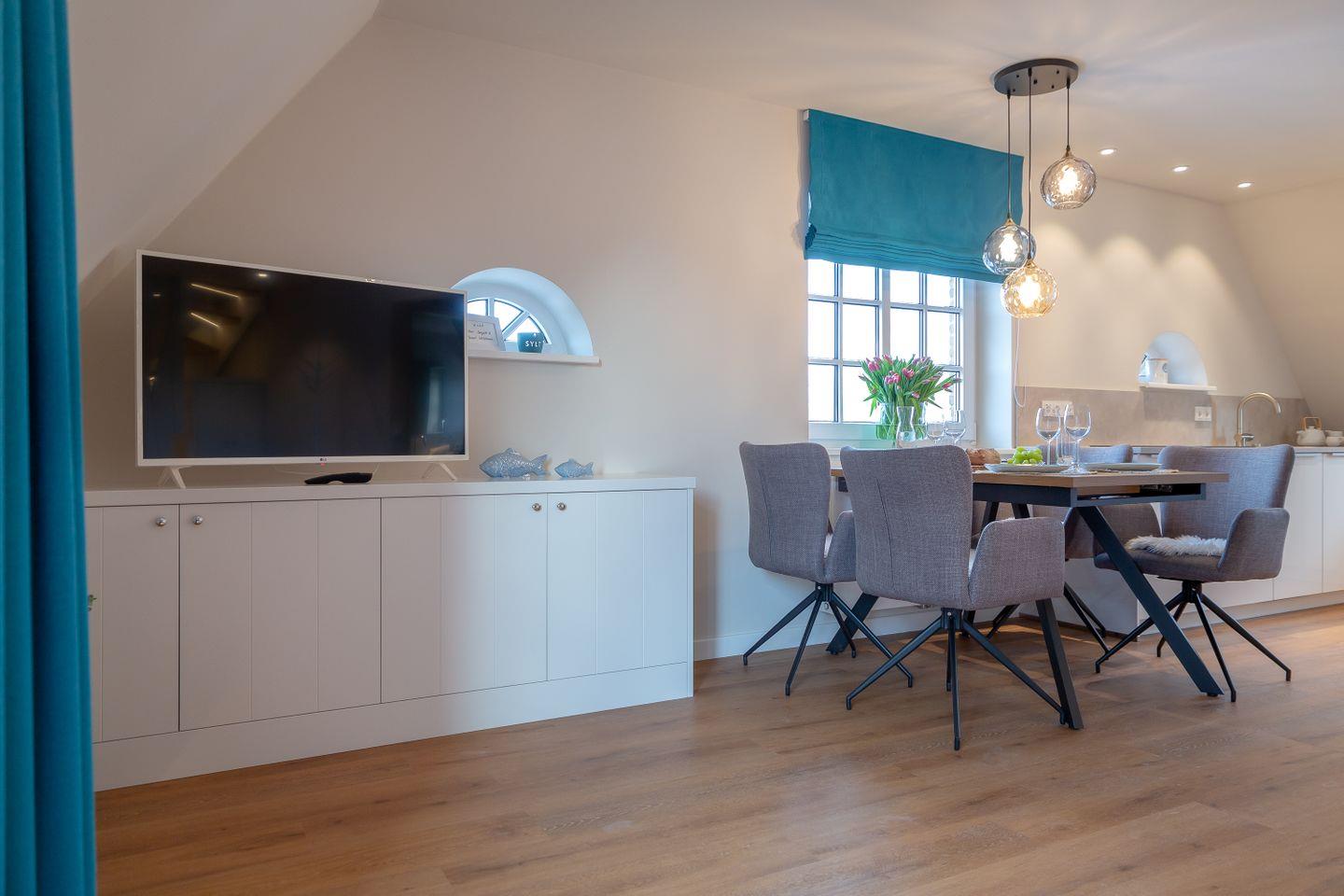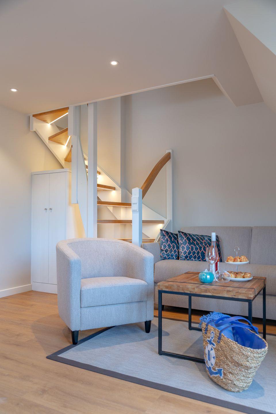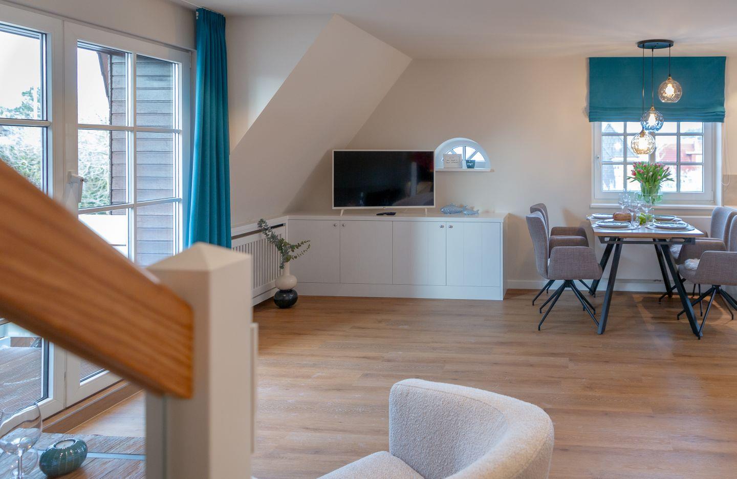 Im stilvoll gestalteten Wohnzimmer erwartet Sie nicht nur ein Smart-TV für gemütliche Abende, sondern auch ein dimmbares Stimmungslicht, das eine behagliche Atmosphäre schafft. Von hier aus haben Sie Zugang zu einem Balkon mit stilvollen Möbeln, wo Sie die frische Nordseeluft genießen können.