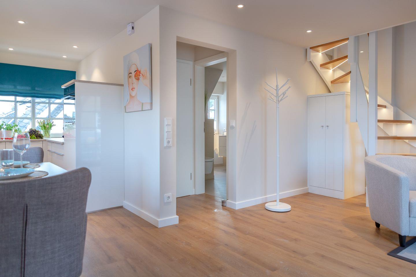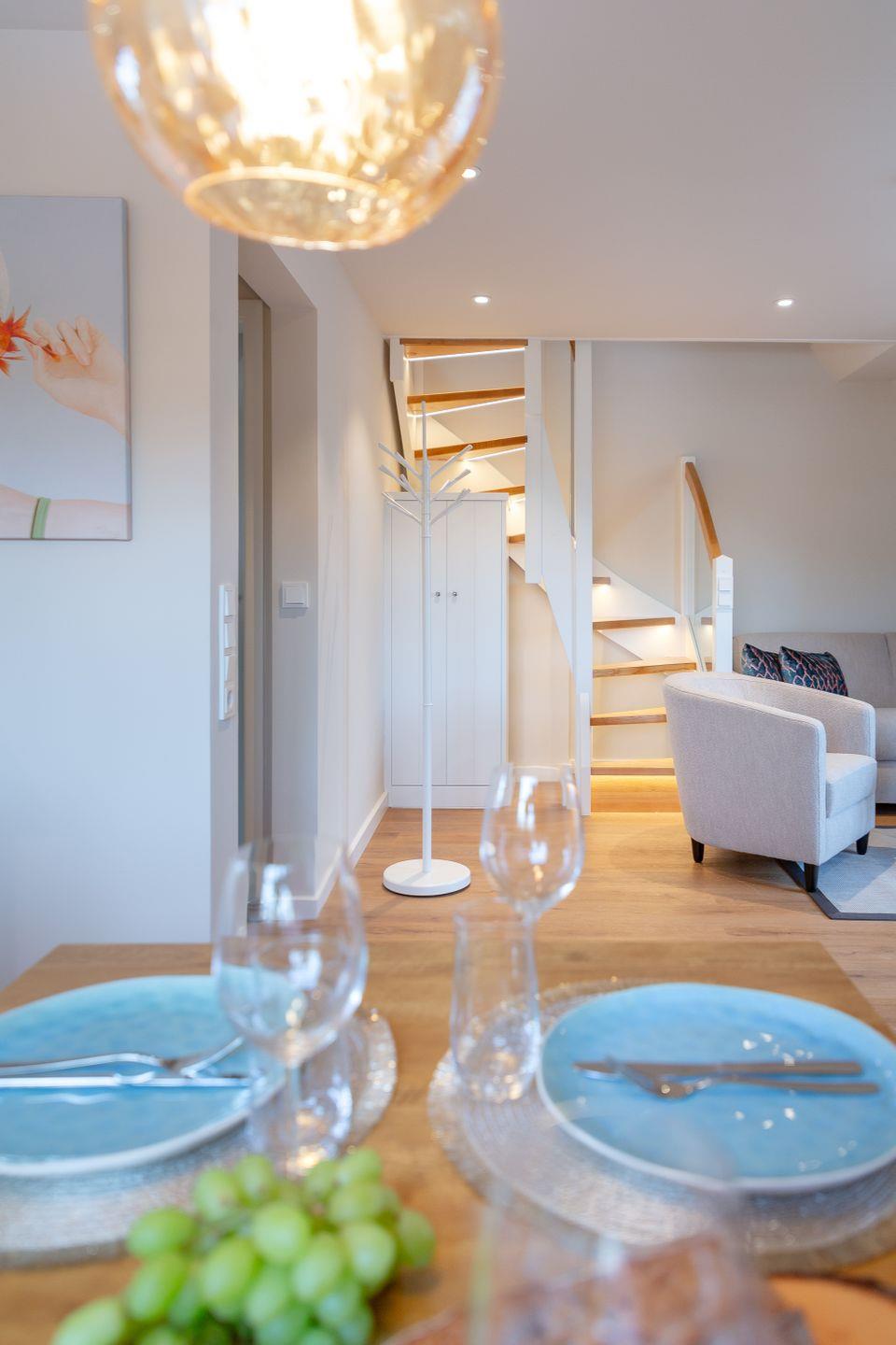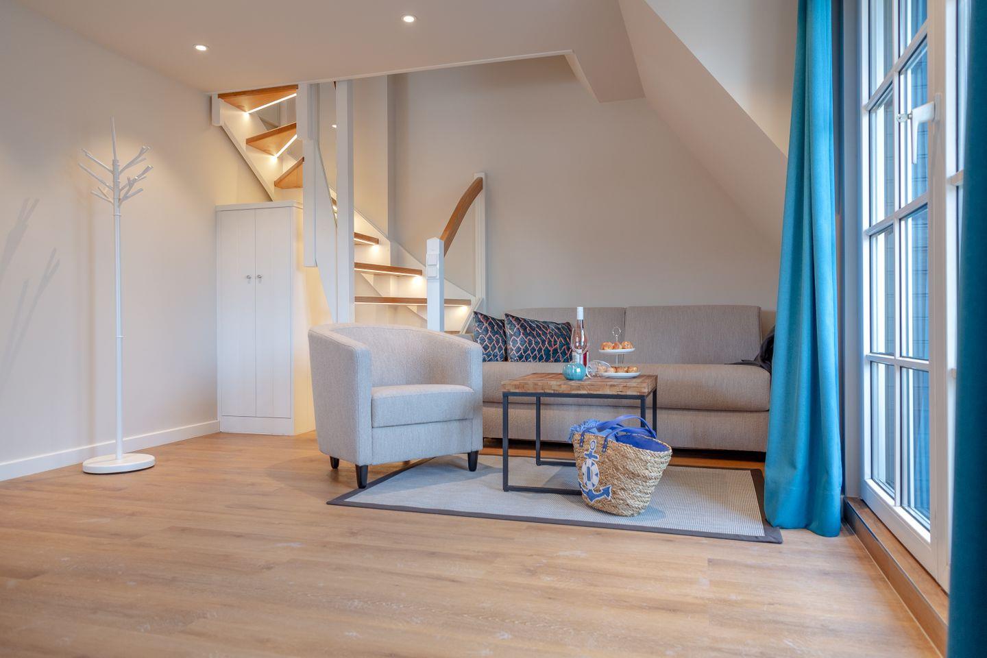 Im stilvoll gestalteten Wohnzimmer erwartet Sie nicht nur ein Smart-TV für gemütliche Abende, sondern auch ein dimmbares Stimmungslicht, das eine behagliche Atmosphäre schafft. Von hier aus haben Sie Zugang zu einem Balkon mit stilvollen Möbeln, wo Sie die frische Nordseeluft genießen können.