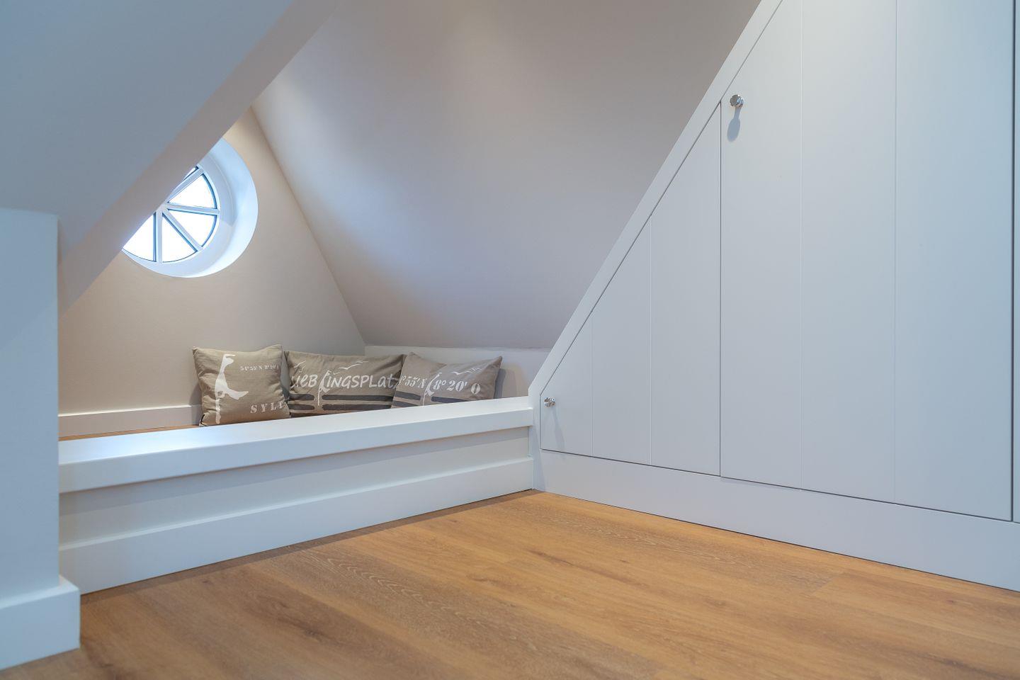 Das Schlafzimmer, welches über eine steile Treppe in das Dachgeschoss erreicht wird, bietet ein gemütliches Boxspringbett sowie großzügige maßgeschneiderte Einbauschränke, die ausreichend Stauraum bieten. Zudem steht Ihnen ein Tresor für Ihre Wertsachen zur Verfügung.