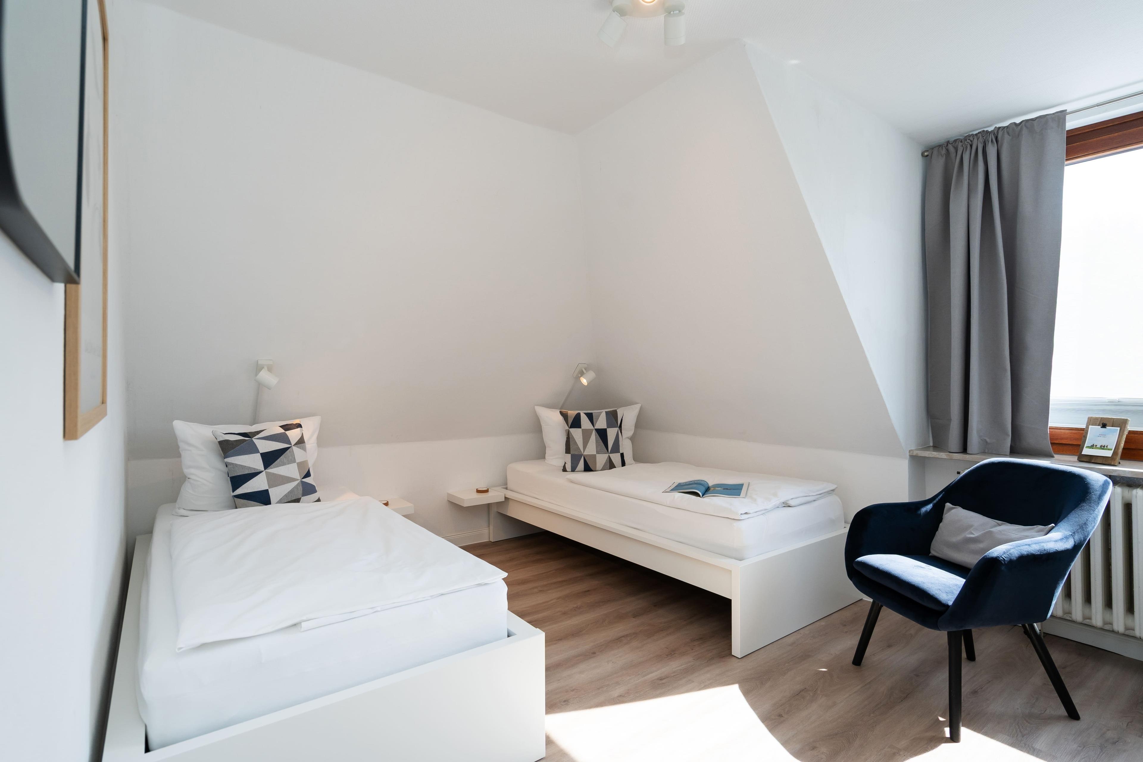 Beim Betreten der Wohnung gelangen Sie zunächst in den freundlichen Eingangsbereich, von dem aus Sie die beiden Schlafzimmer, das Badezimmer und das Wohn- und Esszimmer erreichen. Eines der Schlafzimmer ist mit einem bequemen Doppelbett ausgestattet, während das andere über zwei charmante Einzelbetten verfügt - perfekt für Familien oder Freunde.