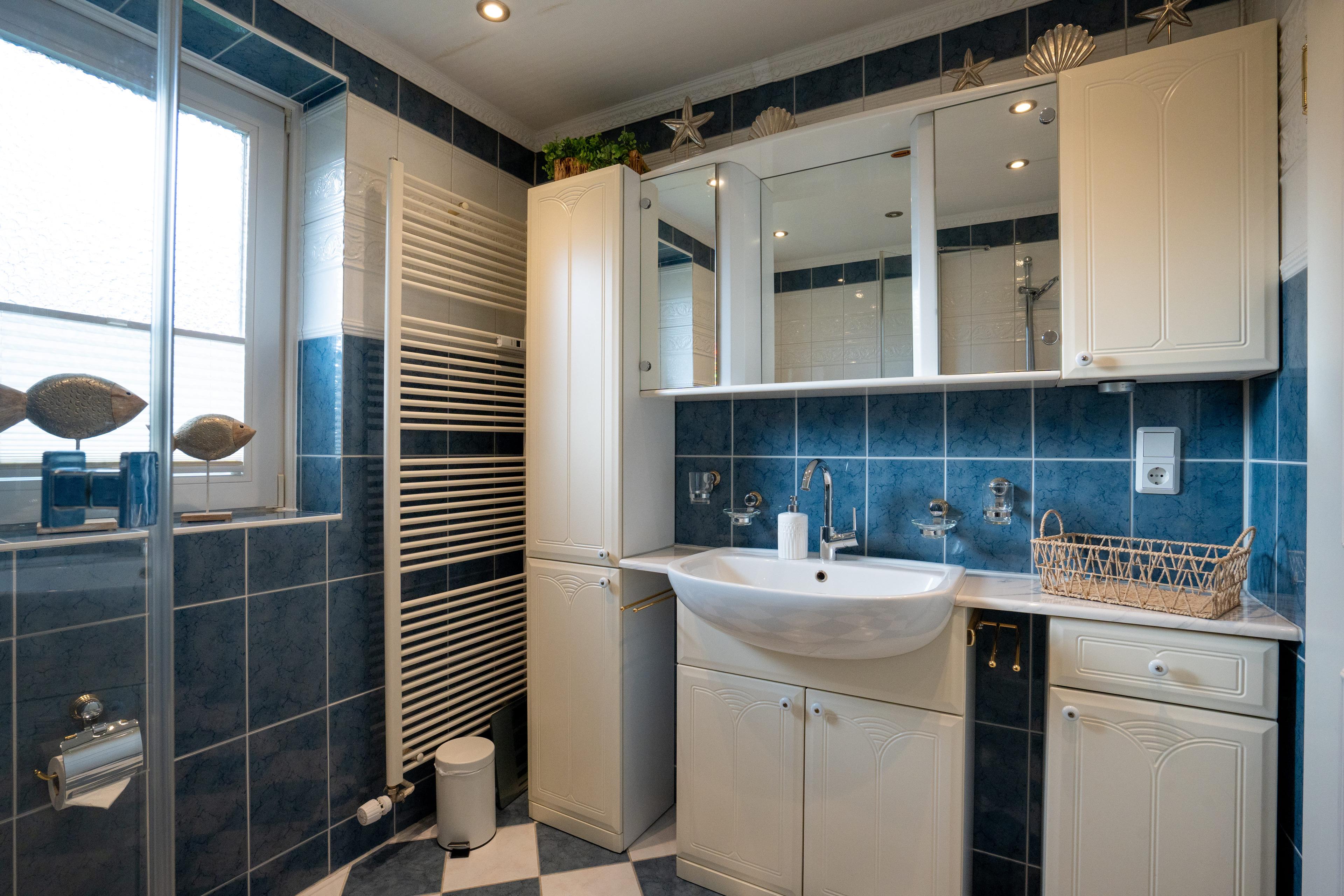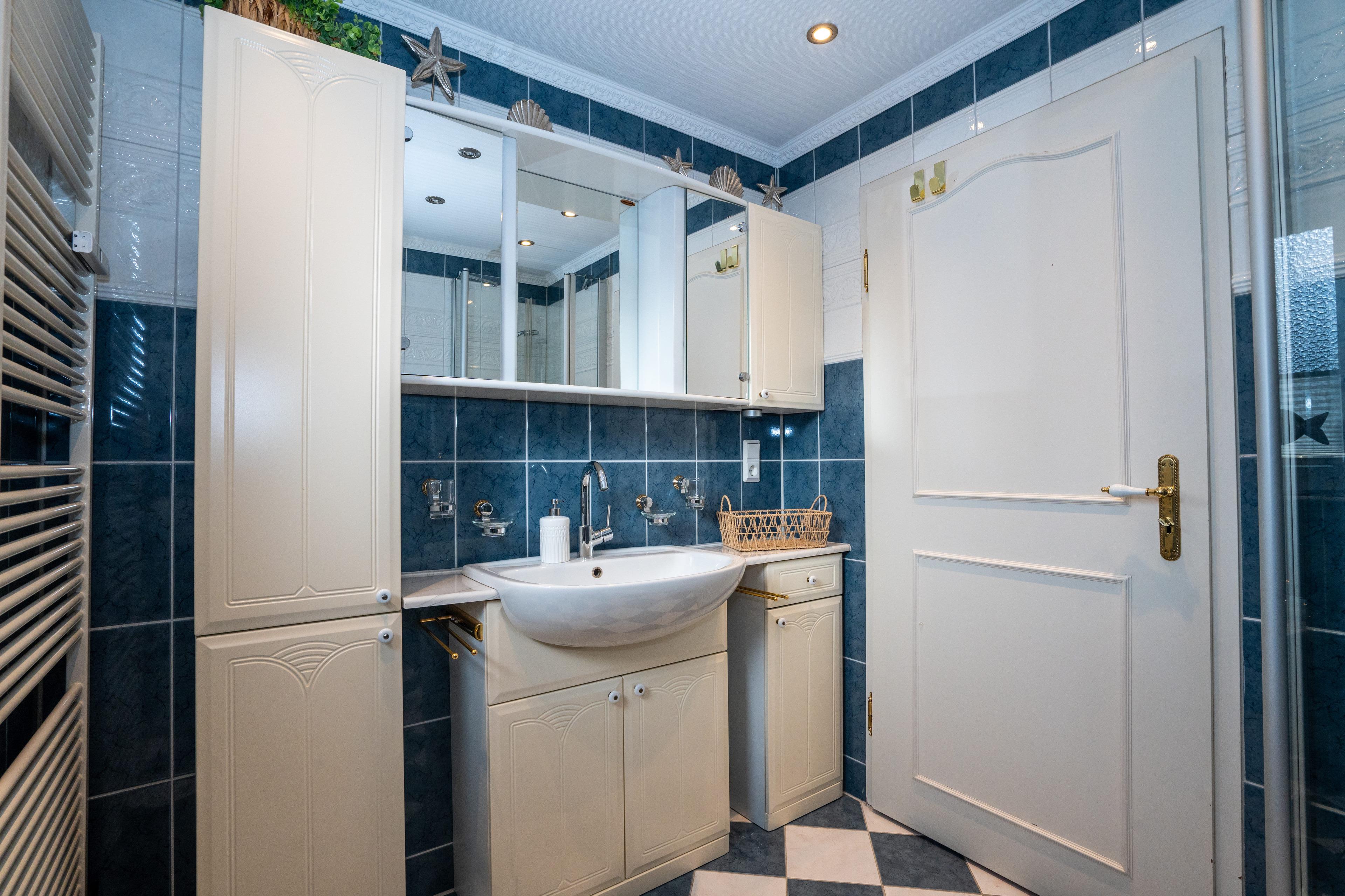 Das gepflegte Badezimmer verfügt über Dusche, WC und Waschbecken – alles, was Sie für einen angenehmen Aufenthalt benötigen.