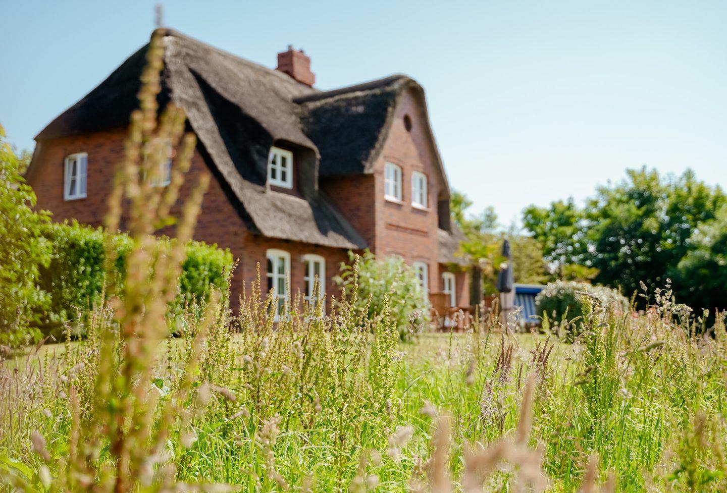 Großzügiges Endhaus unter Reet im ruhigen Morsum mit Terrasse und Kamin, ideal zum Entspannen und Genießen inmitten von Wiesen.