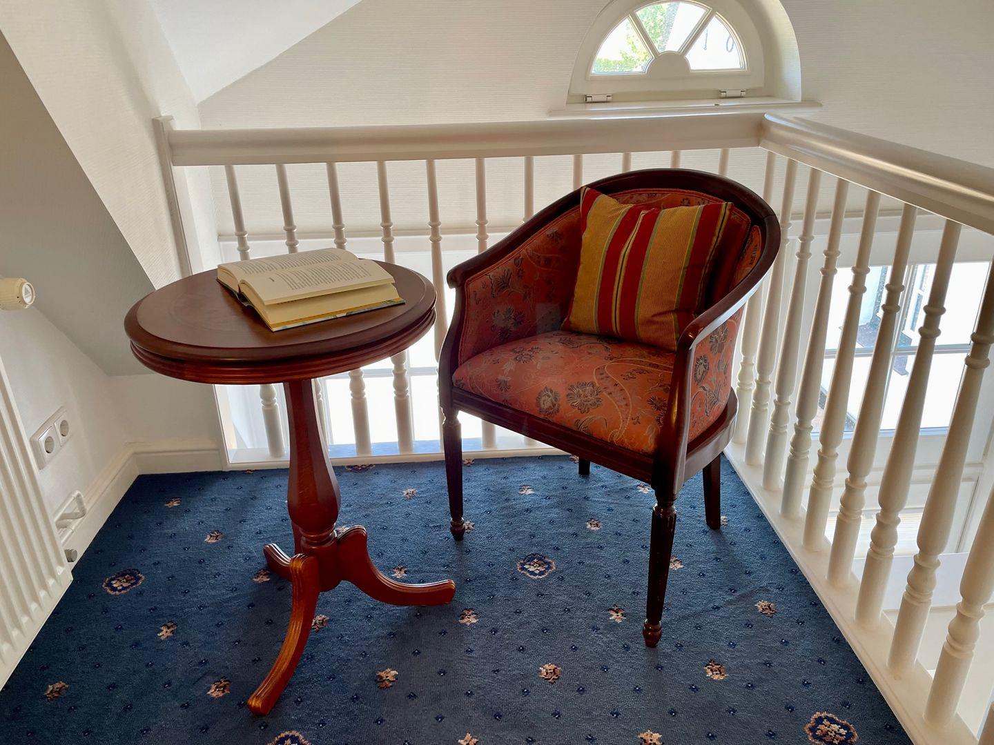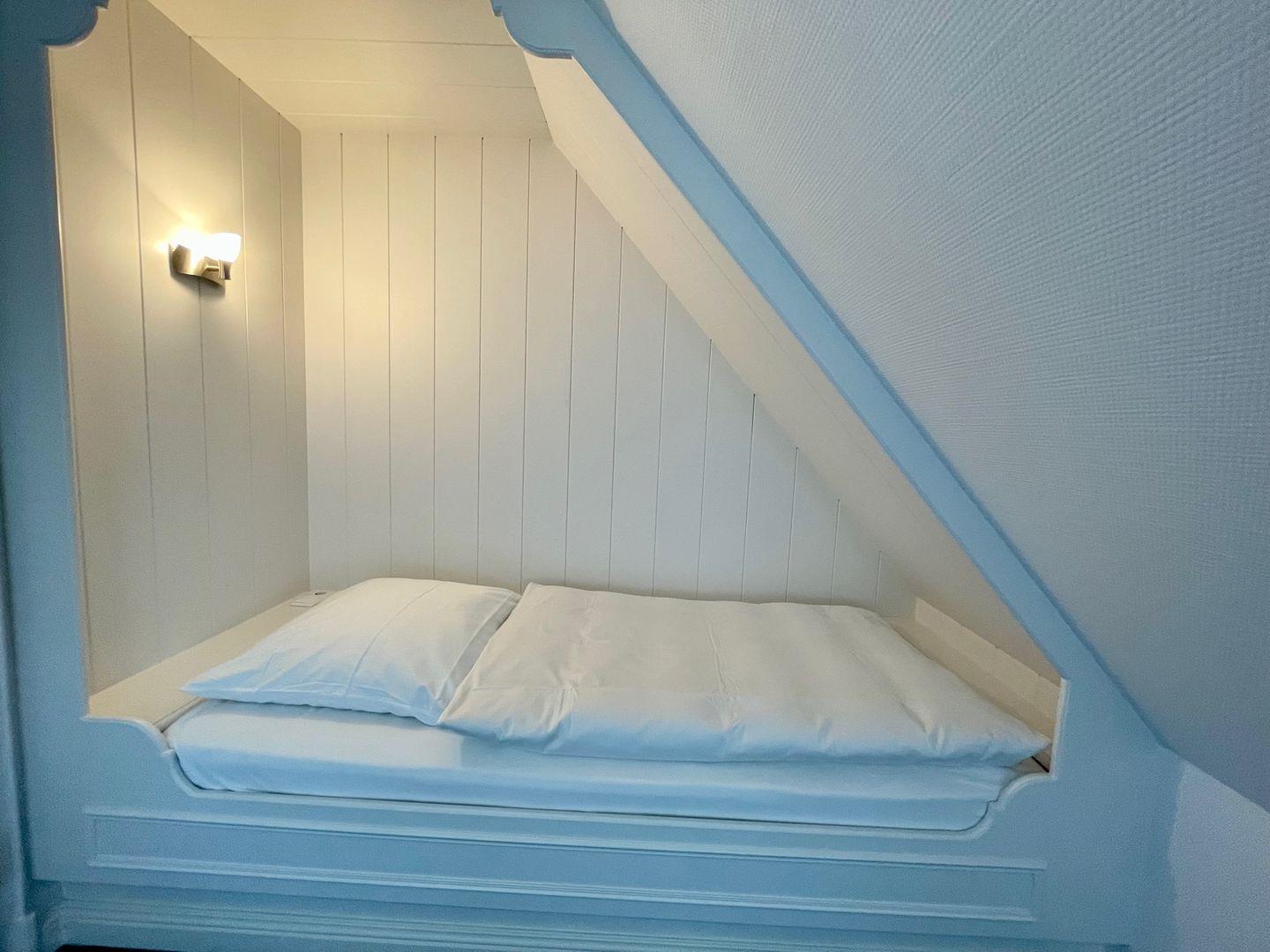 Im Obergeschoss finden Sie das Schlafzimmer mit einem komfortablen Doppelbett sowie einen kleinen Rückzugsbereich mit einem Einzelbett, ideal für ruhige Momente. Auf der Empore steht ein gemütlicher Sitzbereich bereit, perfekt zum Lesen, Schreiben oder einfach zum Genießen der ruhigen Atmosphäre. Das hell geflieste Bad mit Glasdusche, beleuchtetem Spiegel und Handtuchheizkörper rundet das Wohlfühlerlebnis ab.