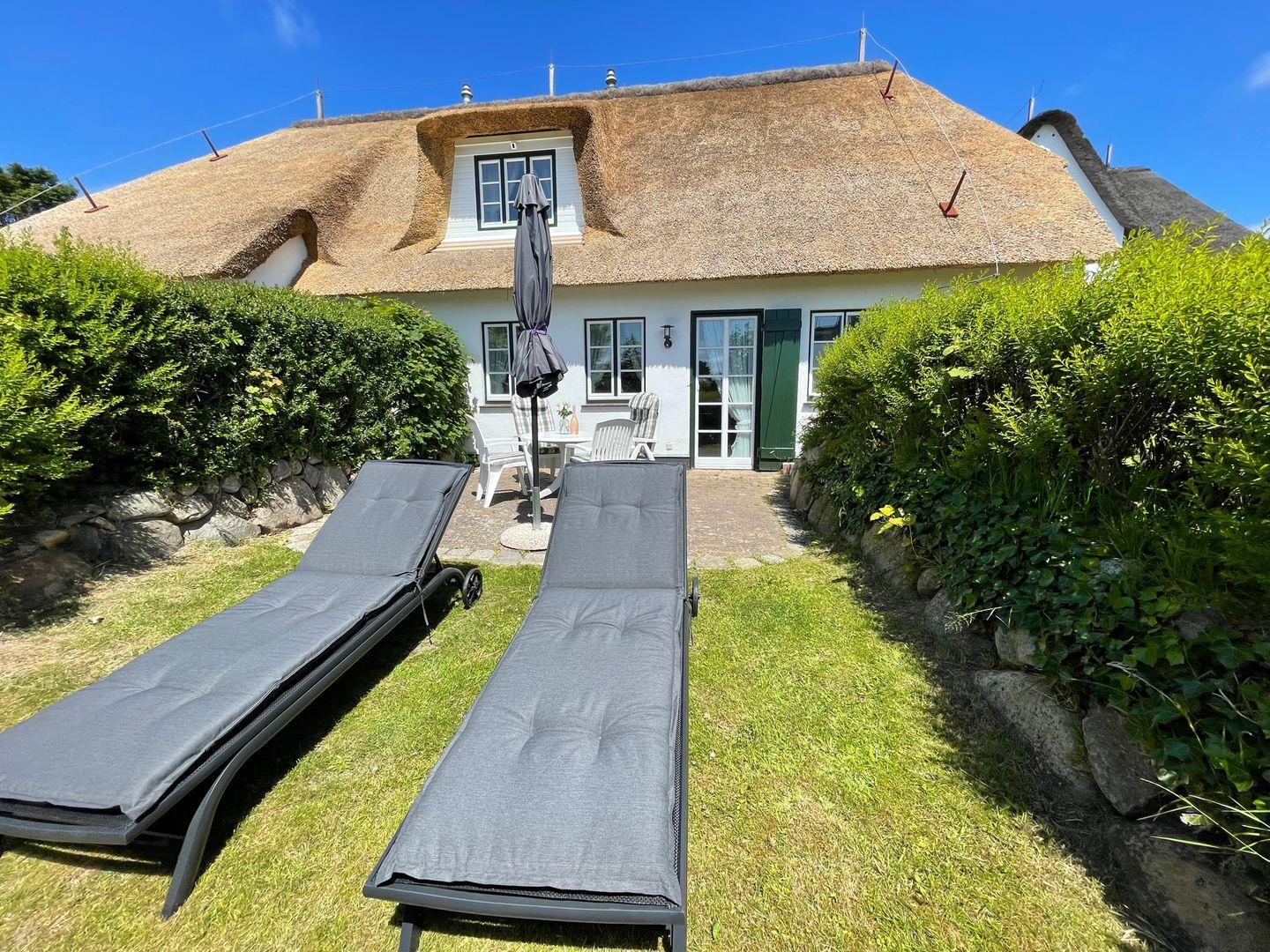 Draußen lädt die geschützte Terrasse mit Tisch, Stühlen, zwei Sonnenliegen und Sonnenschirm dazu ein, die frische Luft und die Sonne zu genießen. Eine angrenzende Rasenfläche, umgeben von einer schützenden Hecke, bietet zusätzlichen Raum zum Entspannen und Verweilen.