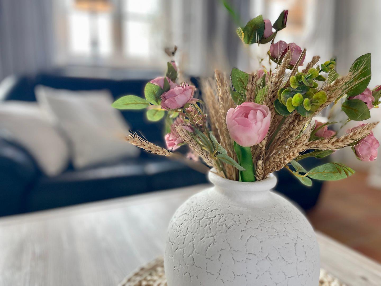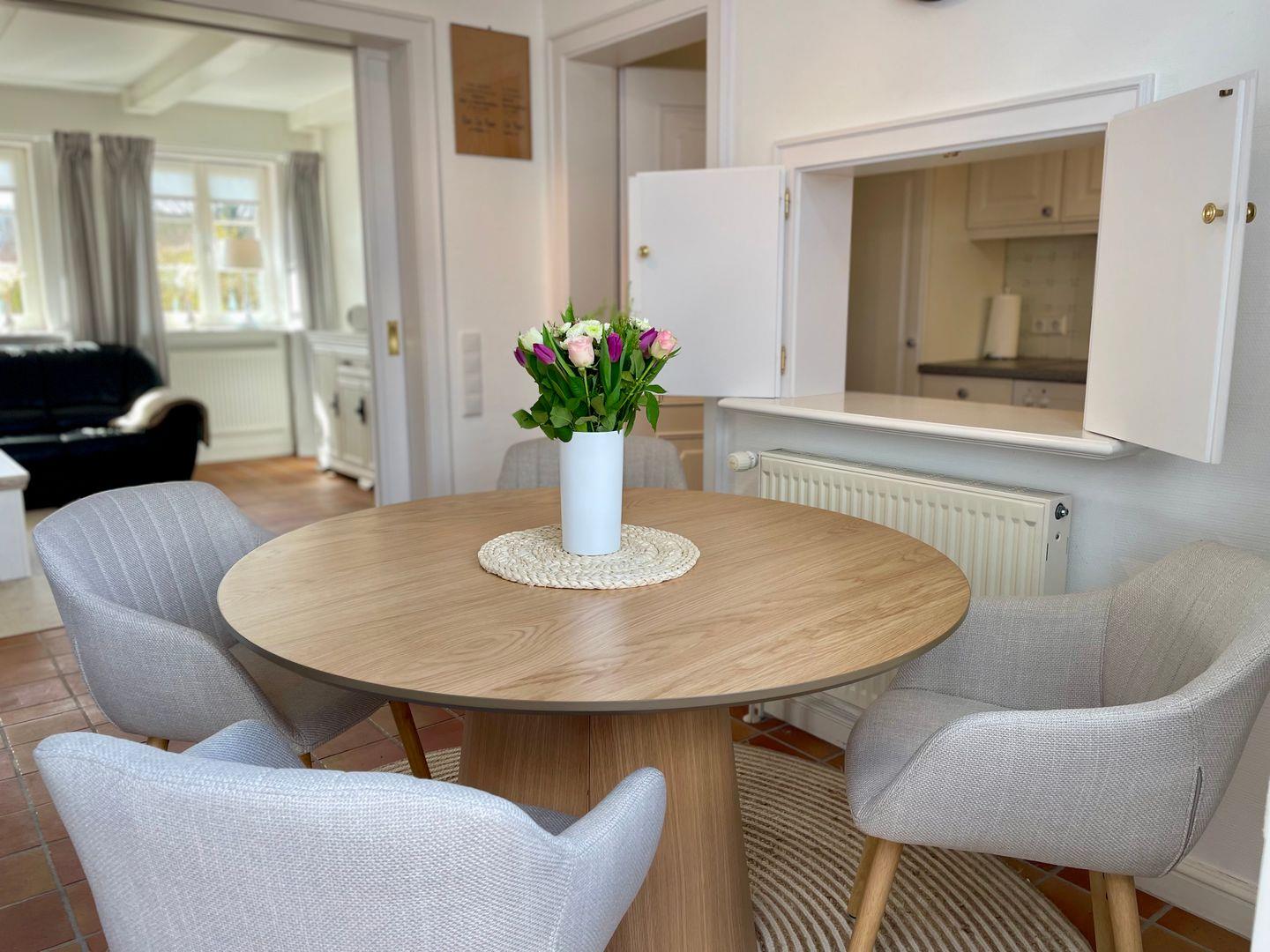 Die Wohnung „Jan“ lädt zu entspannten und unbeschwerten Urlaubstagen ein. Das Wohnzimmer ist hell und freundlich eingerichtet, mit gemütlichen Möbeln zum Entspannen und einem großen Flachbildfernseher für unterhaltsame Stunden. Von hier aus gelangen Sie über eine charmante Schiebetür in den Essbereich und direkt hinaus auf Ihre private Terrasse. Die kleine, aber liebevoll gestaltete Küche im Landhausstil bietet alles, was man zum Kochen braucht, und durch die praktische Durchreiche bleibt der Raum angenehm offen und luftig.