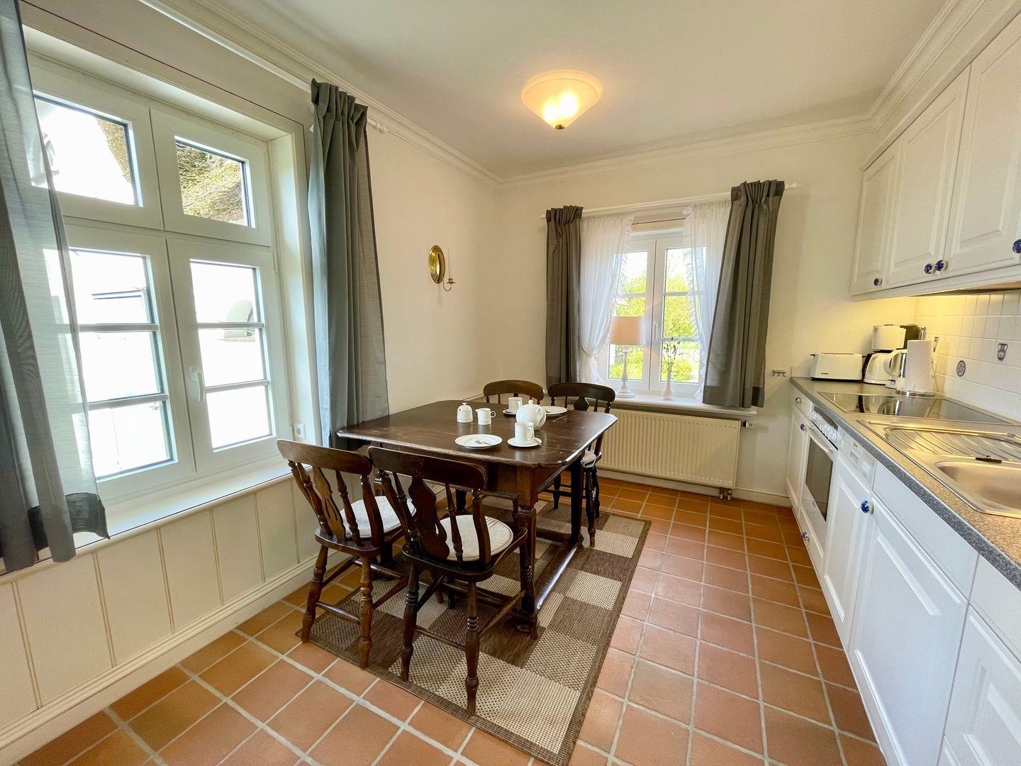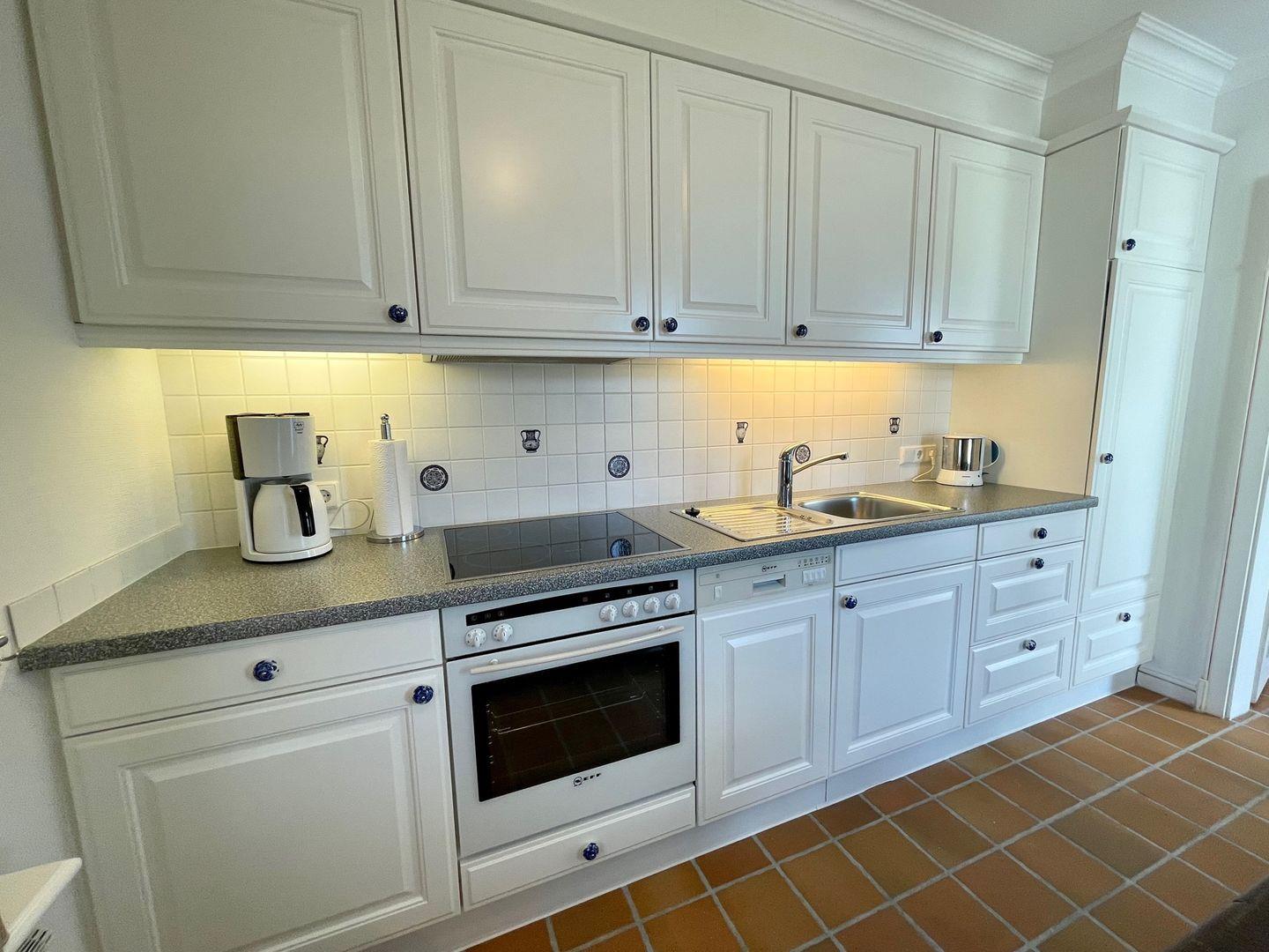 Die angrenzende Wohnküche ist ein Ort, an dem man gern zusammen Zeit verbringt. Die hochwertige Küchenzeile lässt keine Wünsche offen, und der Esstisch für bis zu vier Personen lädt zu gemütlichen Frühstücken oder romantischen Abendessen ein – vielleicht bei Kerzenschein?