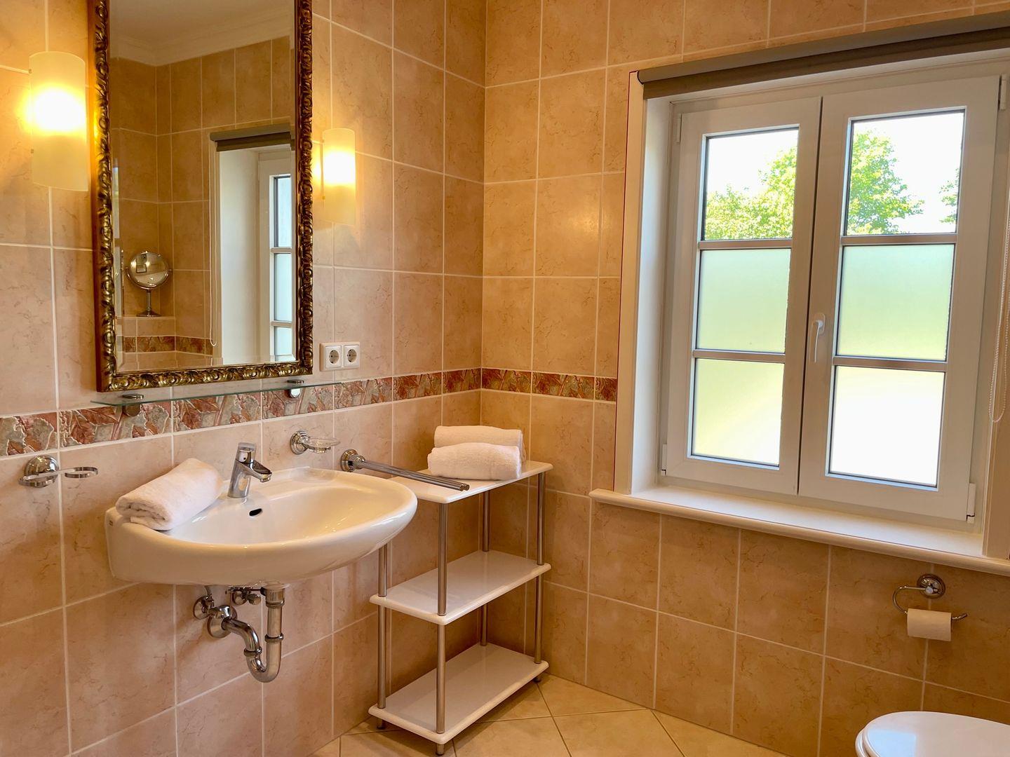Das Tageslichtbad überzeugt mit einer bodengleichen Dusche mit Glastüren, einem beleuchteten Spiegel und viel Platz für Ihre persönlichen Dinge – alles stilvoll und praktisch zugleich.