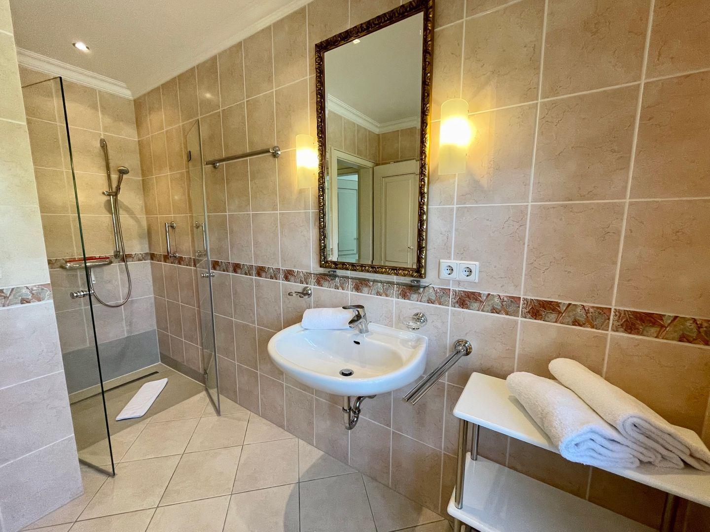 Das Tageslichtbad punktet mit seiner bodengleichen Dusche mit Glastüren. Ein beleuchteter Spiegel, reichlich Ablagefläche, Waschbecken und WC vervollständigen die Ausstattung des Badezimmers.