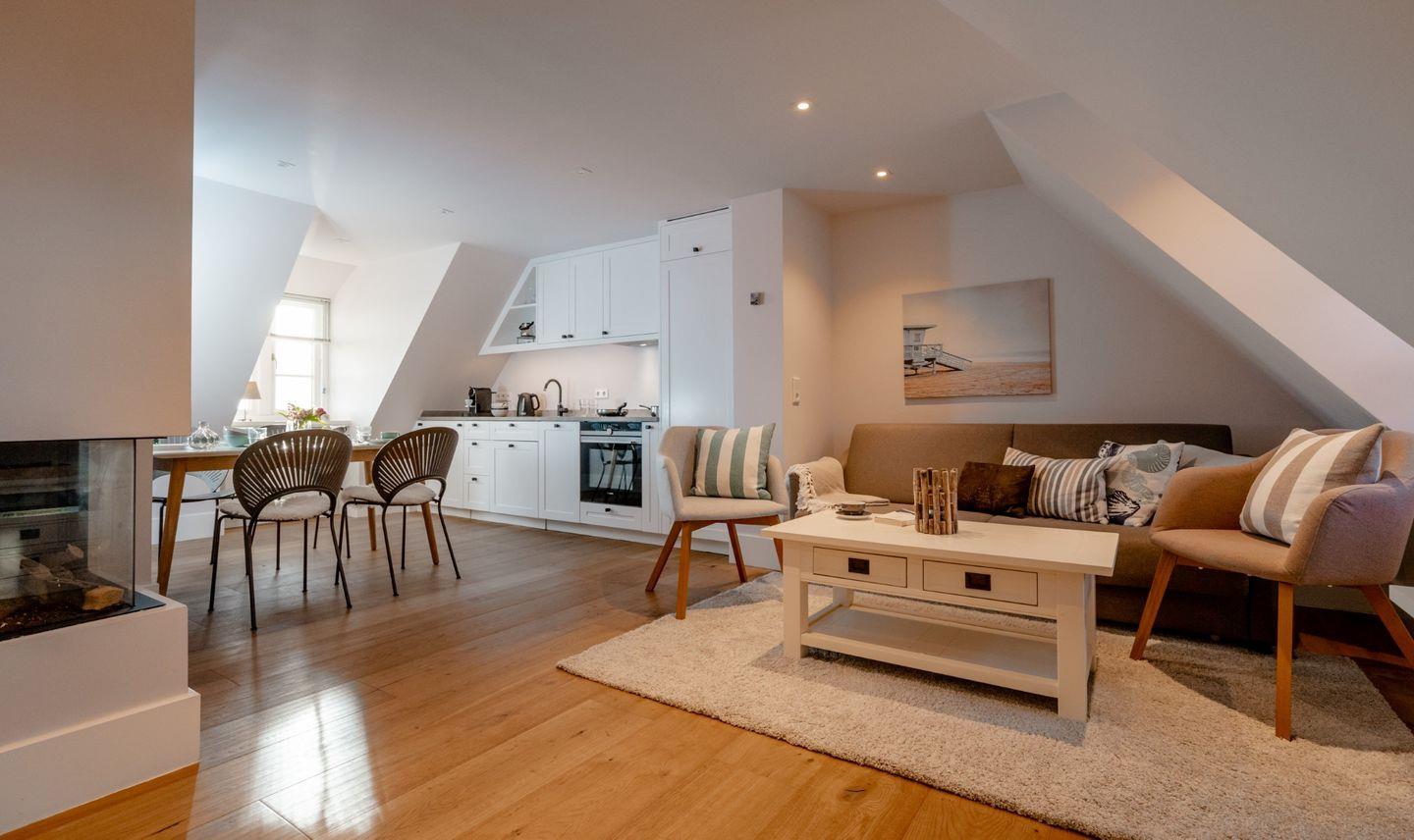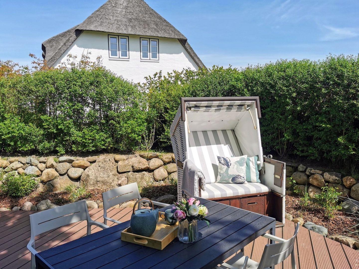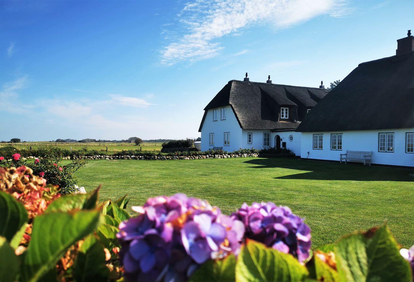 Die charmante Ferienwohnung "Pauenhuus" liegt im Obergeschoss eines historischen Reetdachhofs am Ortsrand von Archsum. Aus den Fenstern genießen Sie traumhafte Ausblicke über die Wiesen, bis aufs nah gelegene Wattenmeer. Hochwertige Materialien, wie z.B. Eichendielen und Naturstein sorgen für ein ganz besonderes Wohngefühl. Der großzügige Wohnbereich mit offener Küche und Essbereich ist mit einem Gas-Kamin ausgestattet. Zur Wohnung gehört ein geschützter Terrassenplatz in Südausrichtung mit Strandkorb und Weitblick.