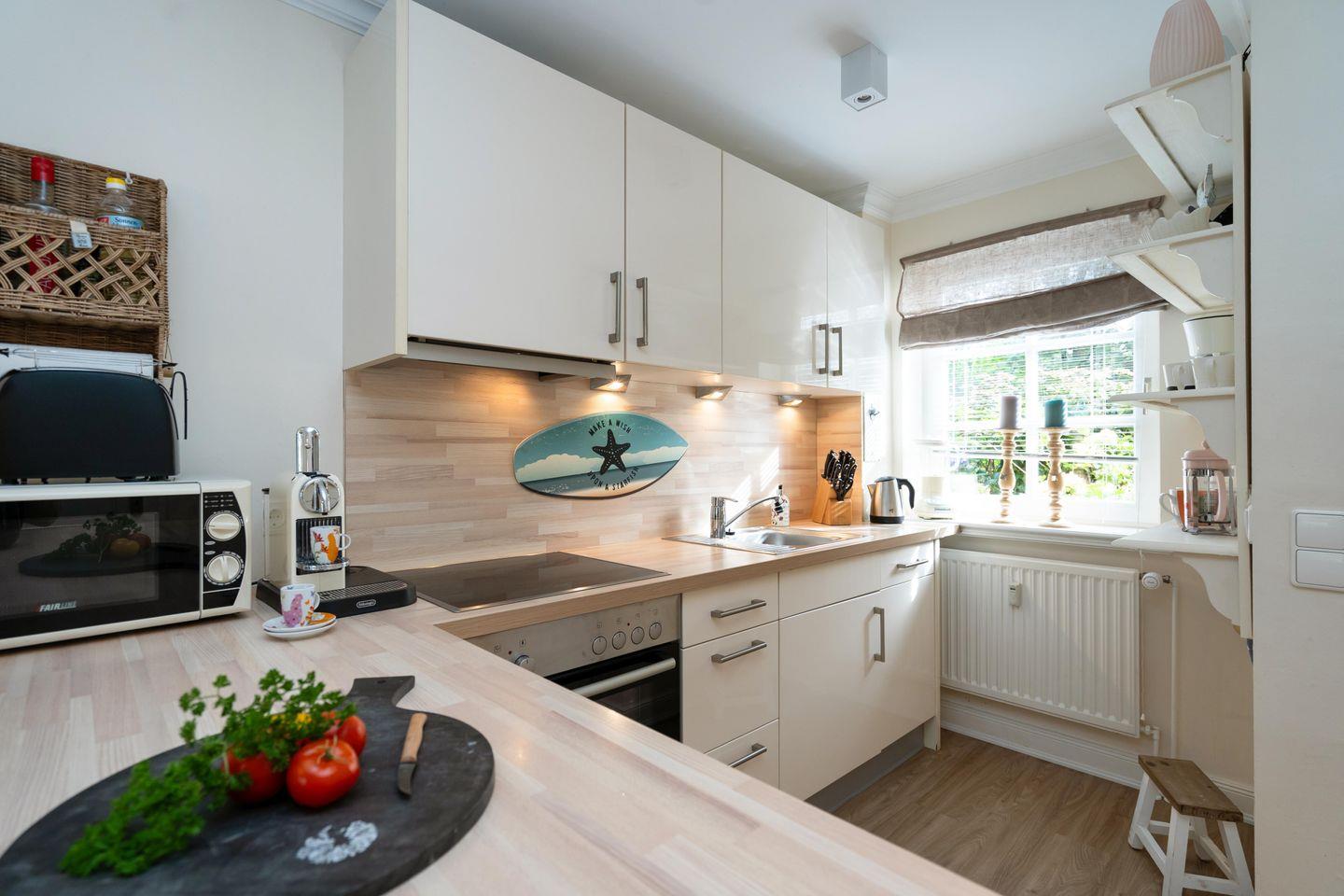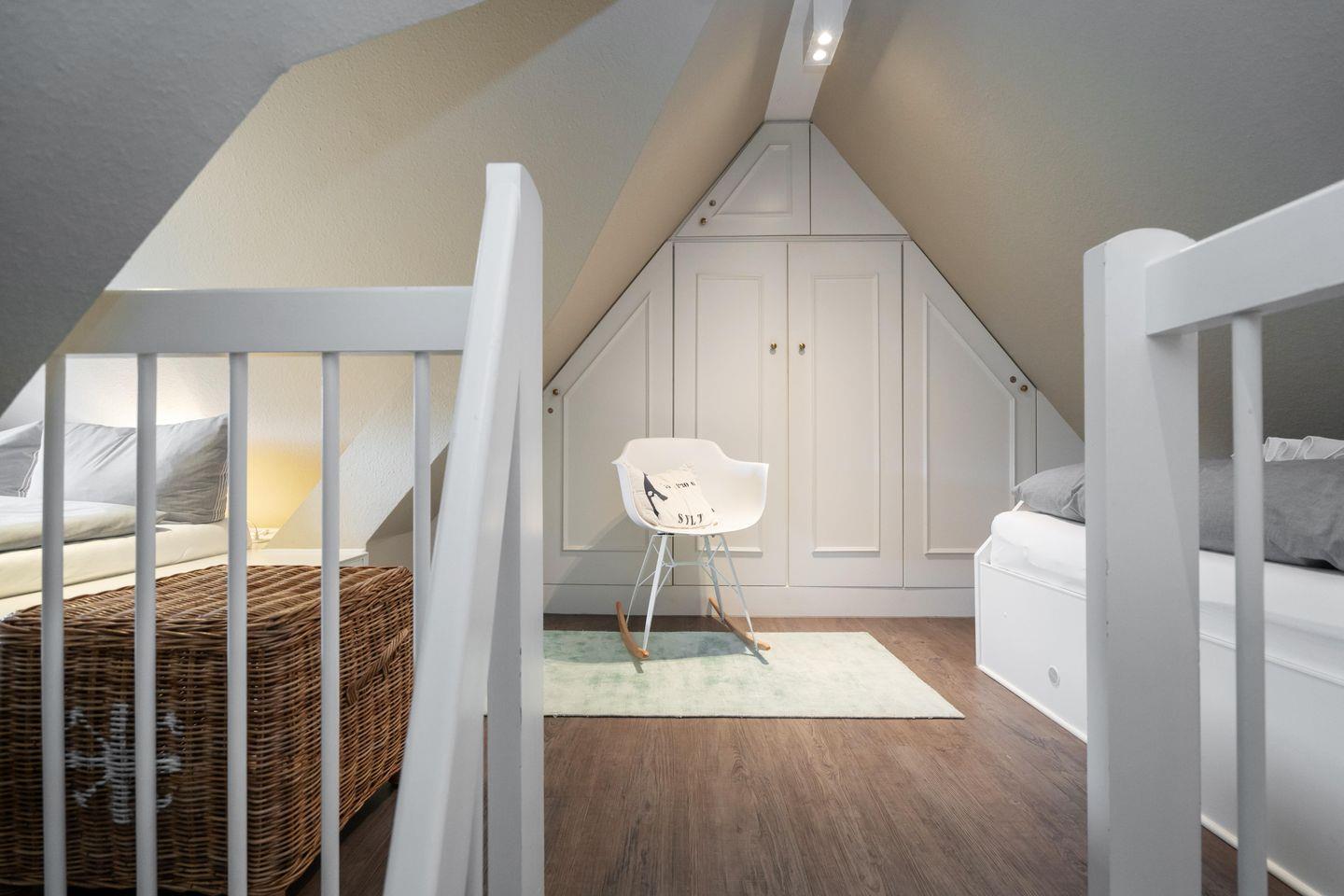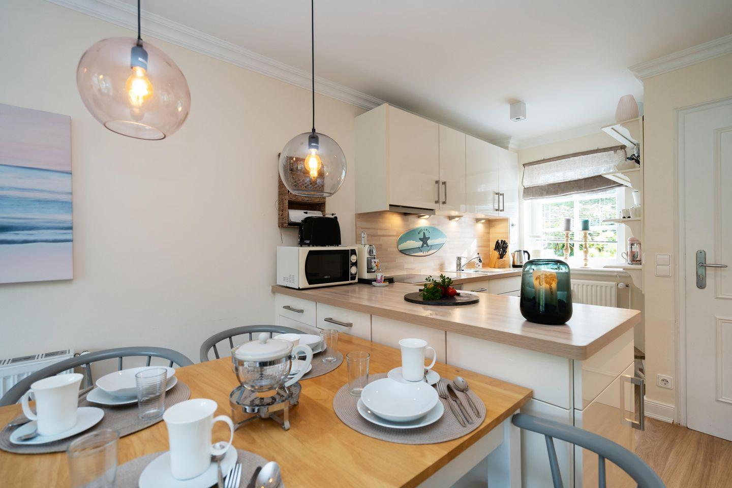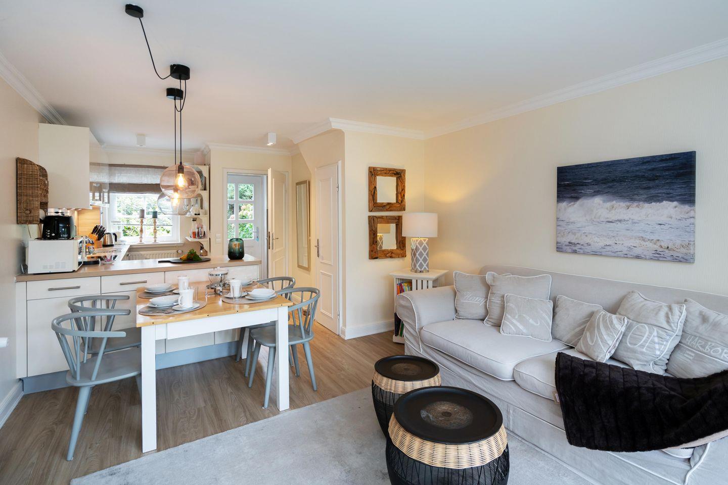 Dieses schöne ca. 70 m² große Ferienhaus unter Reet für bis zu fünf Personen verläuft über drei Ebenen und befindet sich in wunderschöner Lage im Süden Keitums. Das Erdgeschoss bietet Ihnen einen stilvoll eingerichteten Wohn- und Essbereich, der durch seine gemütliche Atmosphäre zur Entspannung einlädt. Die moderne, offene Küche samt Geschirrspüler, Mikrowelle und Gefrierfach ist voll ausgestattet. Im 1. Obergeschoss erwartet Sie ein helles Doppelschlafzimmer sowie ein Duschbad mit Waschmaschine. Im Dachgeschoss befindet sich ein weiteres Schlafzimmer mit einem Doppel- sowie einem Einzelbett. Nutzen Sie gerne die sonnige Westterrasse mit angrenzendem Garten samt Gartenmöbeln und Strandkorb (in der Saison). Kostenloses WLAN, zwei zugehörige PKW-Stellplätze und eine Waschmaschine stehen Ihnen zur Verfügung. Ein Haustier ist erlaubt.