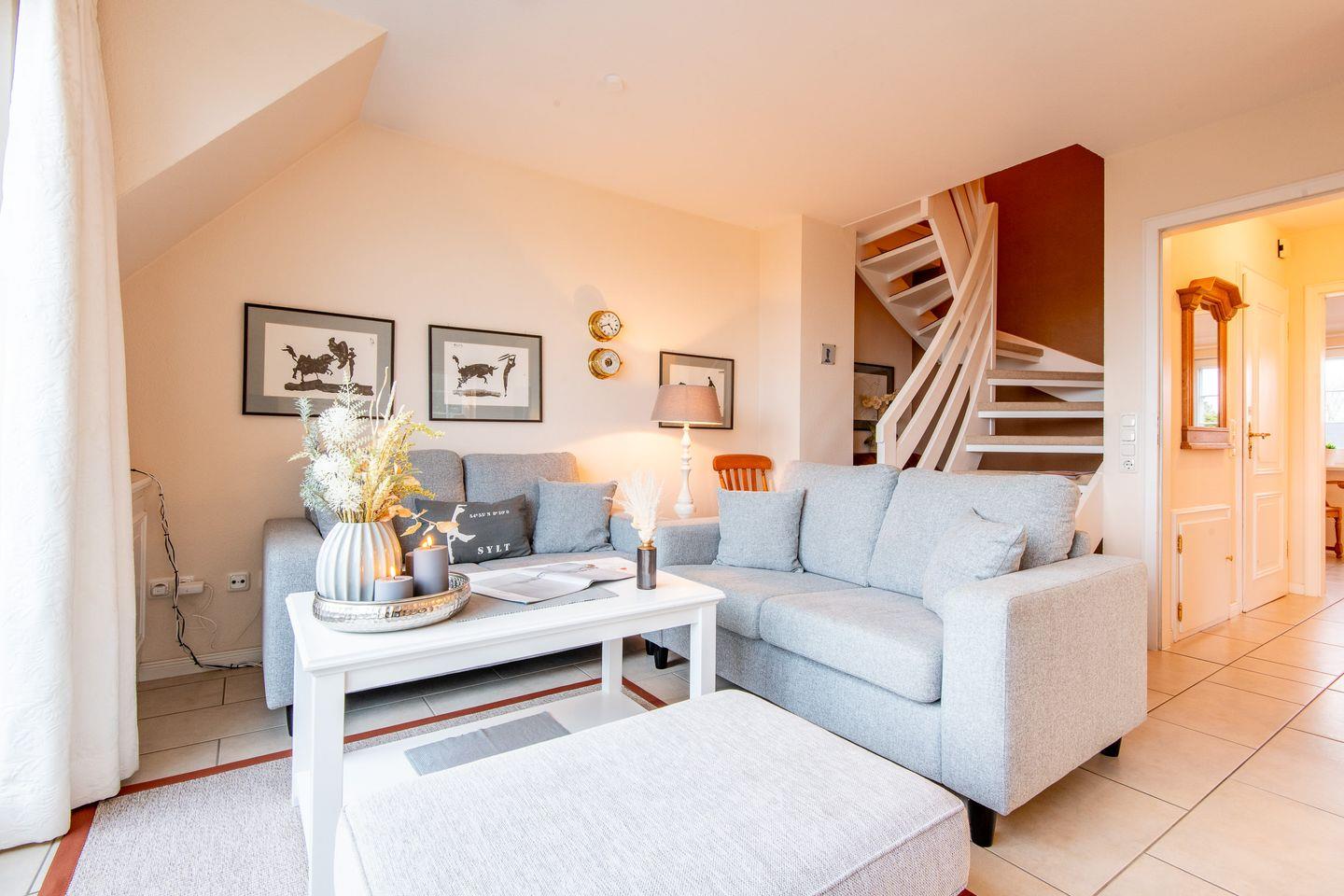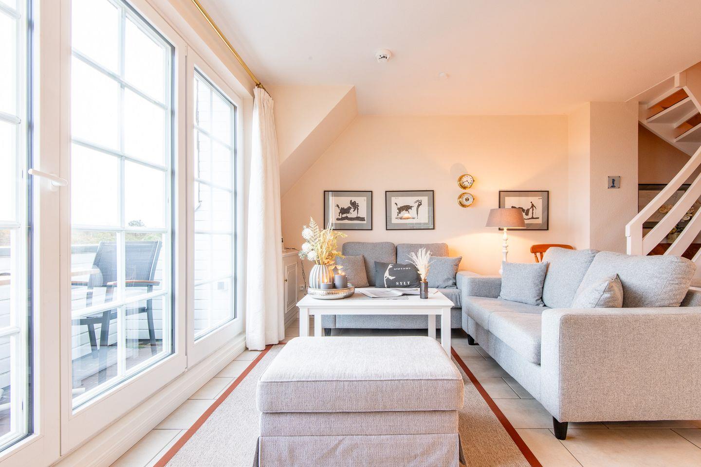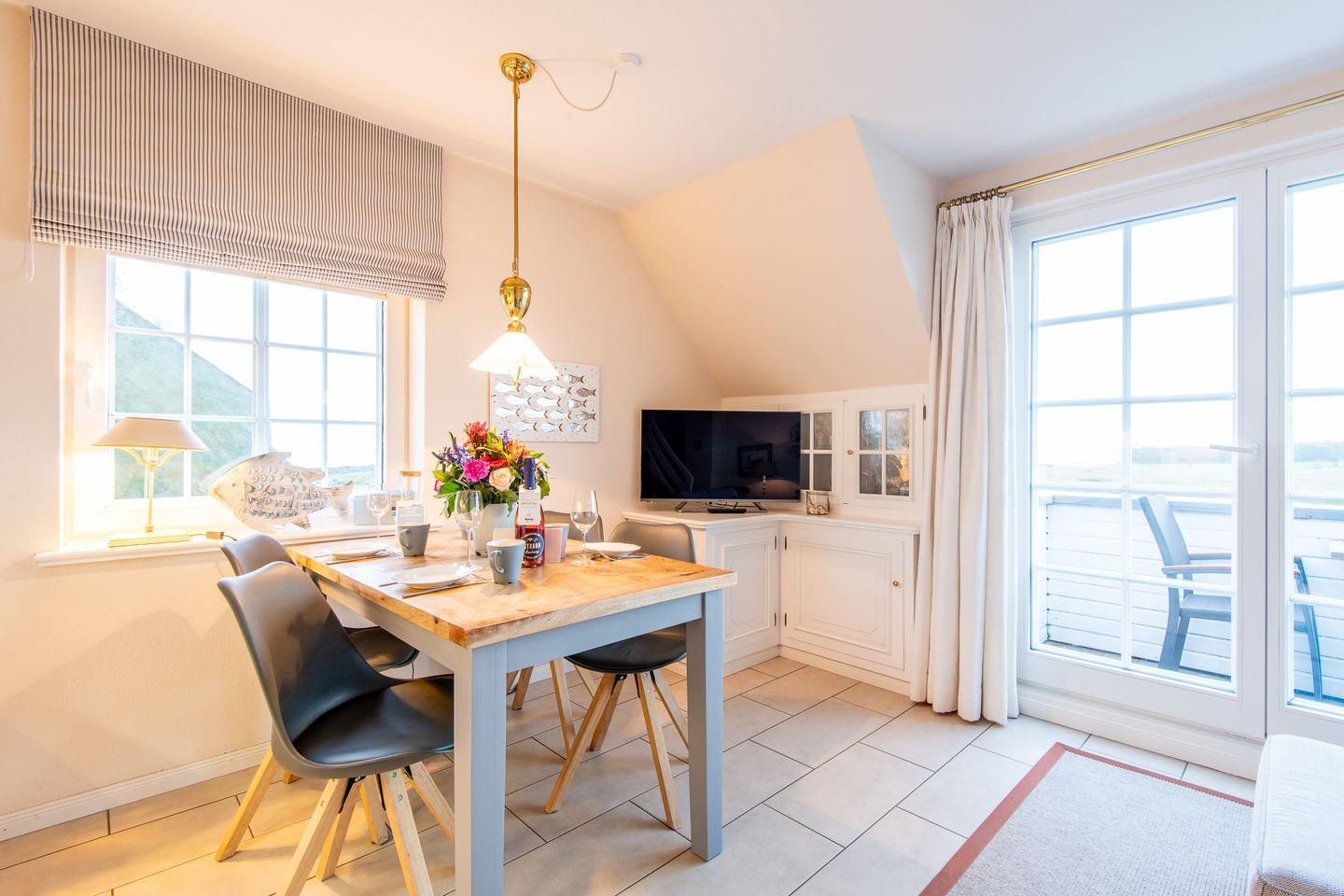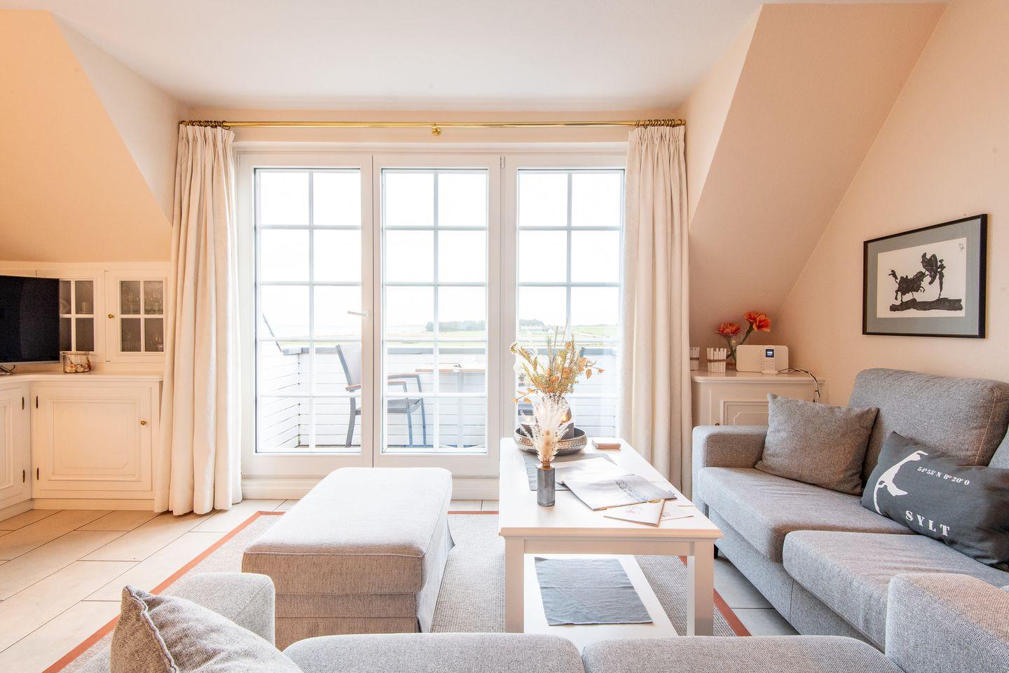 Das helle Wohnzimmer ist mit einem großzügigen Sofa, TV und einem Esstisch für 4 Personen ausgestattet. Der direkte Zugang zum Süd-Balkon erlaubt Ihnen, die frische Nordseeluft und den traumhaften Ausblick über das Wattenmeer bis nach Keitum zu genießen – der perfekte Ort für entspannte Stunden unter freiem Himmel.