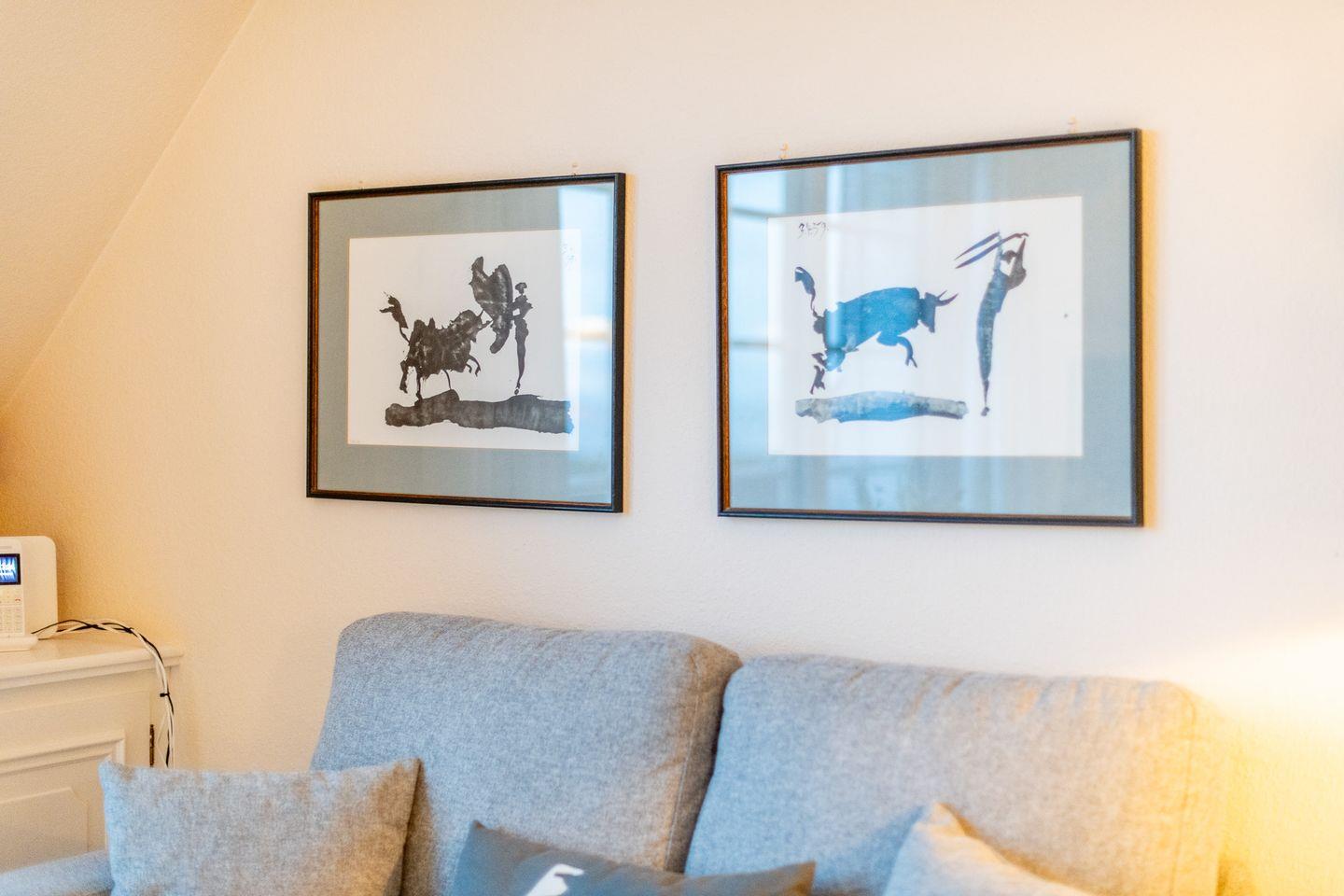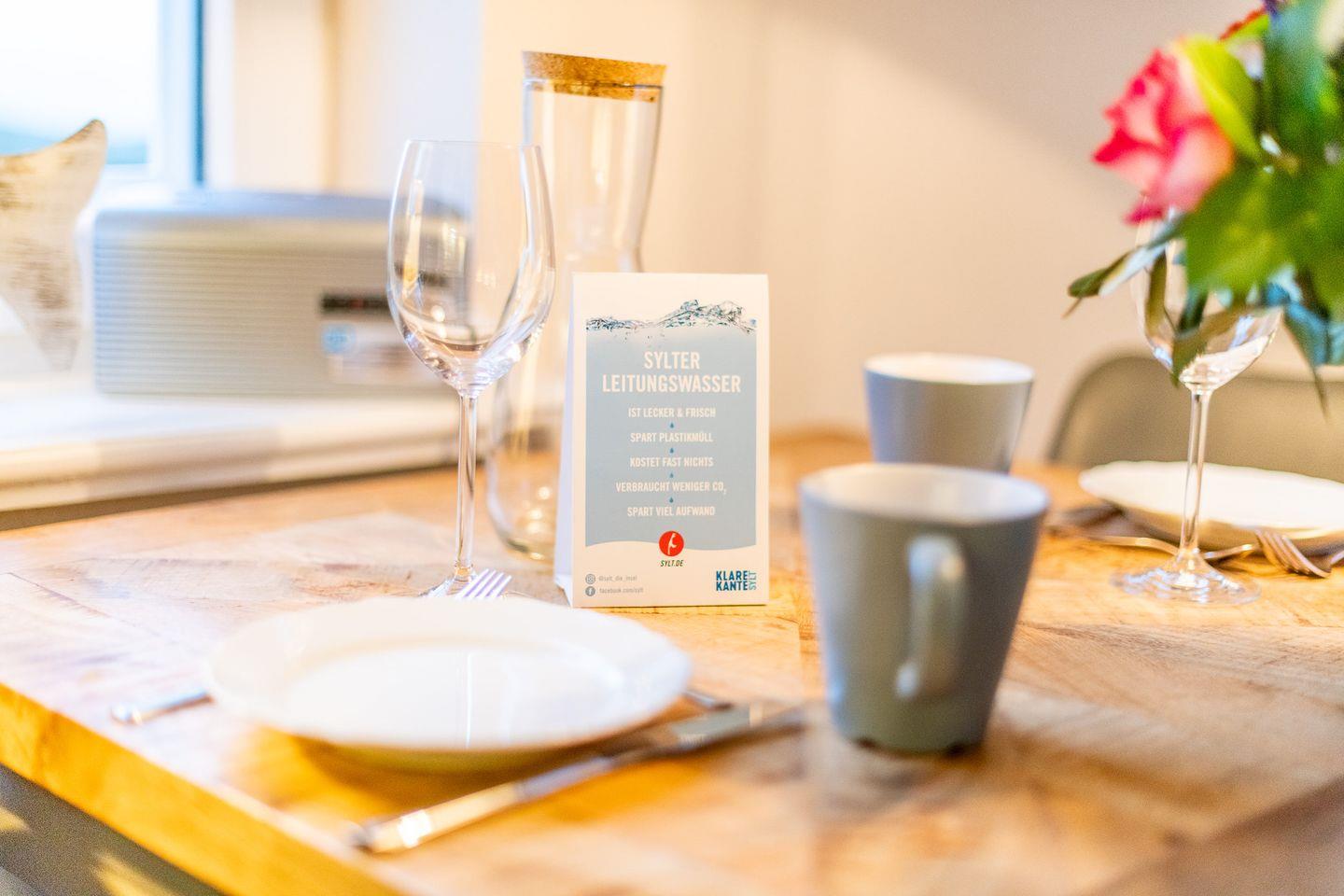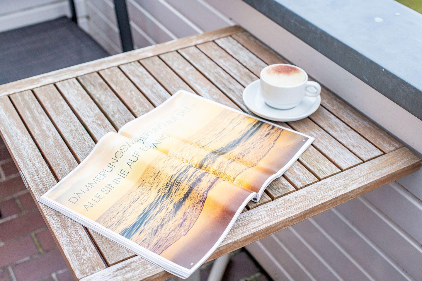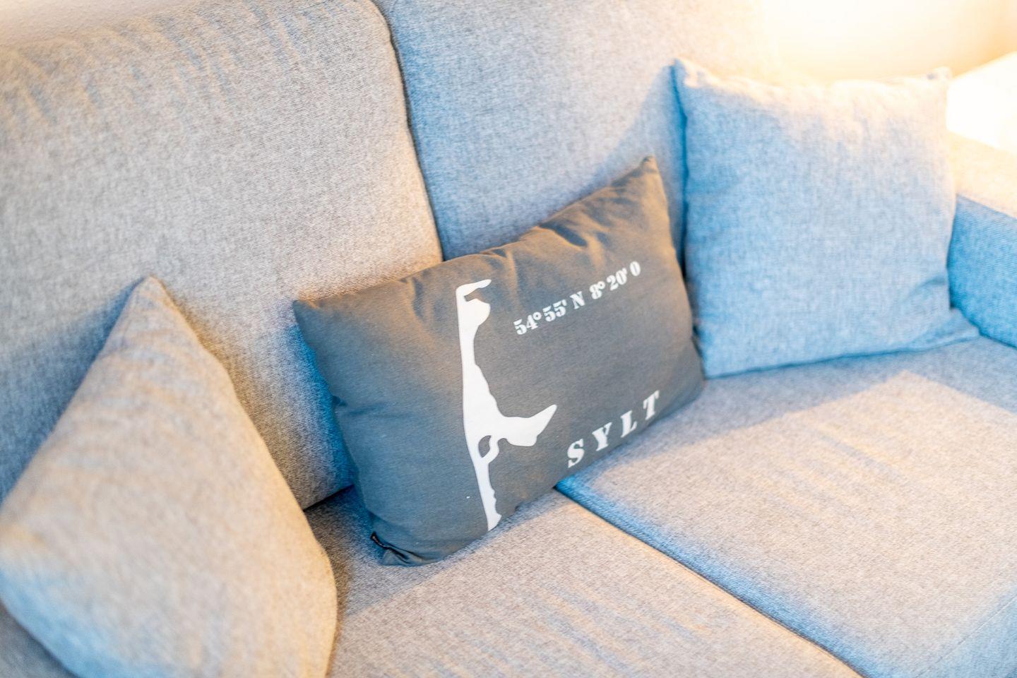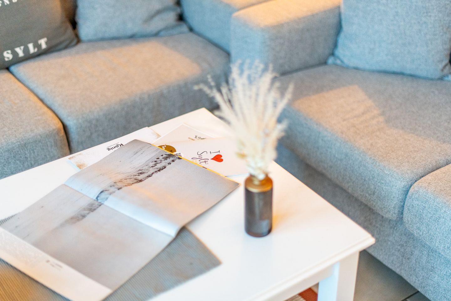 Das helle Wohnzimmer ist mit einem großzügigen Sofa, TV und einem Esstisch für 4 Personen ausgestattet. Der direkte Zugang zum Süd-Balkon erlaubt Ihnen, die frische Nordseeluft und den traumhaften Ausblick über das Wattenmeer bis nach Keitum zu genießen – der perfekte Ort für entspannte Stunden unter freiem Himmel.