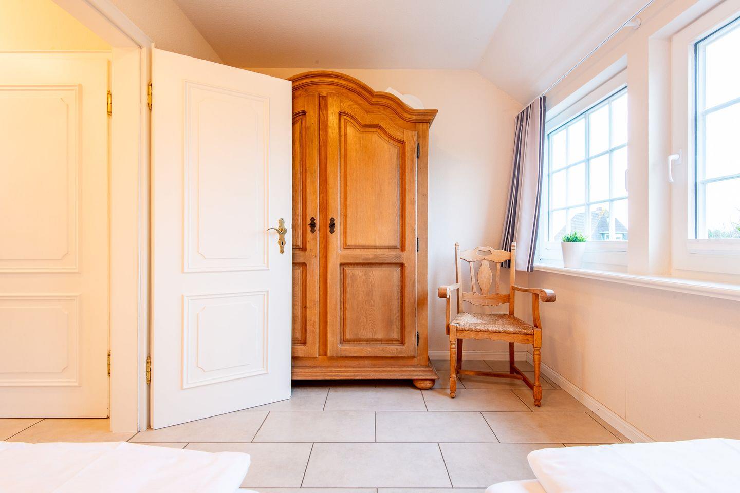 Im ersten Schlafzimmer finden Sie ein komfortables Doppelbett (2x 100x200 cm), einen TV und geräumige Einbauschränke. Das zweite Schlafzimmer verfügt über zwei Einzelbetten (je 90x200 cm) und einen Kleiderschrank – ideal für erholsame Nächte.