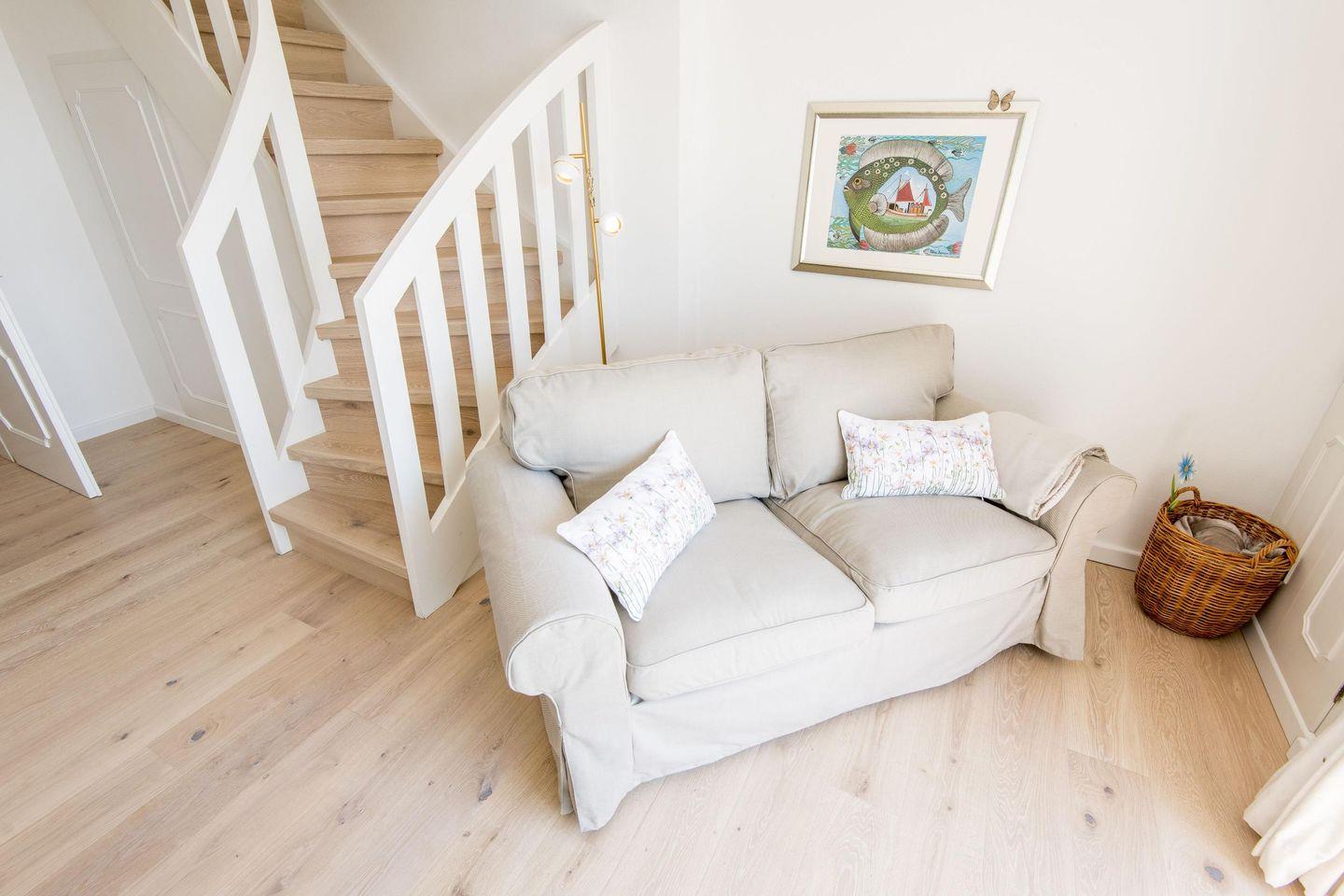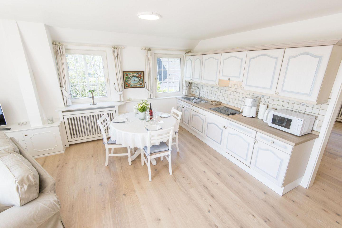 Das gemütliche Wohnzimmer ist der perfekte Ort zum Entspannen. Ob auf dem komfortablen Sofa mit einem guten Buch oder bei einem gemeinsamen Filmabend – hier lässt es sich wunderbar abschalten. Der angrenzende Essbereich mit Platz für 4 Personen lädt zu gemeinsamen Mahlzeiten ein, während die offene Gestaltung ein luftiges Raumgefühl schafft. Der direkte Zugang zum Balkon mit freiem Blick aufs Wattenmeer ermöglicht es, die Ruhe der Natur zu genießen und den Alltag hinter sich zu lassen.