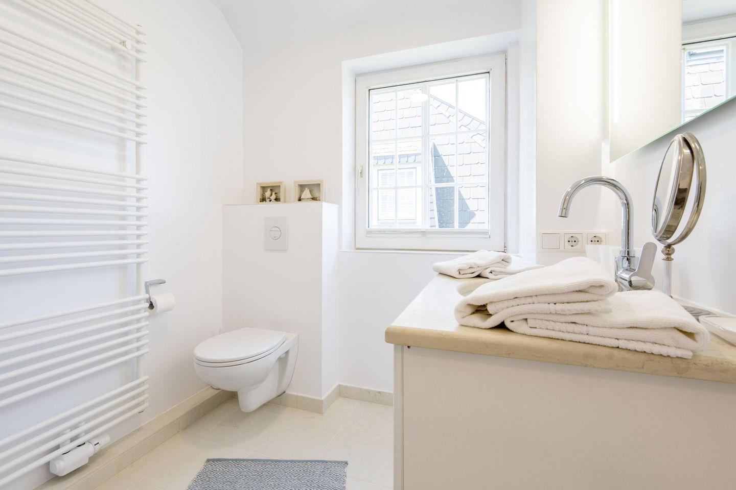Das stilvolle Badezimmer ist mit Natursteinfliesen gestaltet und verfügt über eine bodengleiche Dusche, WC und Tageslicht. Ein Ort zum Frischmachen und Entspannen – perfekt, um den Tag angenehm zu beginnen oder entspannt ausklingen zu lassen.