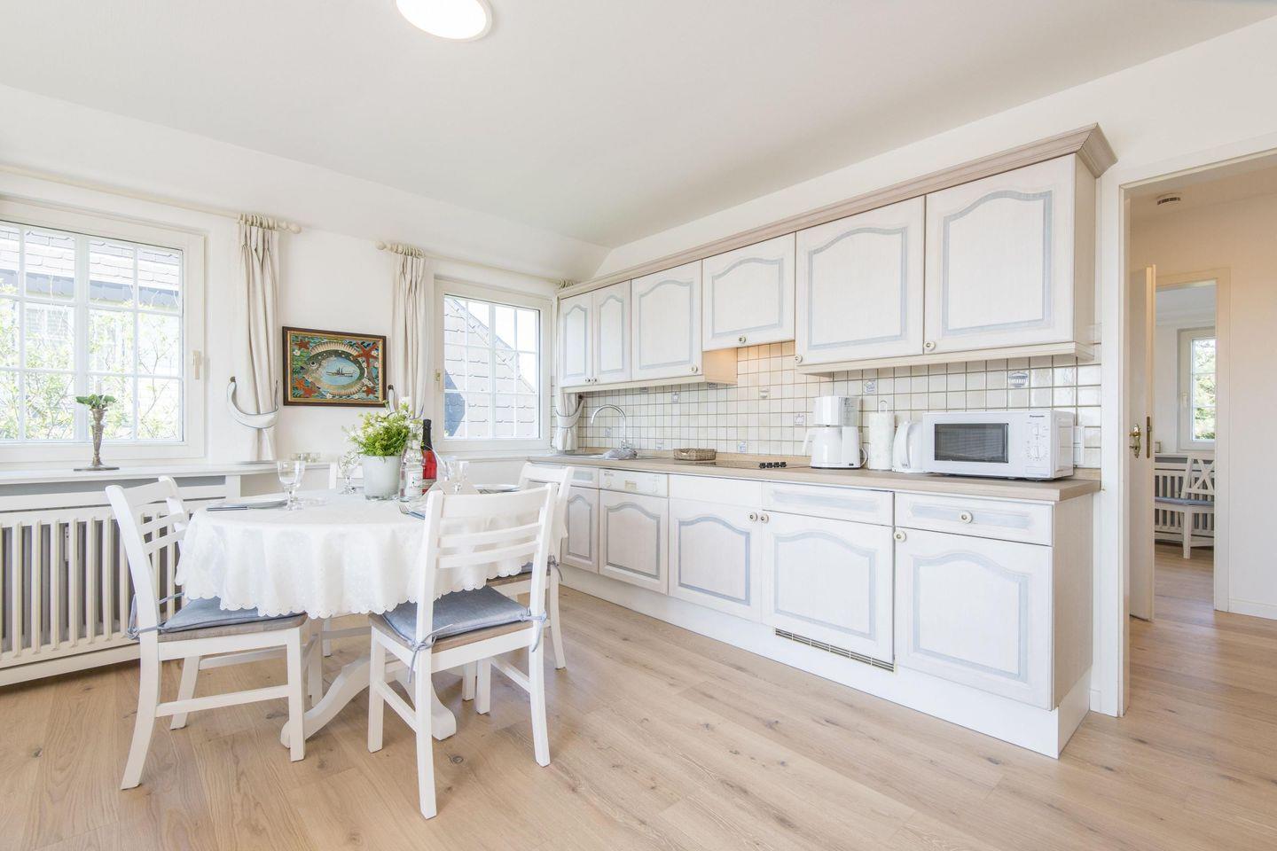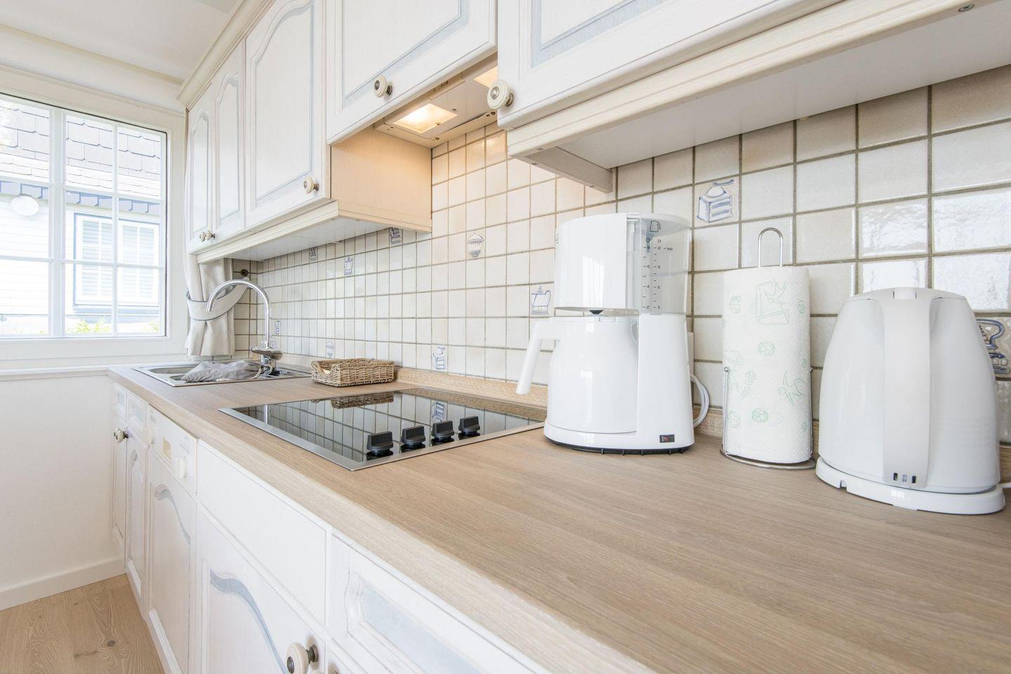 Die moderne, offene Küche bietet eine hochwertige Ausstattung und lässt keine Wünsche offen. Mit Filterkaffeemaschine, Geschirrspüler und Waschmaschine ist alles vorhanden, um den Aufenthalt so komfortabel wie möglich zu gestalten. Die Küche lädt dazu ein, eigene kulinarische Kreationen zu zaubern und die gemeinsame Zeit in vollen Zügen zu genießen.