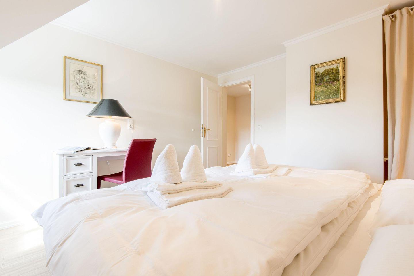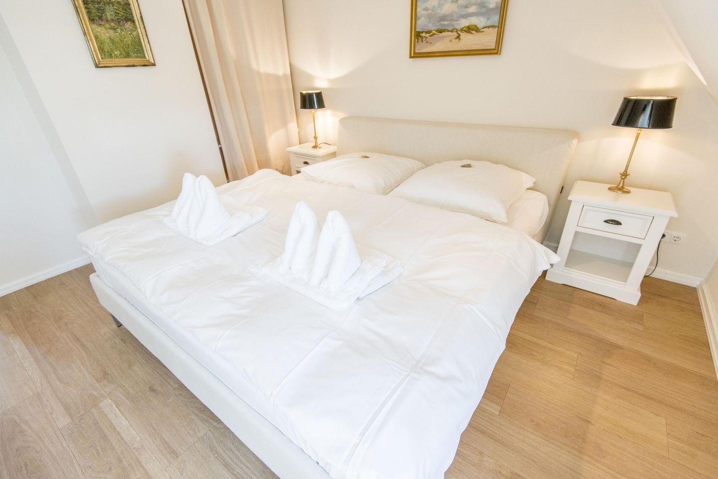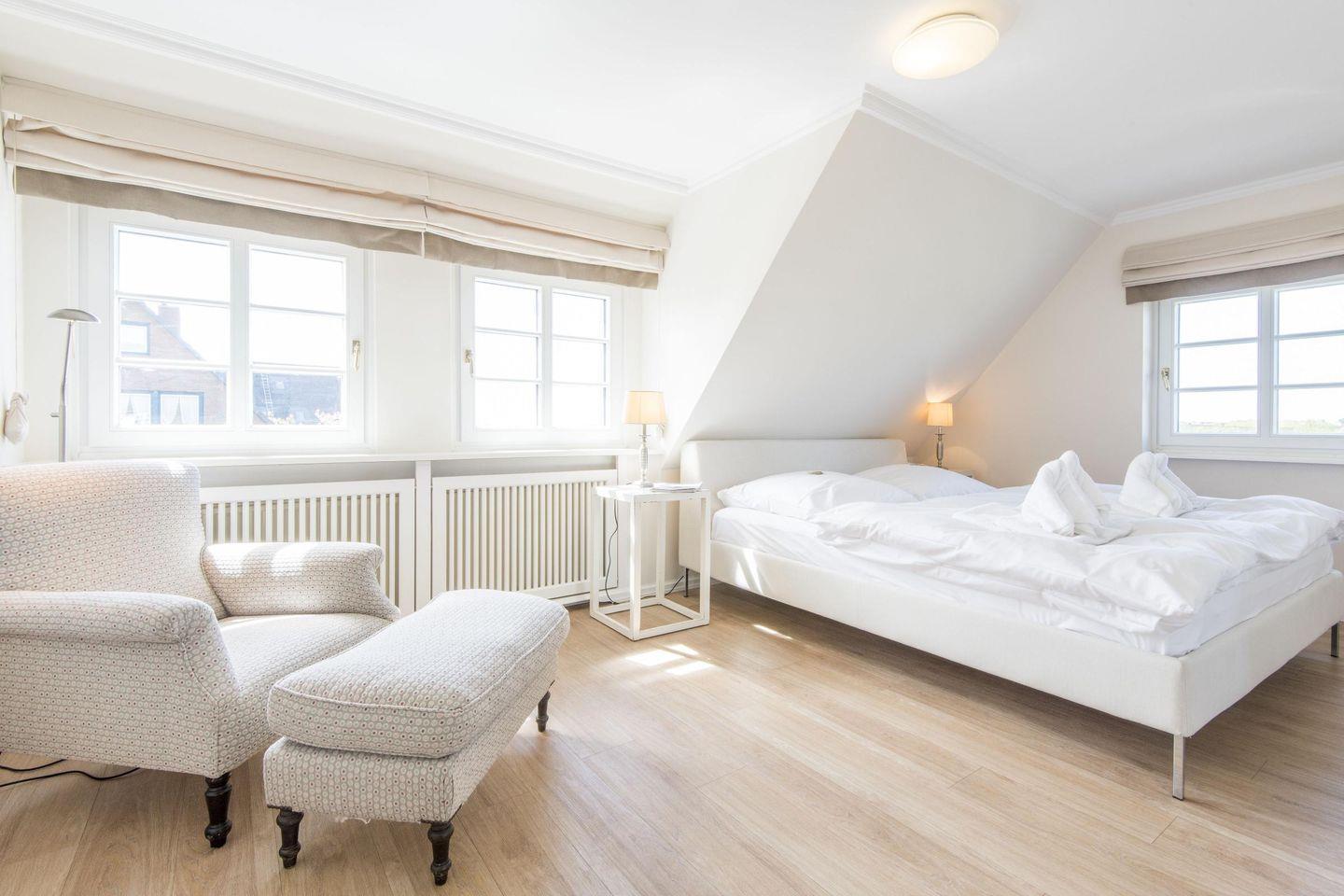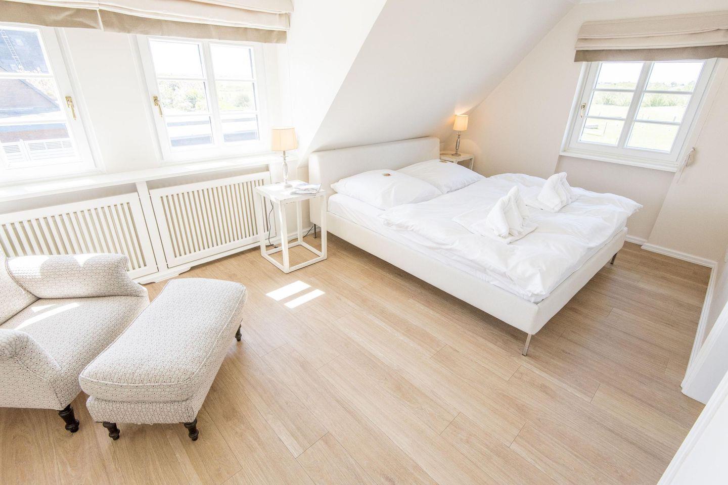 Das Hauptschlafzimmer ist mit einem großzügigen Doppelbett (180x200 cm) und einem Sessel ausgestattet und bietet einen atemberaubenden Blick über die Pferdekoppeln bis hin zu den Dünen von Westerland. Ein angrenzendes Ankleidezimmer mit Einbauschränken sorgt für ausreichend Stauraum.