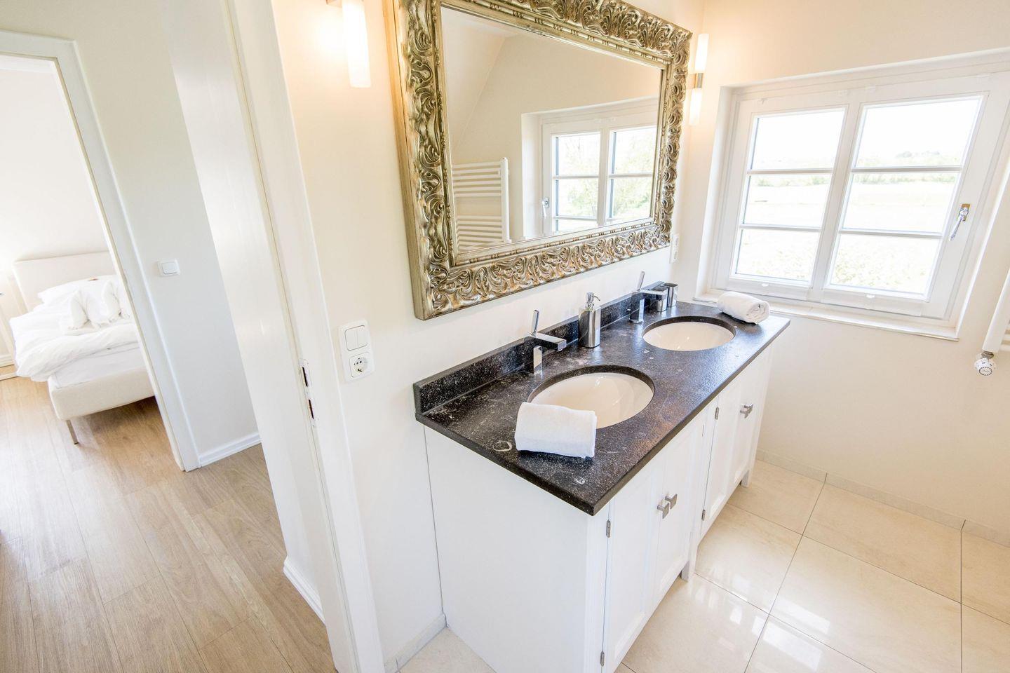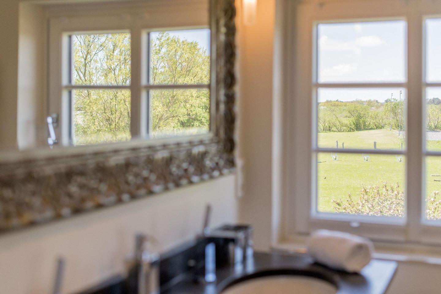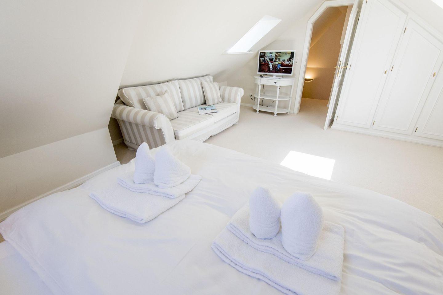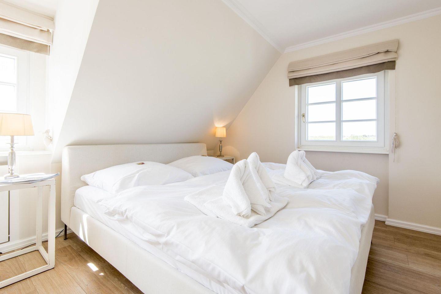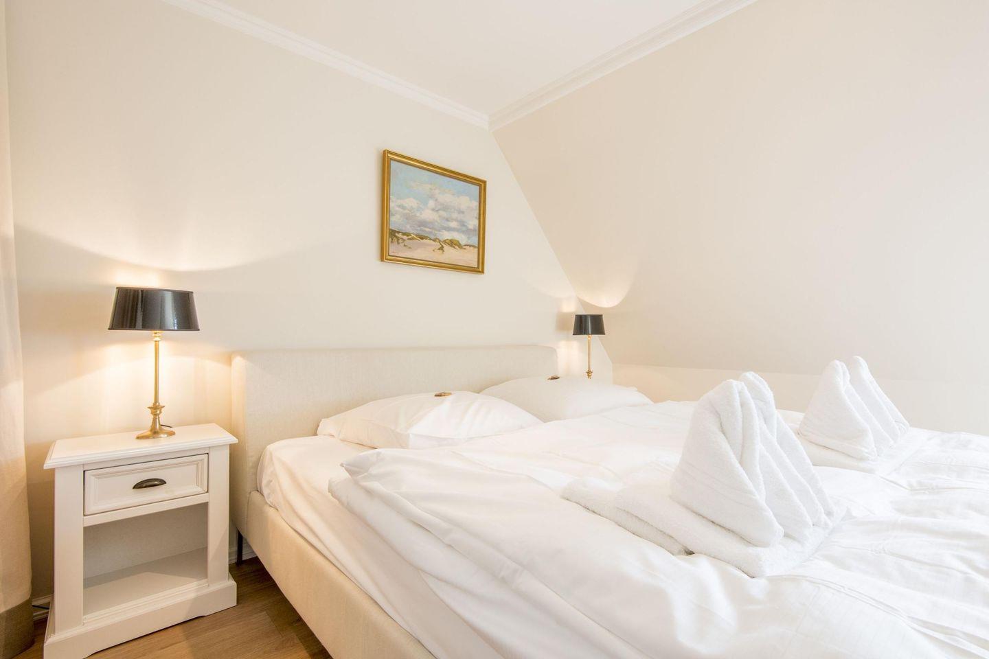 Das Hauptschlafzimmer ist mit einem großzügigen Doppelbett (180x200 cm) und einem Sessel ausgestattet und bietet einen atemberaubenden Blick über die Pferdekoppeln bis hin zu den Dünen von Westerland. Ein angrenzendes Ankleidezimmer mit Einbauschränken sorgt für ausreichend Stauraum.