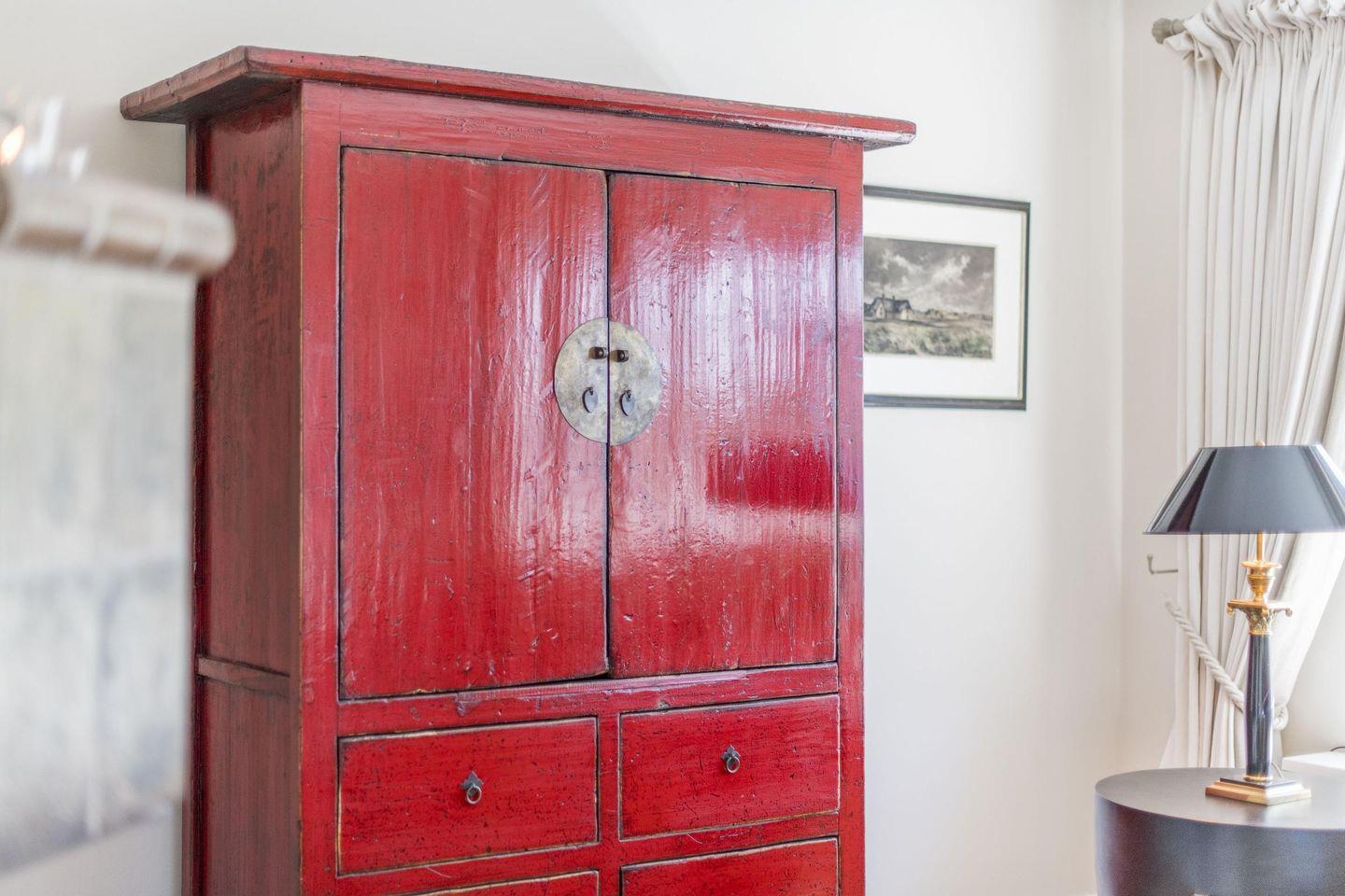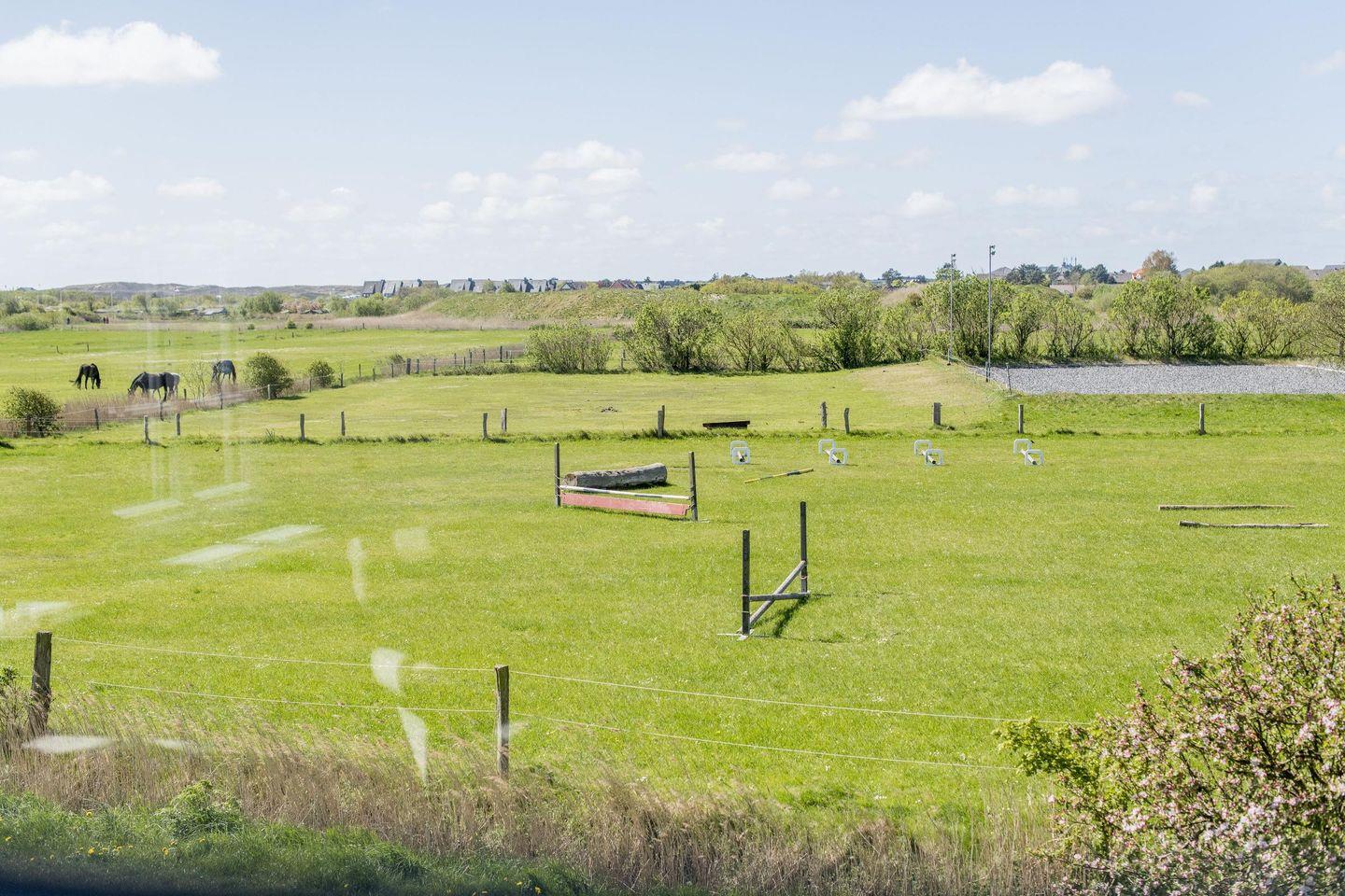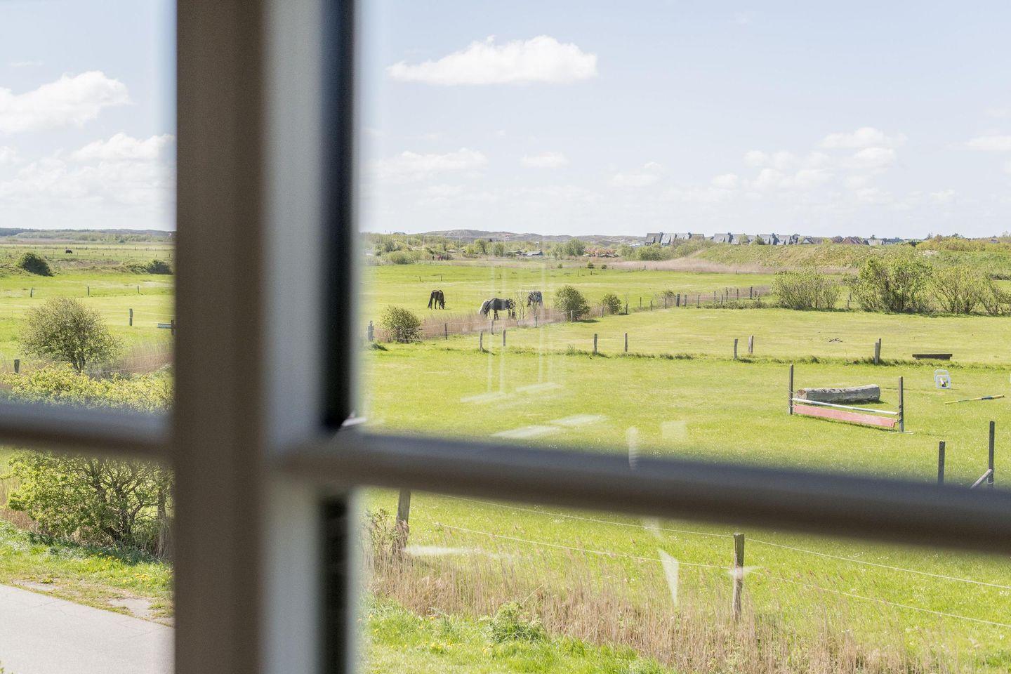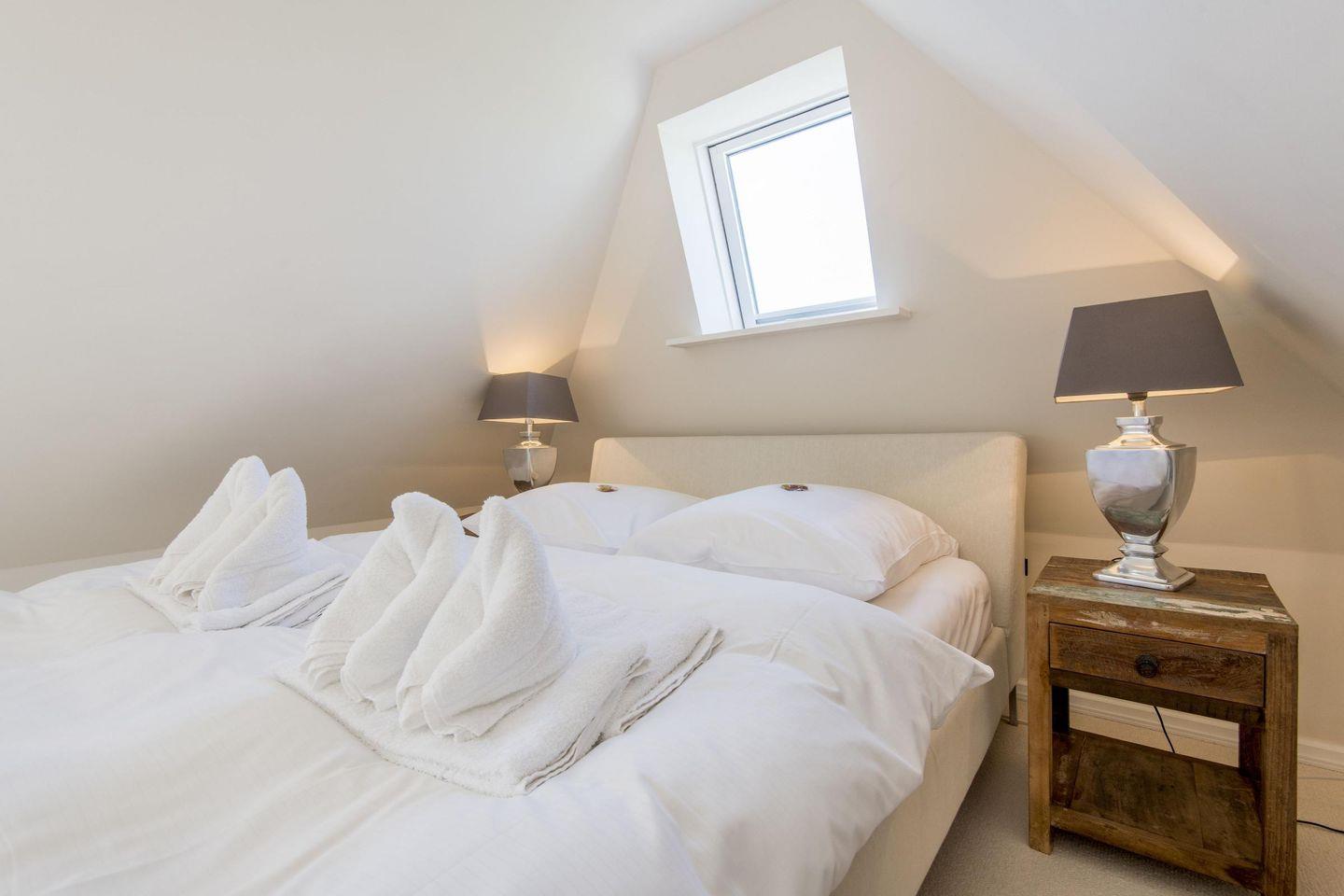 Das Hauptschlafzimmer ist mit einem großzügigen Doppelbett (180x200 cm) und einem Sessel ausgestattet und bietet einen atemberaubenden Blick über die Pferdekoppeln bis hin zu den Dünen von Westerland. Ein angrenzendes Ankleidezimmer mit Einbauschränken sorgt für ausreichend Stauraum.