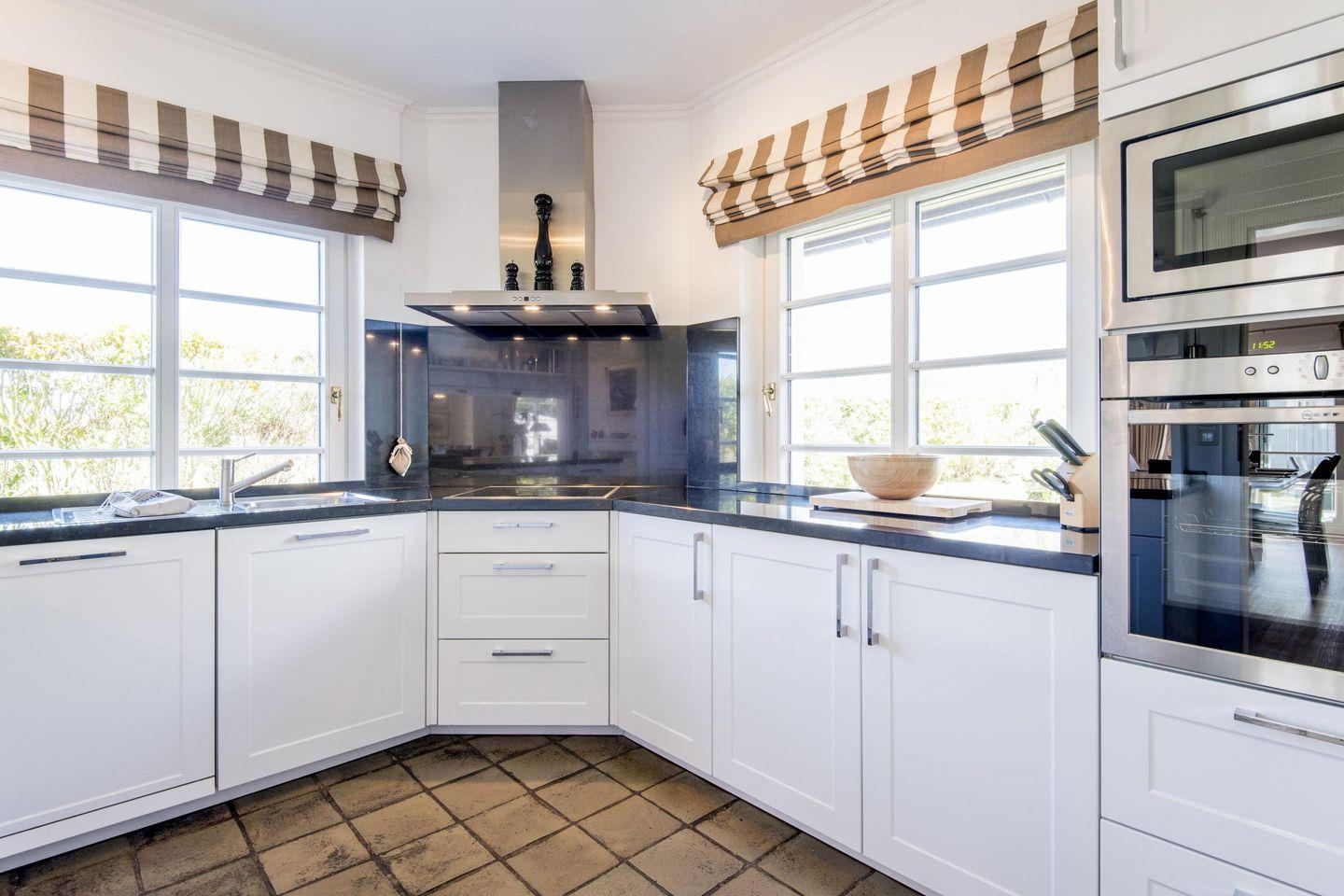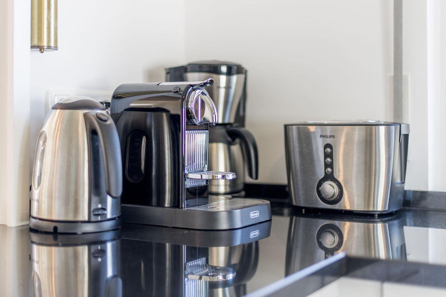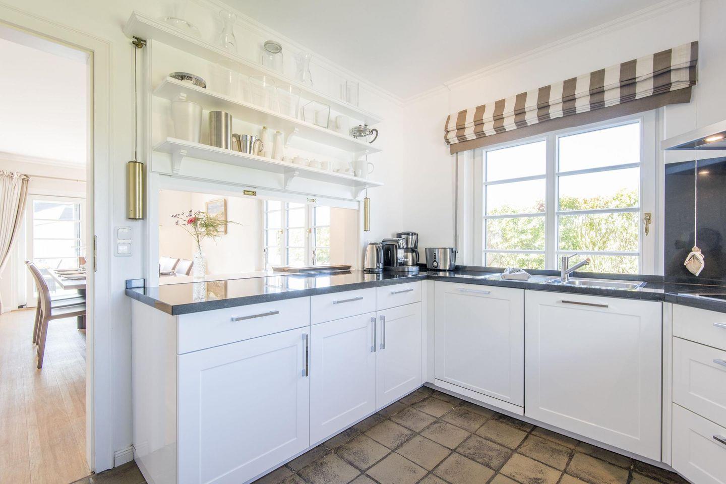 Die voll ausgestattete Küche ist hochwertig eingerichtet und verfügt über einen 4-flammigen Herd, Geschirrspüler und zusätzlichen Komfort durch eine Durchreiche zum Esszimmer. Eine Nespresso-Maschine von DeLonghi und eine Filterkaffeemaschine sorgen für Kaffeegenuss nach Wunsch.