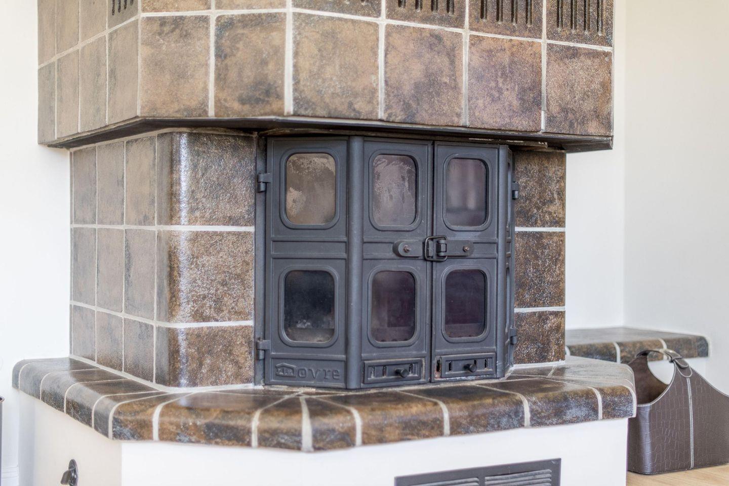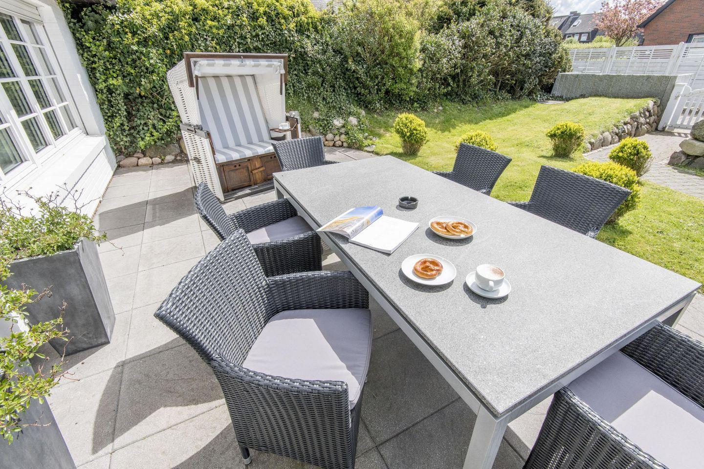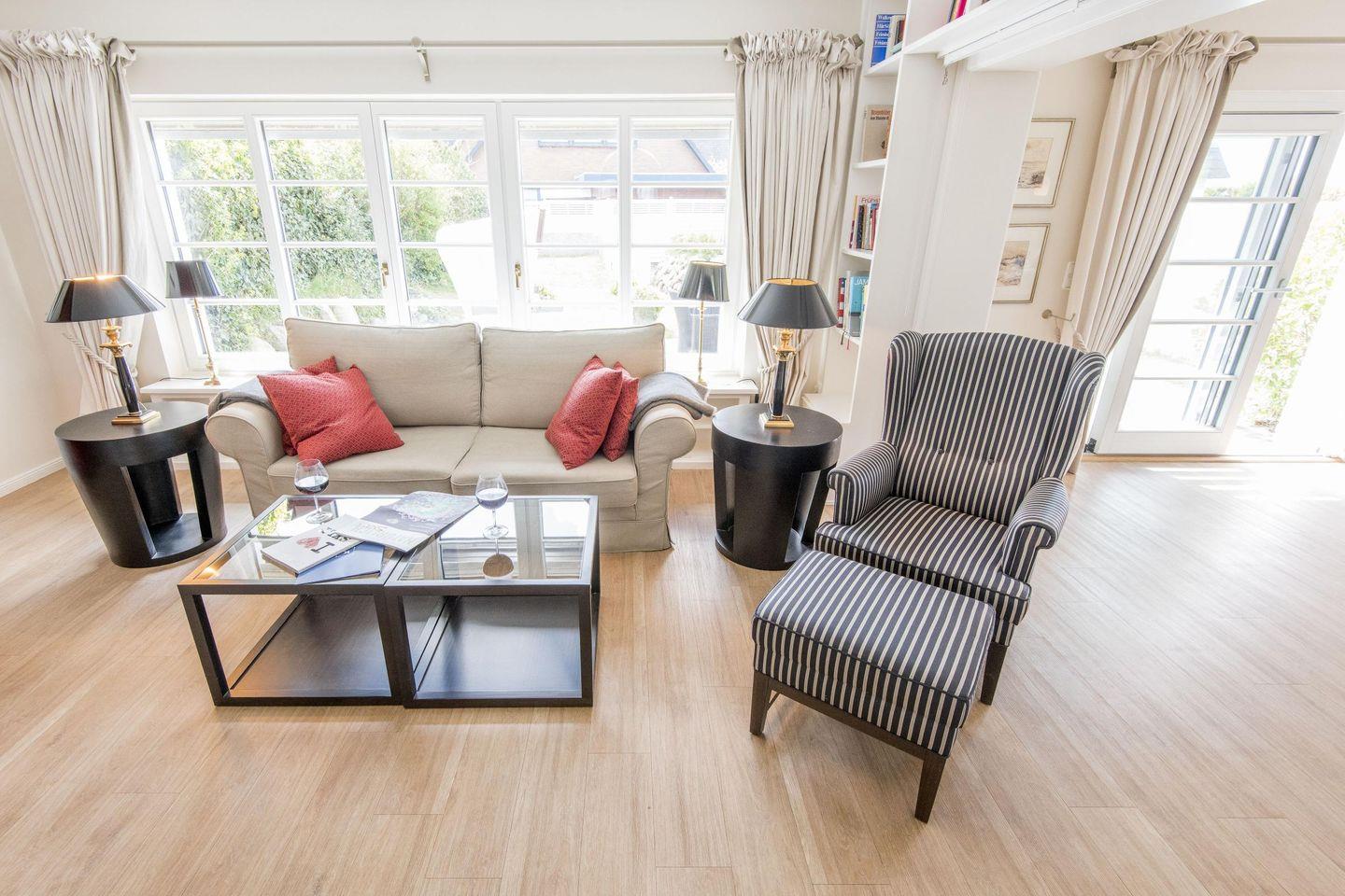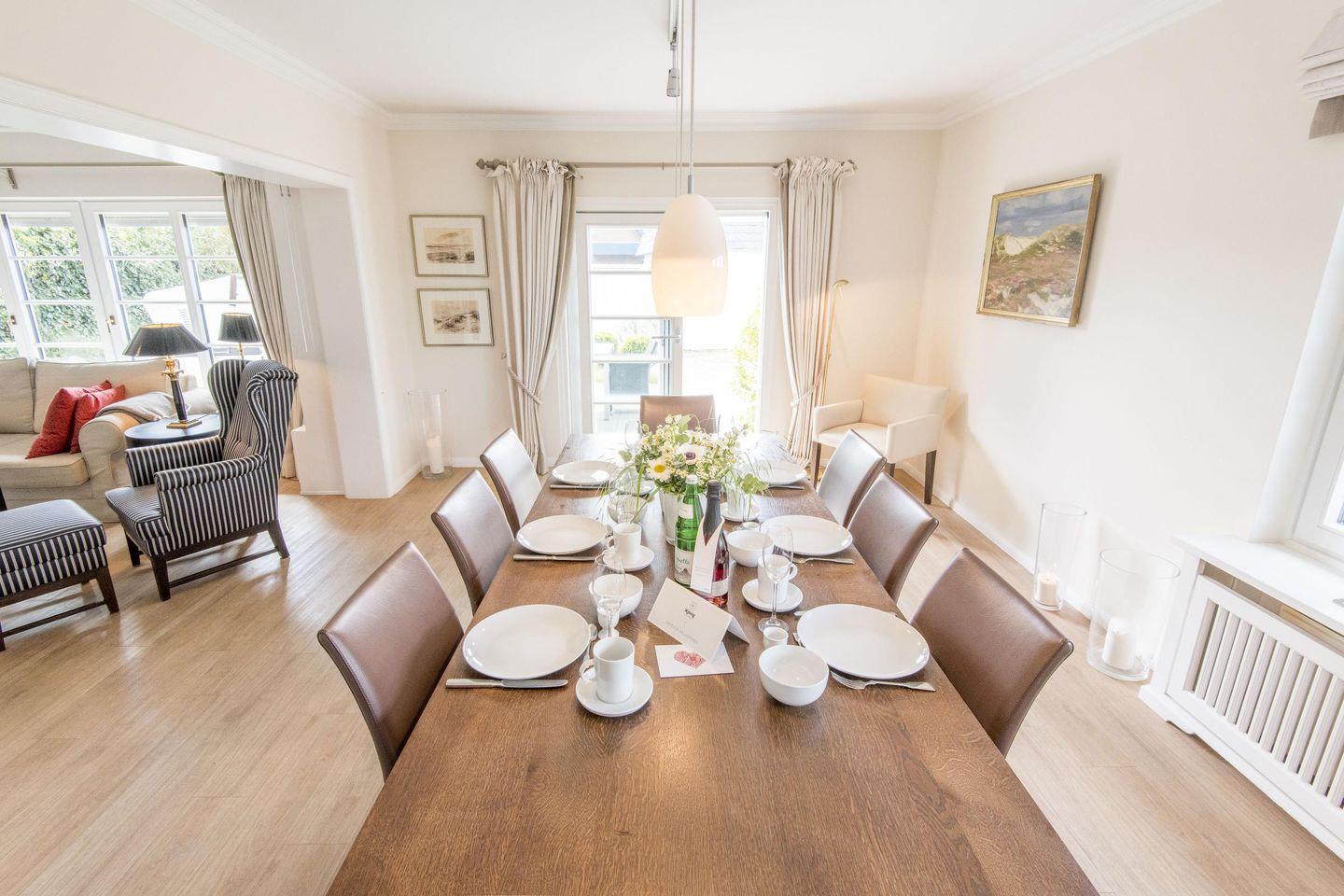 Das helle, stilvoll eingerichtete Wohnzimmer lädt mit seinem kompakten Kaminofen, einem Schlafsofa (130x200 cm), einem gemütlichen Sessel und einem Flat-Screen-TV in antiker Schrankverkleidung zu entspannten Stunden ein. Ein angrenzender Essbereich mit einem großen Tisch für bis zu 8 Personen bietet ideale Voraussetzungen für gemeinsame Mahlzeiten. Durch die Terrassentür gelangen Sie direkt in den liebevoll gestalteten Garten mit nach Süden ausgerichteter Terrasse, Gartenmöbeln und einem Strandkorb (April bis Oktober).