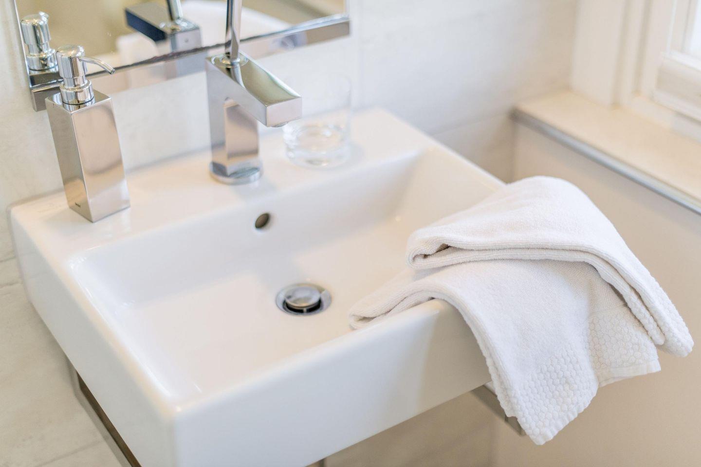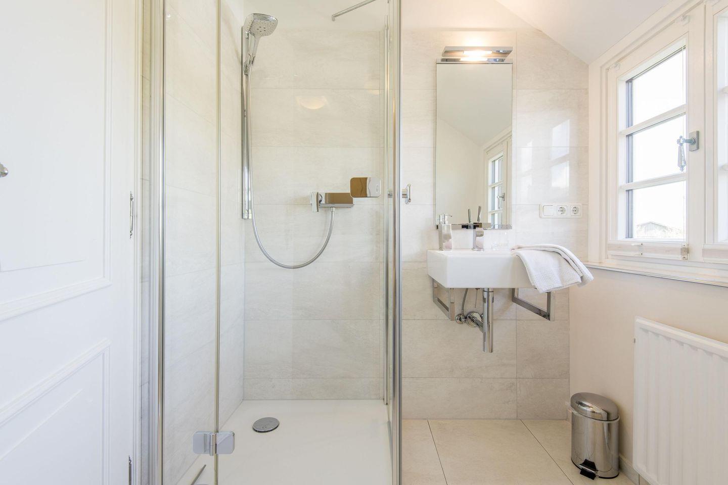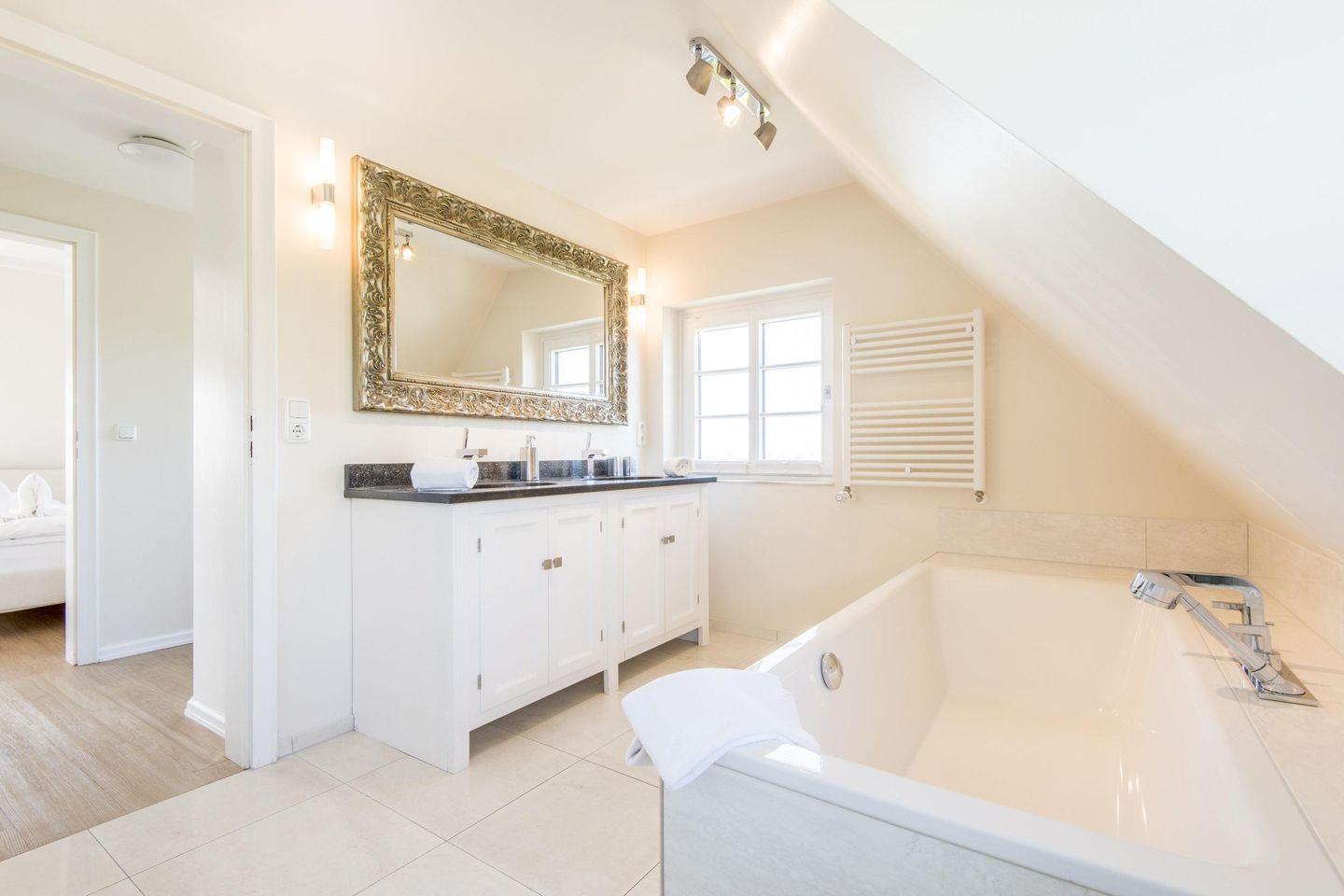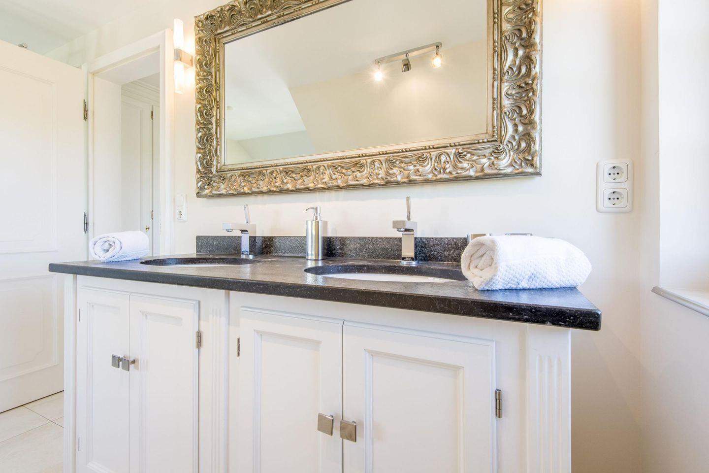 Das Hauptbadezimmer im Obergeschoss ist ein luxuriöses Vollbad mit einer Badewanne, ebenerdiger Regendusche, WC, zwei Waschbecken, Handtuchwärmer und Tageslicht. Das zweite Badezimmer ist ein modernes Duschbad mit Regendusche, WC und Föhn, ebenfalls mit Tageslicht. Ein Gäste-WC im Eingangsbereich ergänzt den Komfort.