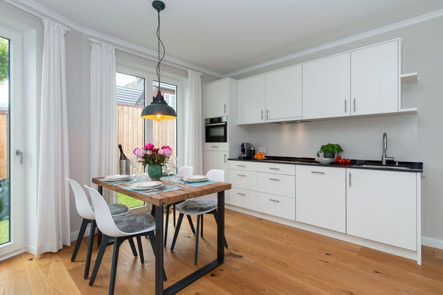 Die Wohnung liegt ebenerdig im Erdgeschoss und verfügt über eine Terrasse mit mittelgroßen Garten. Das Grundstück beinhaltet jeweils einen PKW-Stellplatz mit (ab spätestens August) einer Elektrozapfsäule sowie Fahrradständer. Die im nordischen Stil möblierten Wohnungen verfügen über massive Eichendielenböden, hochwertige tischlergearbeitete Küchen und Einbaumöbel sowie Bäder mit Yellow-Stone Fliesen. Eine Fußbodenheizung ist in allen Räumen vorhanden.