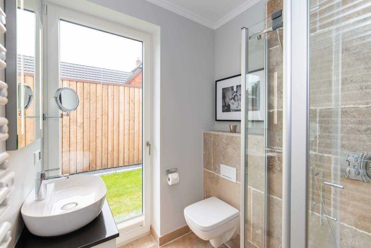 Auf den sonnenverwöhnten Terrassen laden Strandkorb und andere Gartenmöbel zum Verweilen ein. Ein kleiner Elektrogrill wird an Sommerabenden den Wohlfühlfaktor ebenfalls steigern.