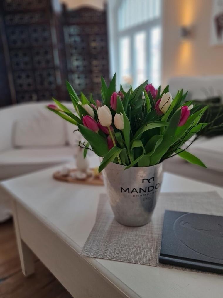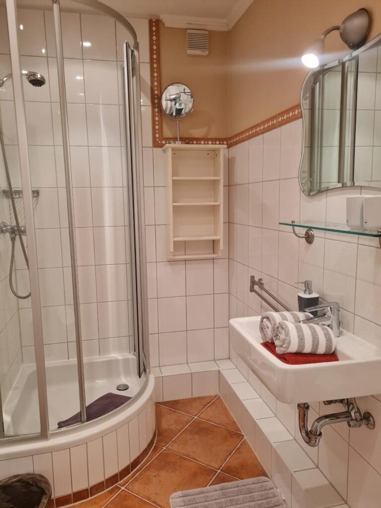 Das Zimmer befindet sich im 2 Obergeschoss. Holzboden, helle Möbel und nicht zuletzt der besondere Charme des Hauses gehören zu den Räumlichkeiten. Die Badezimmer in unserem Gästehaus sind alle topmodern und selbstverständlich in sehr gepflegtem Zustand.