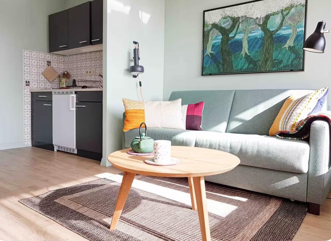 - Wohnbereich mit Küchenzeile, Essbereich und gemütlicher Couch-Ecke (Schlafcouch 140 x 200 cm)