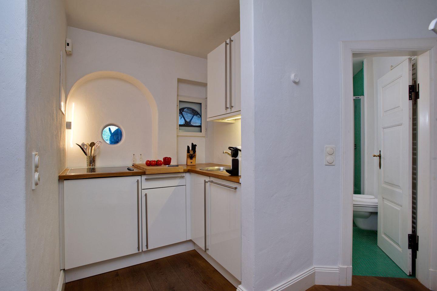 Ausgelegt mit schönen Eichen-Landhausdielen genießen Sie hier ein einmaliges Ambiente, welches zum Wohlfühlen einlädt. Die kleine, separate Küchenzeile wurde modern und mit allen Annehmlichkeiten liebevoll ausgestattet. Besonders praktisch ist der vorhandene Geschirrspüler. Zusätzlichen Stauraum finden Sie in der eigenen Ankleide des Studios.