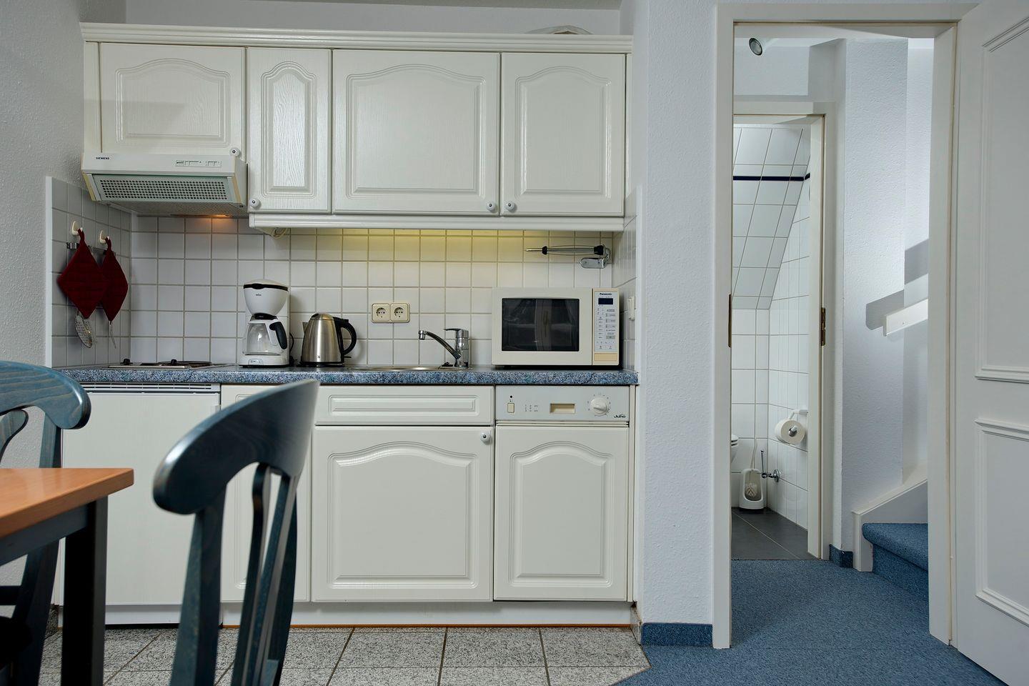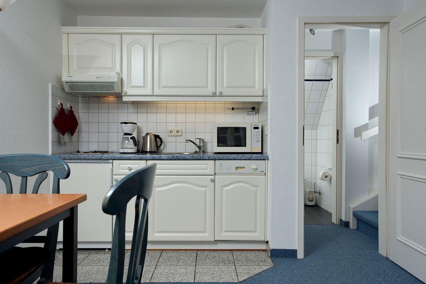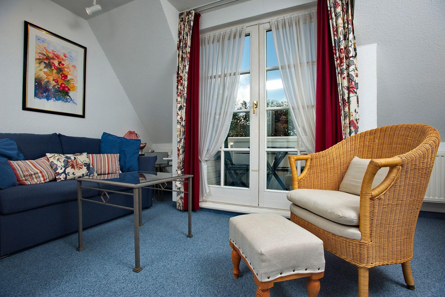 In Alt-Westerland/ Grenze Tinnum, in einer Anlieger- Einbahnstraße, liegt diese schöne 2-Zimmer-Ferienwohnung (ca. 43 qm) für zwei Personen im Obergeschoss des Landhauses "Witt Hingst". Im Obergeschoss befindet sich der Wohnraum mit Schlafcouch, Rattan-Sessel, Essecke, Flat-TV mit integriertem DVD-Player, Radio mit integriertem CD-Player und Bluetooth-Funktion, offene Küchenzeile mit 2-Platten Kochfeld, Geschirrspüler und Mikrowelle. Der kleine, gemütliche Westbalkon mit Tisch und 2 Stühlen ist von hier aus zu erreichen. Ein Duschbad mit Fenster und Haartrockner befindet sich ebenfalls auf dieser Ebene. Im Dachgeschoss liegt das Schlafzimmer mit zwei zusammenstehenden Einzelbetten und Fenster.