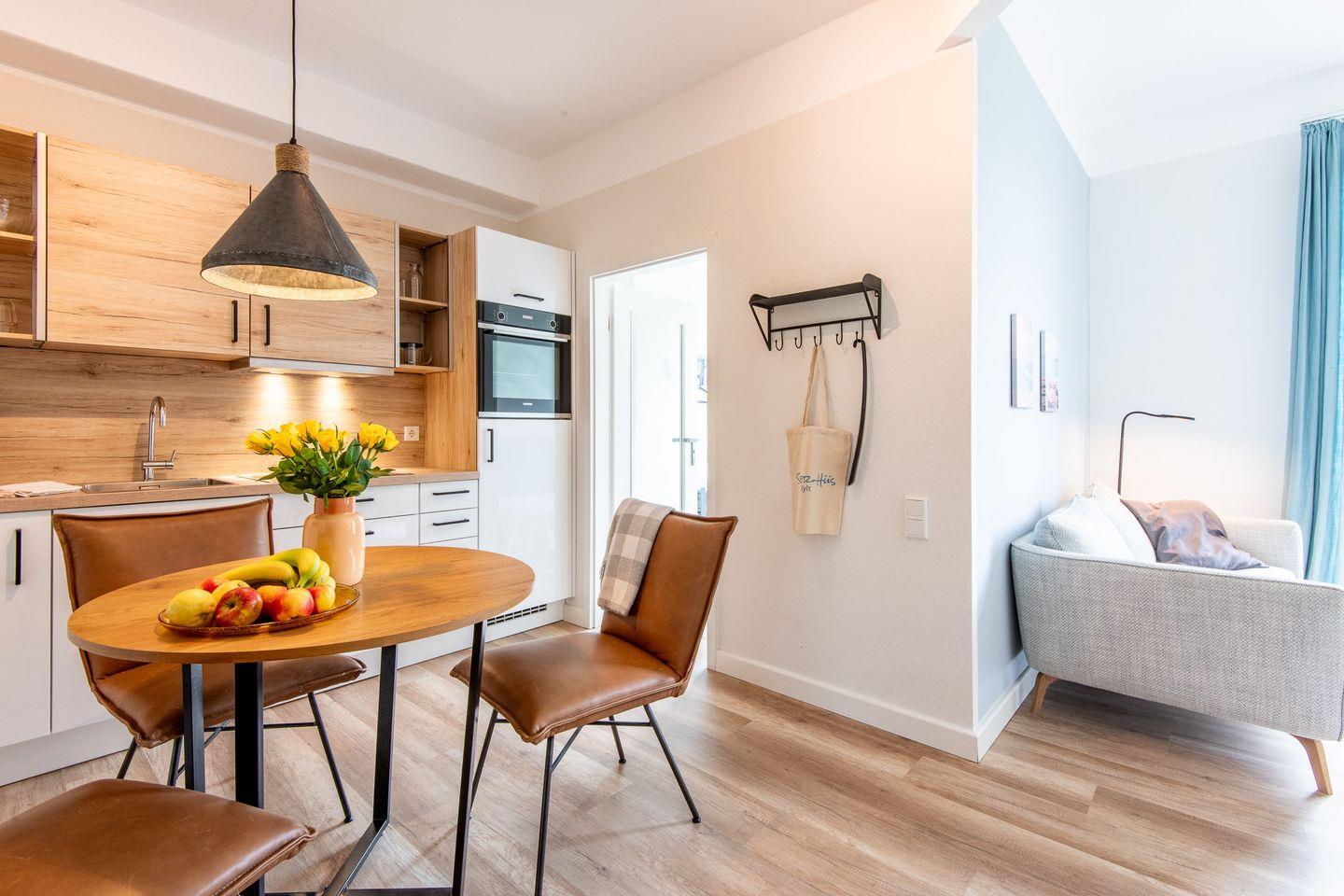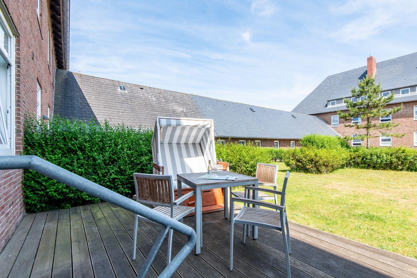 Moderne 3-Zimmer-Ferienwohnung mit Holzterrasse und Garten auf Sylt, ideal für entspannte Urlaubstage.