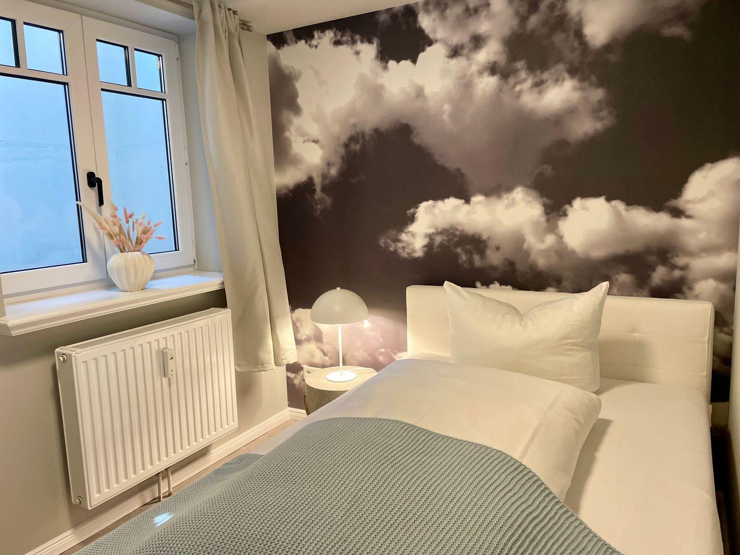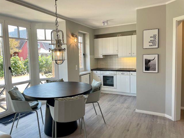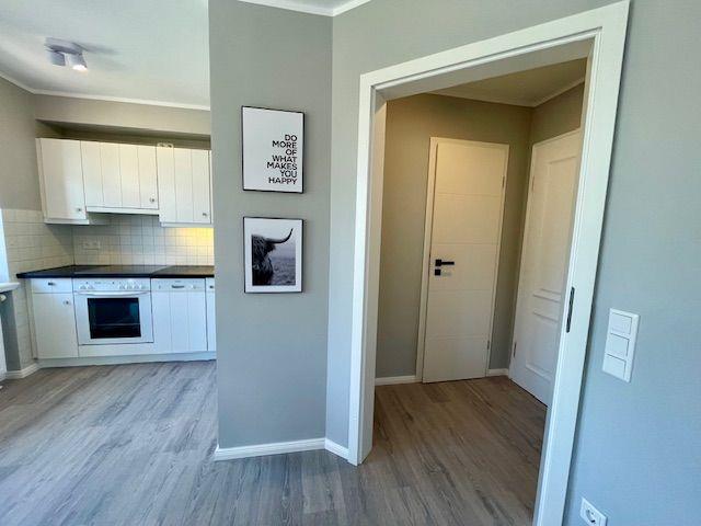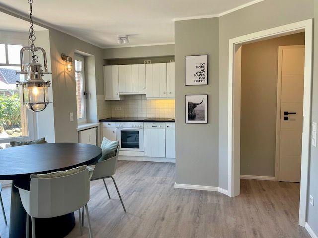Die sehr helle, komplett in 2025 renovierte und gut ausgestattete Wohnung verfügt über ein großes Wohnzimmer mit offener Küche inkl. Backofen und Geschirrspüler, Filterkaffeemaschine und Nespressomaschine, ein Schlafzimmer mit großem Doppelbett (180cm breit) und ein weiteres Schlafzimmer mit großem Einzelbett (120cm breit), ein modernes Duschbad mit Handtuchwärmer, Fußbodenheizung und Walk-In Dusche, ein zusätzliches Gäste WC sowie eine eigene Terrasse mit Strandkorb und Gartenmöbeln.