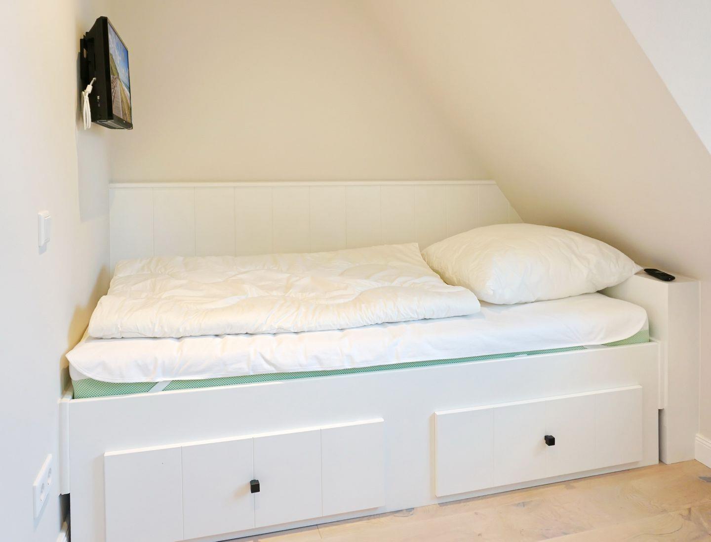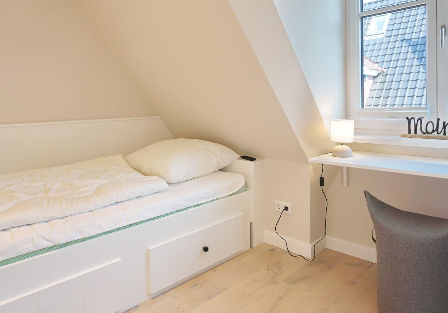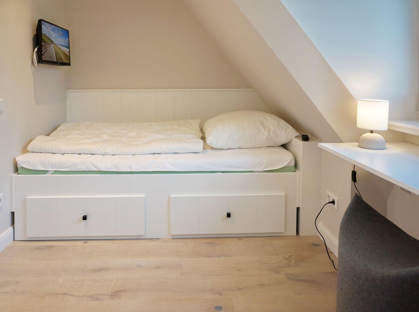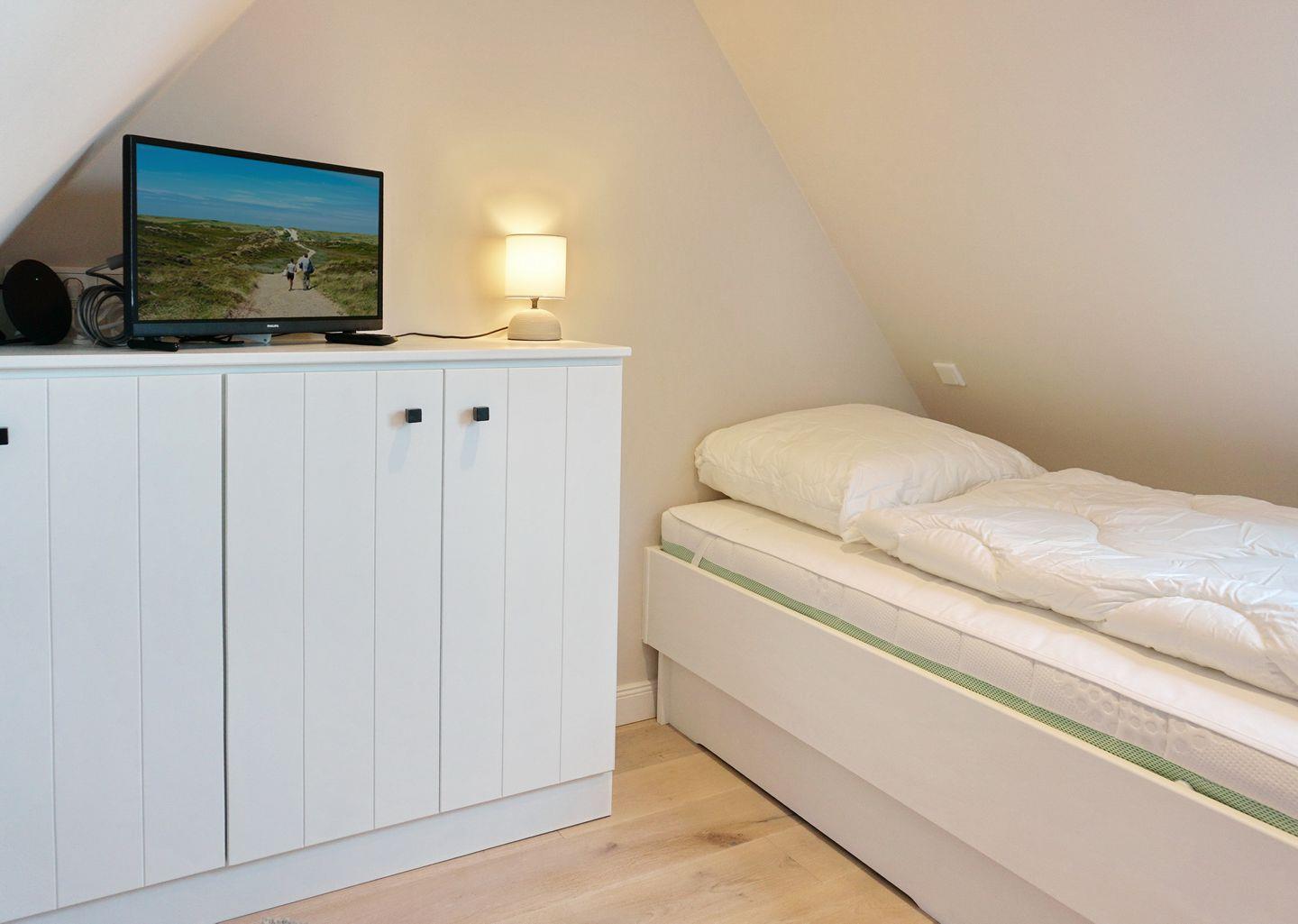 Im Dachgeschoss befindet sich ein gemütlicher Raum mit einem Einzelbett (90 x 200 cm) und einem Fernseher. Auf Wunsch kann optional ein weiteres Bett hinzugefügt werden. Dies muss bei SAS & dem Eigentümer angefragt werden.