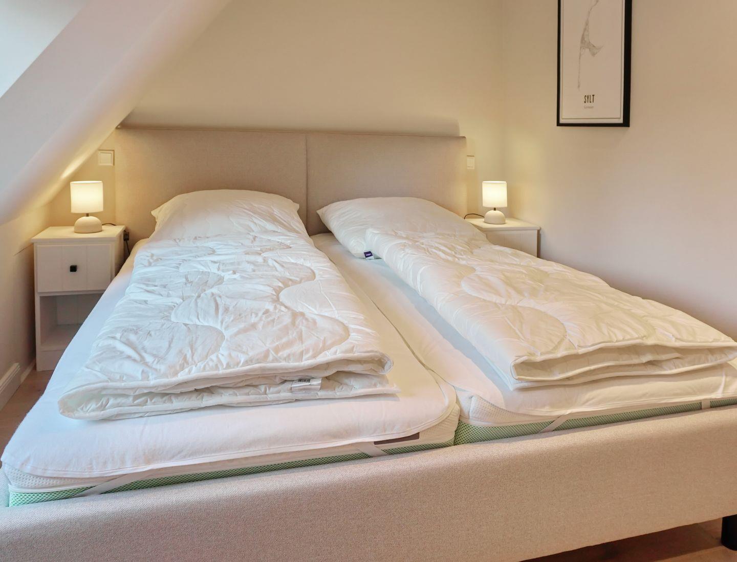Im Obergeschoß befindet sich ein großes Schlafzimmer (180x200cm) mit TV, ein weiterer Schlafraum mit TV und einem Einzelbett (100x200cm) und ein Badezimmer mit Dusche und WC.