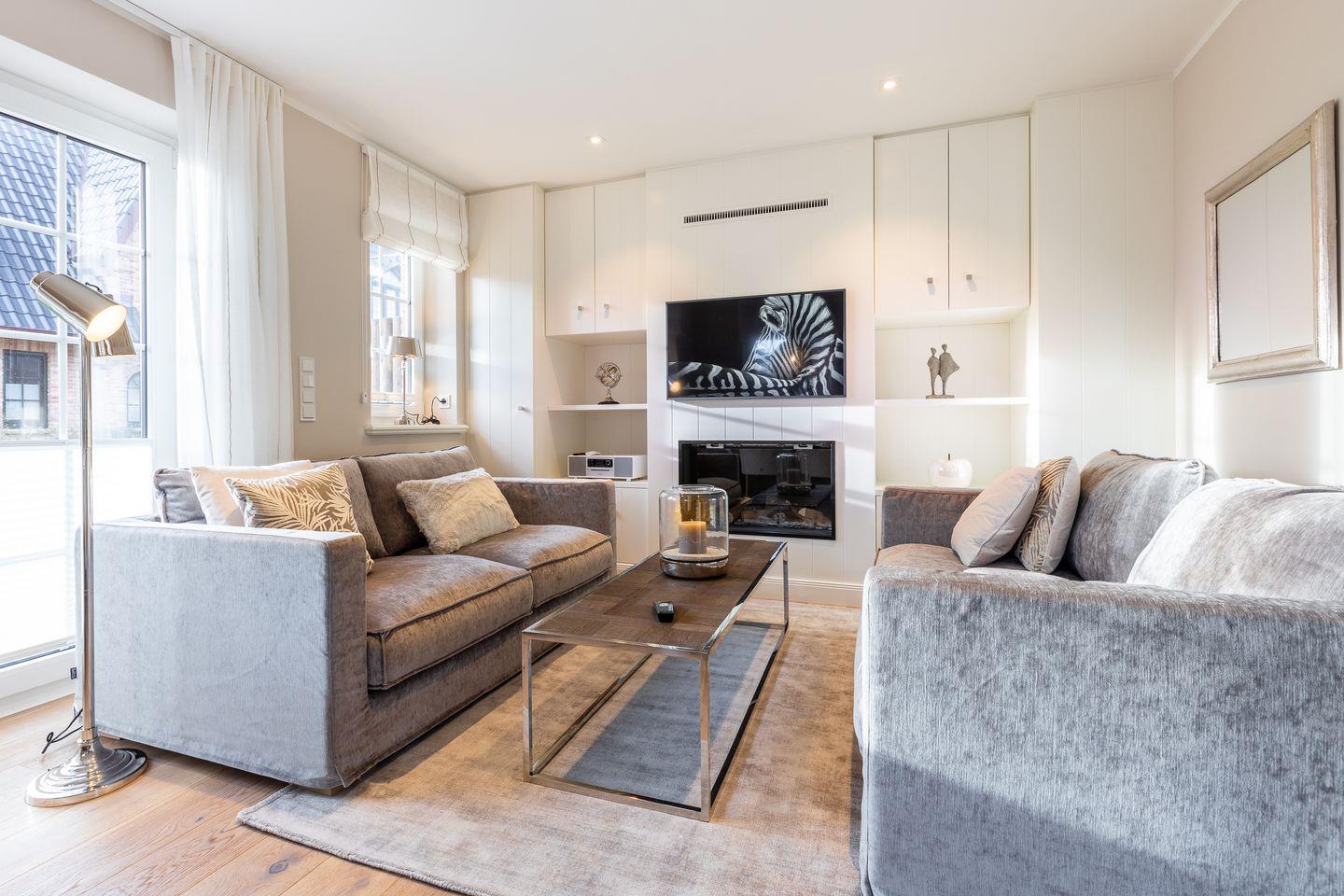 EG: Wohnbereich mit Flatscreen-TV, Gaskamin, W-LAN Anschluss, Radio, Küche mit Mikrowelle, Backofen, Induktionsherd, Geschirrspüler, gekühltem Weinschrank und Kaffeemaschine, Gäste-WC