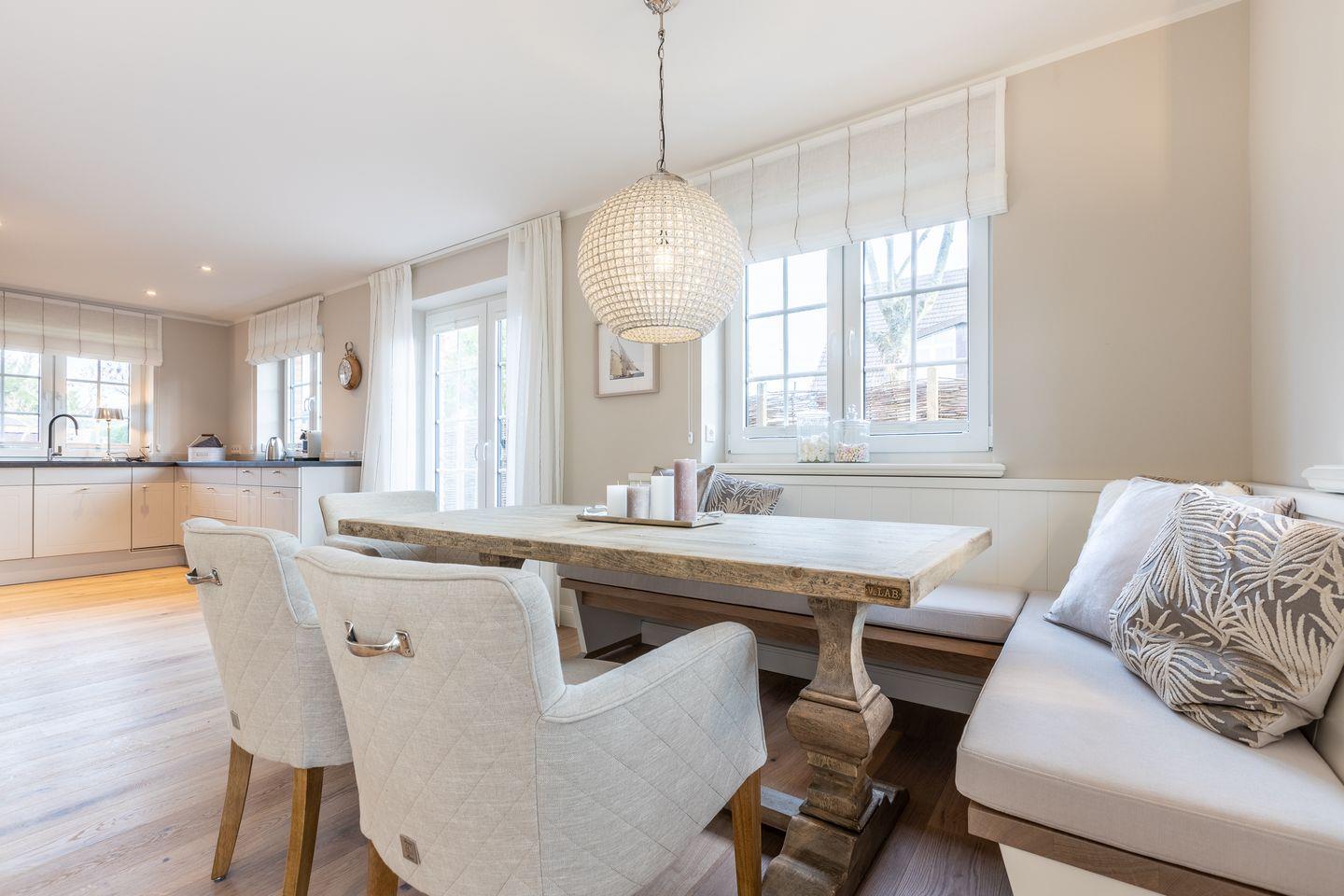 gemütliche Sitzecke in der Nähe des schönen Gaskamins sowie ein zweiter großzügiger Sitzbereich mit einer Eckbank. Vom Wohnbereich