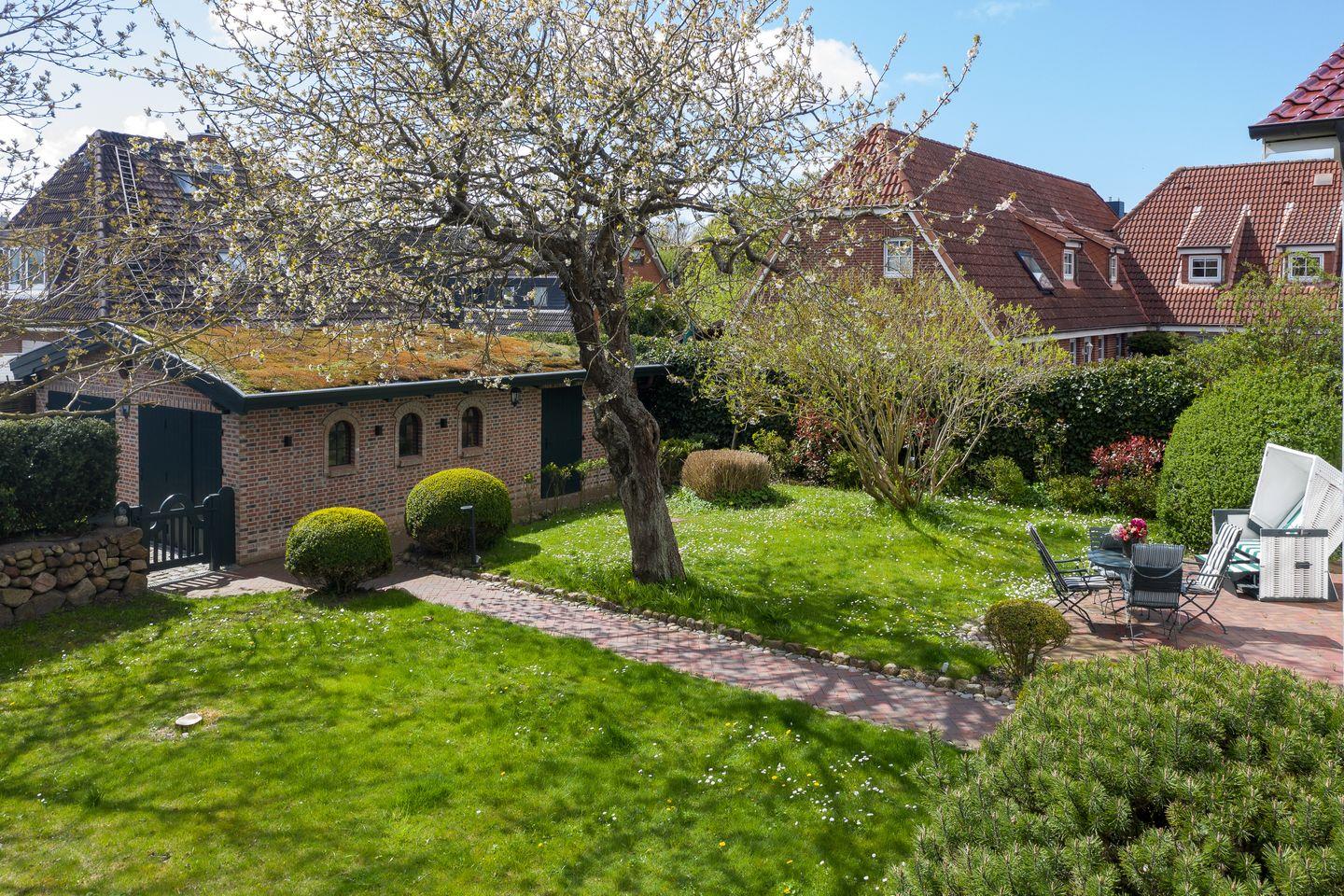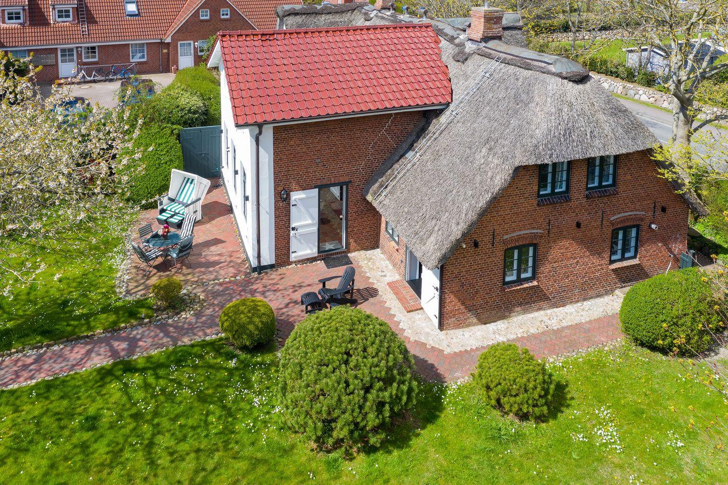 Historisches Reetdachhaus auf Sylt mit Sauna, großem Garten und moderner Ausstattung für einen erholsamen Urlaub.