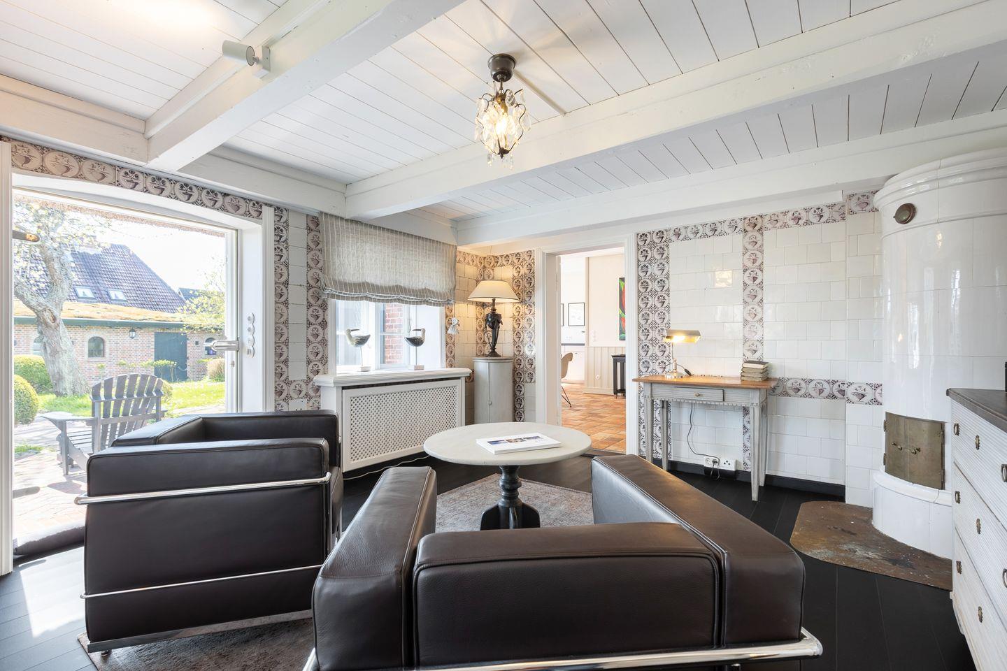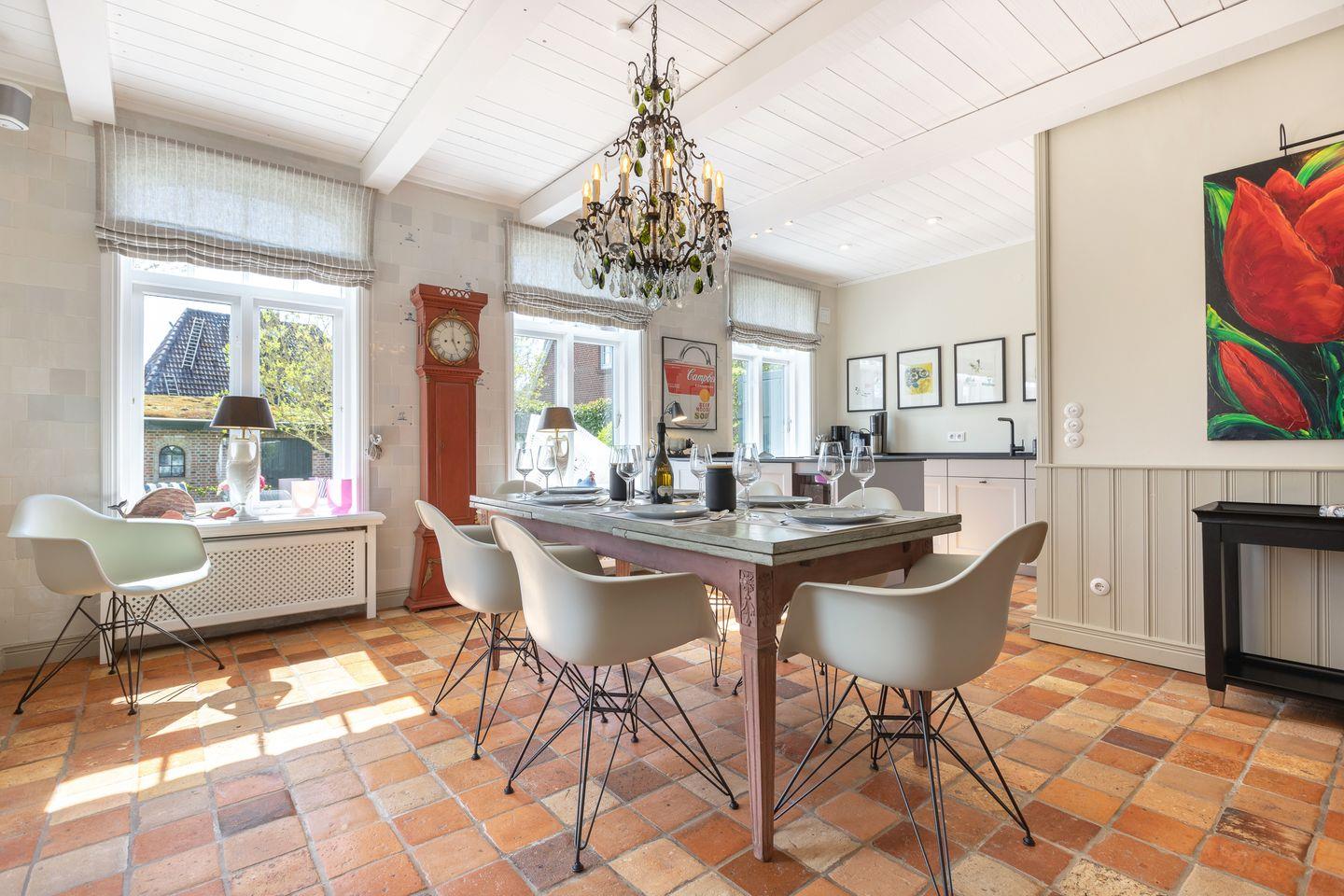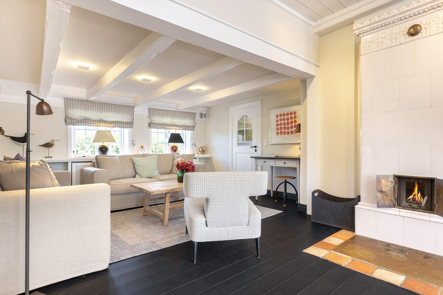 EG: Wohnraum mit Sitzecke, Kachelofen und Essbereich. Offene Küche mit Microwelle-Backofen-Kombi, Geschirrspüler, Induktionsherd, Nespresso-Maschine, Soda-Stream. Separates Fernsehzimmer und Bibliothek. Großer Garten mit Gartenmöbeln und Strandkorb (April-Oktober). Im Gartenhaus befindet sich eine zusätzliche Sauna.