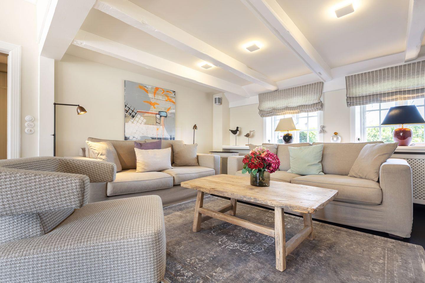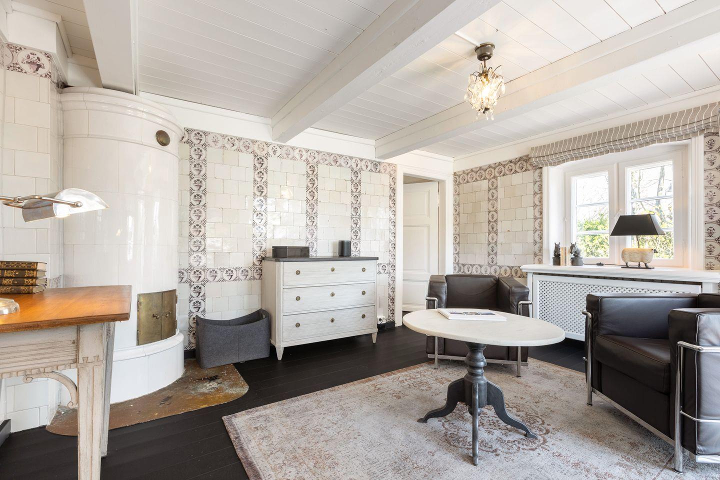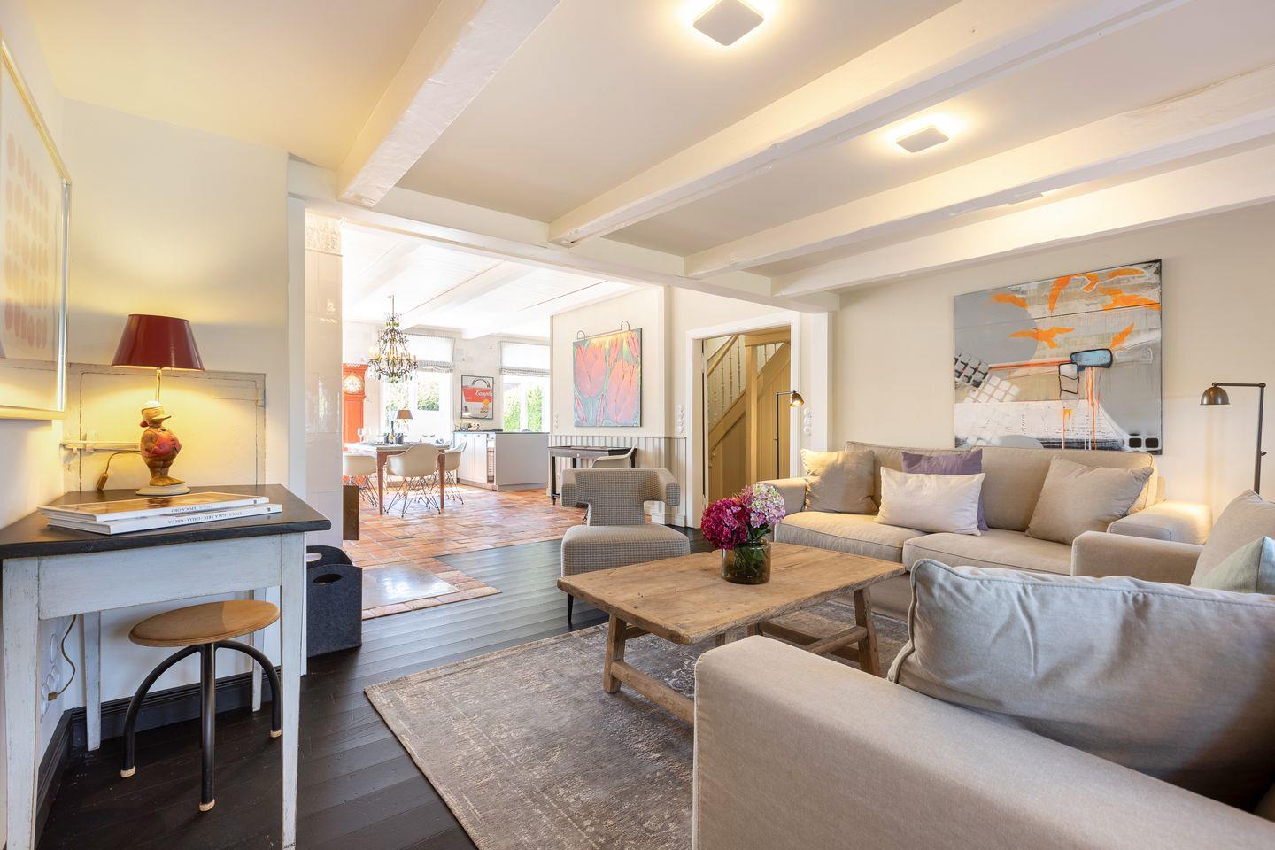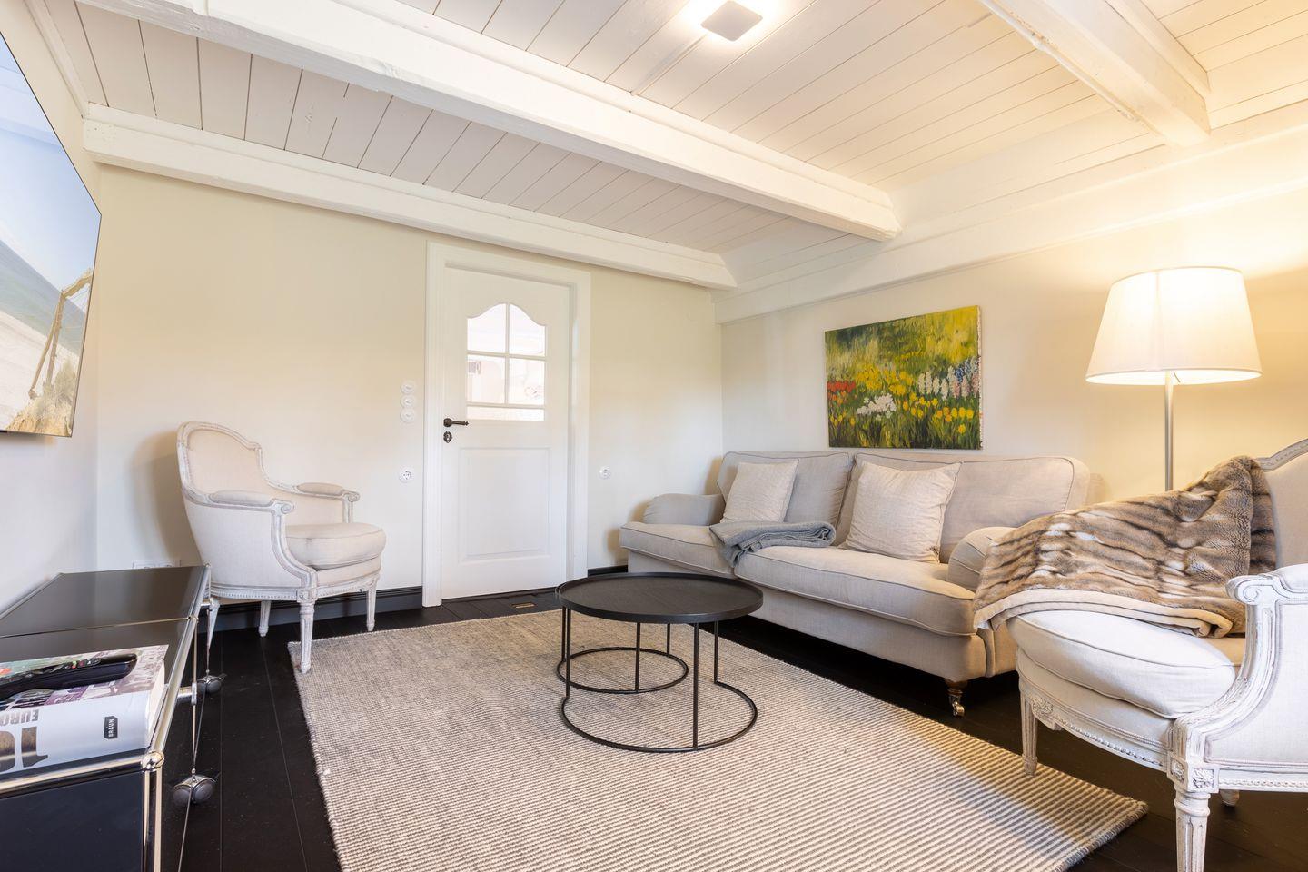 EG: Wohnraum mit Sitzecke, Kachelofen und Essbereich. Offene Küche mit Microwelle-Backofen-Kombi, Geschirrspüler, Induktionsherd, Nespresso-Maschine, Soda-Stream. Separates Fernsehzimmer und Bibliothek. Großer Garten mit Gartenmöbeln und Strandkorb (April-Oktober). Im Gartenhaus befindet sich eine zusätzliche Sauna.