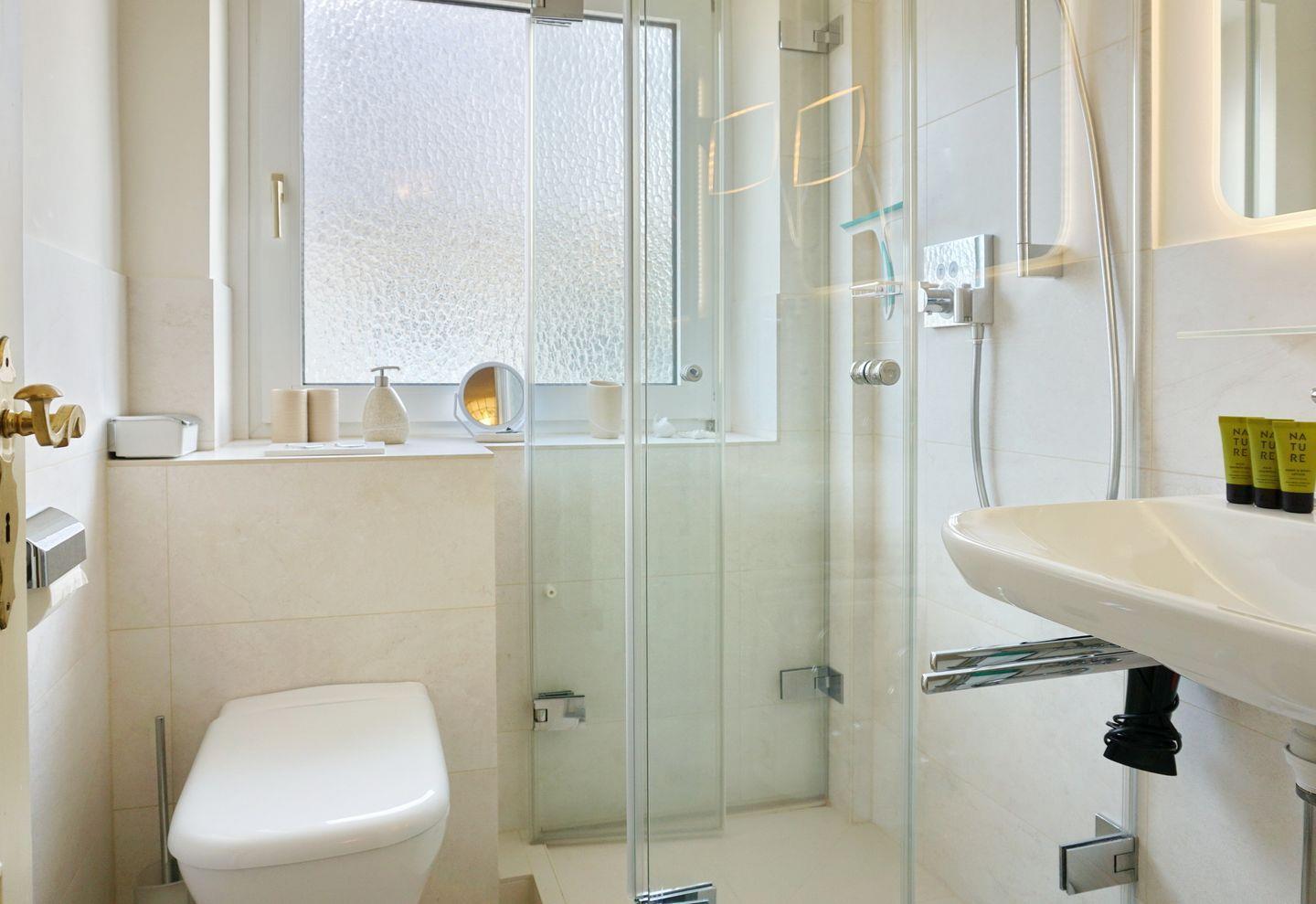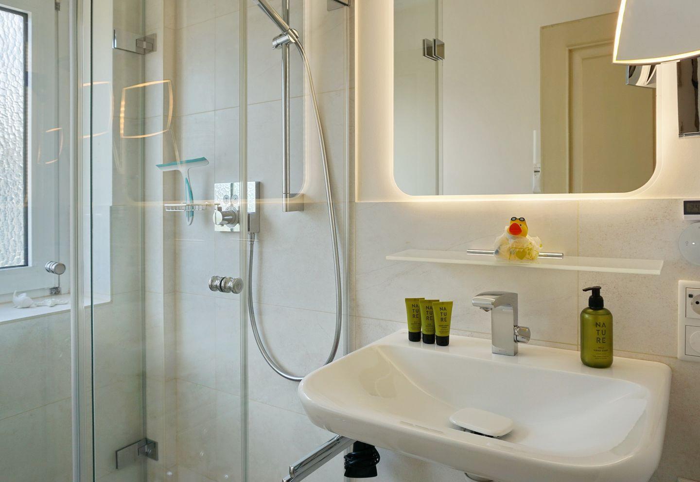 Das Badezimmer bietet Ihnen neben einem modernem Waschtisch und WC eine verglaste Duschkabine (90 x 75), einen beschlagfreier Spiegel, beleuchteten Kosmetikspiegel, elektr. Fußbodenheizung und einen Haartrockner