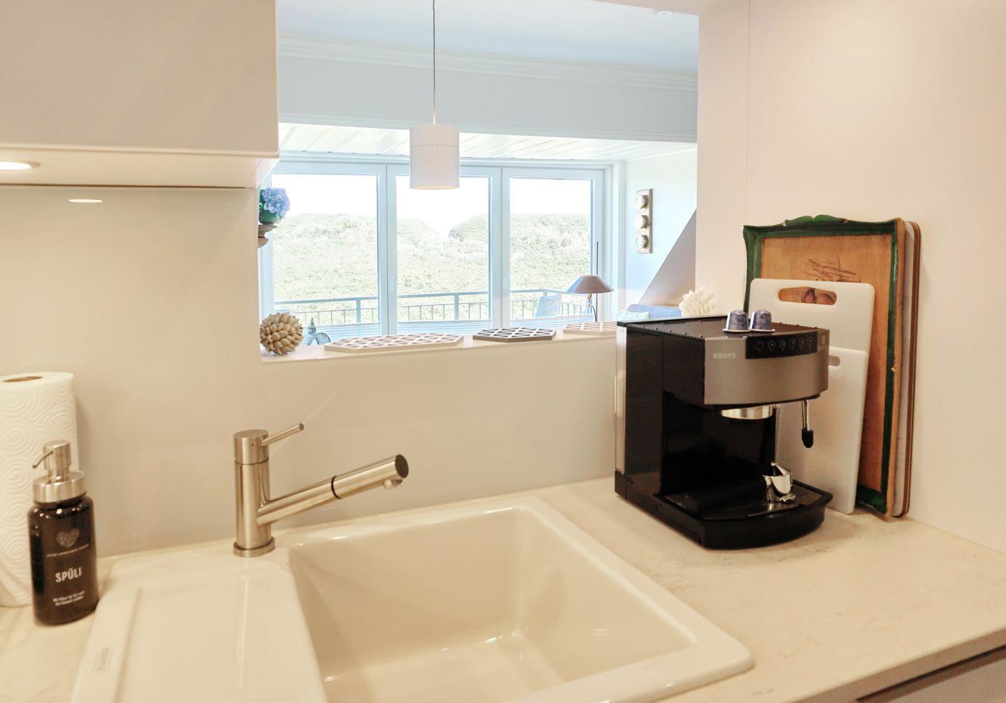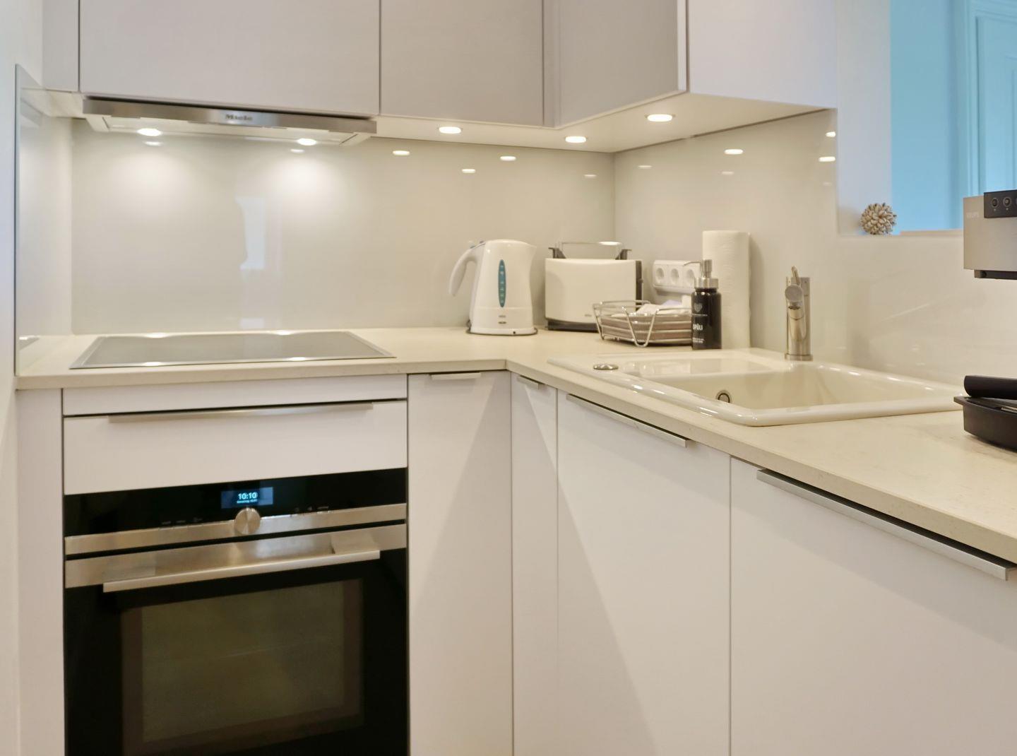 In der modernen Design-Küche erwartet Sie ein großer Miele-Kühlschrank, ein Herd mit Ceranfeld, Backofen/Mikrowelle sowie eine Miele-Spülmaschine, Nespresso-Maschine, Filterkaffeemaschine, Toaster, Eierkocher und Wasserkocher und natürlich eine komplette Küchenausstattung.